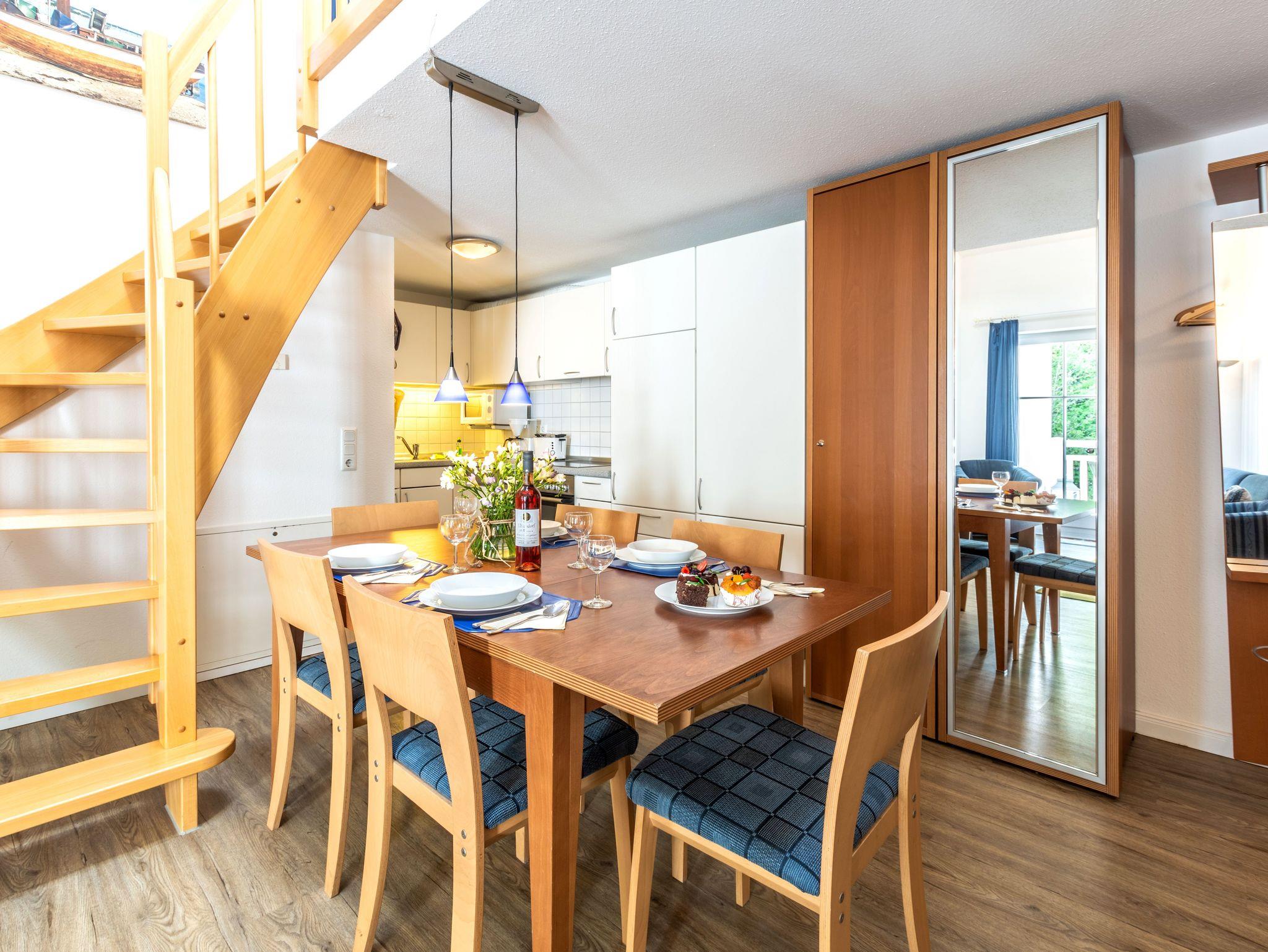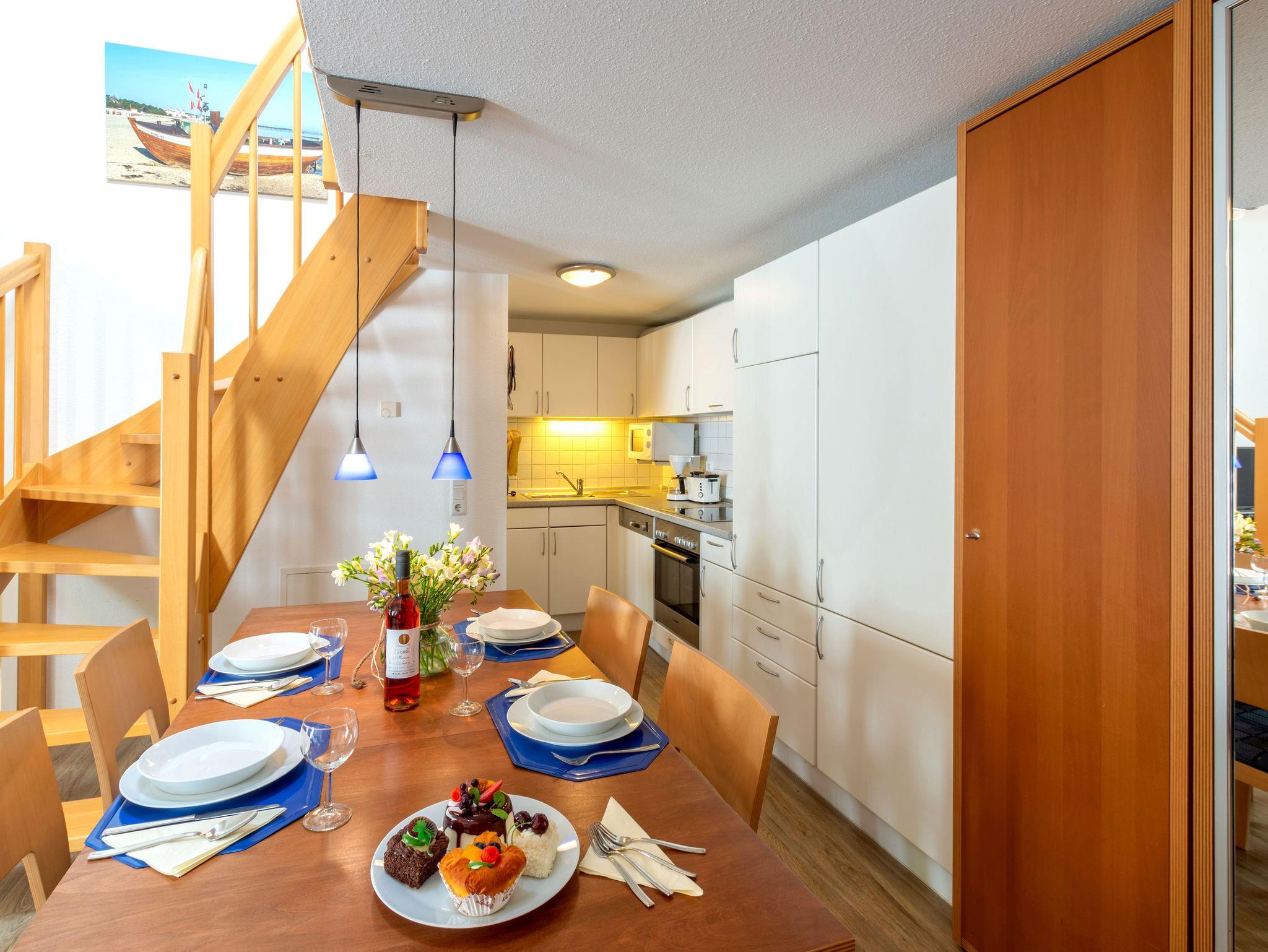 Die offene Wohnküche ist hell und vollständig ausgestattet. Ceran-Back-Herd, Geschirrspüler, Mikrowelle, Kaffeemaschine, Toaster und Wasserkocher stehen bereit, um köstliche Mahlzeiten zu zaubern. Am angrenzenden Essbereich lässt es sich in geselliger Runde genießen und plaudern.