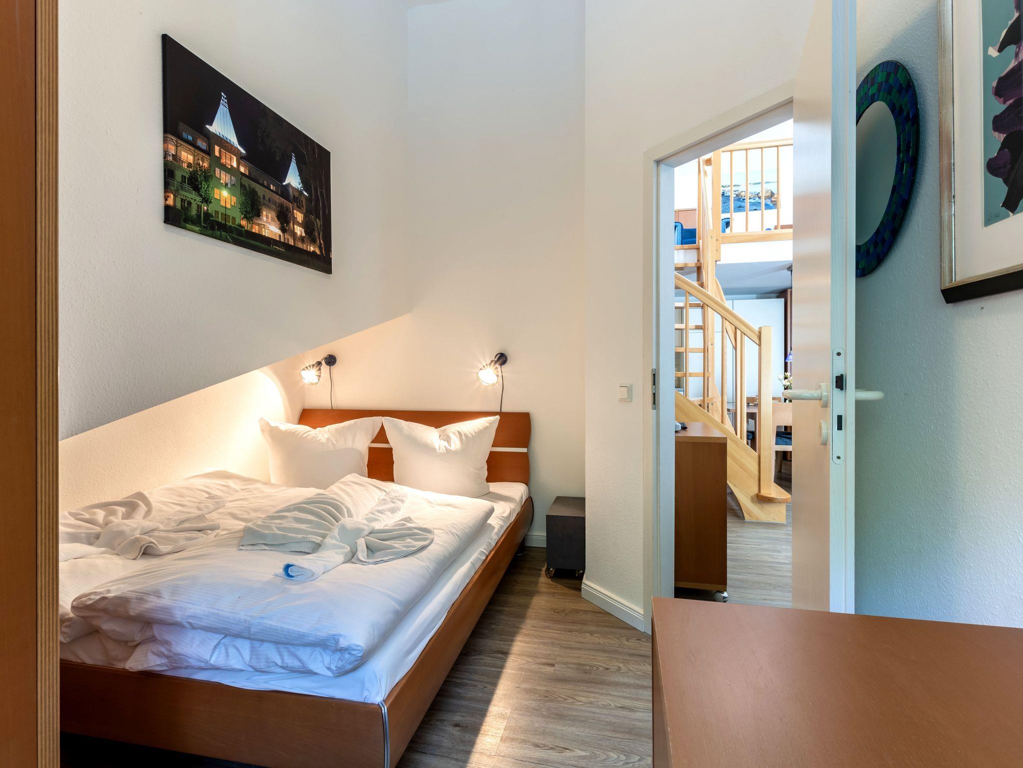 Ein Schlafzimmer ist mit einem Doppelbett und einem kleinen Kleiderschrank eingerichtet. In der Galerie befindet sich ein weiterer Schlafbereich mit Doppelbett sowie einem Kleiderschrank, der ausreichend Platz für Ihre Urlaubsgarderobe bietet.