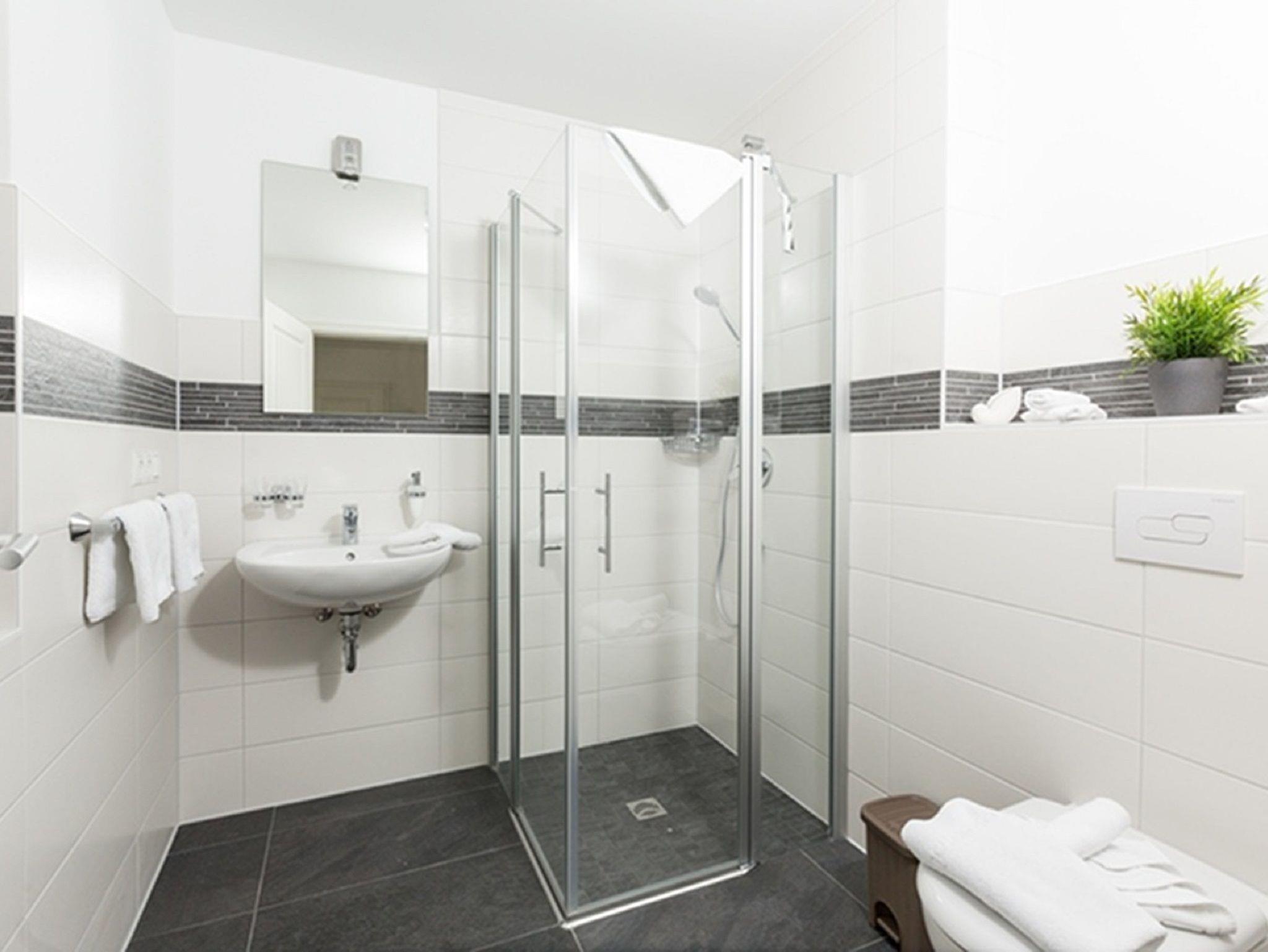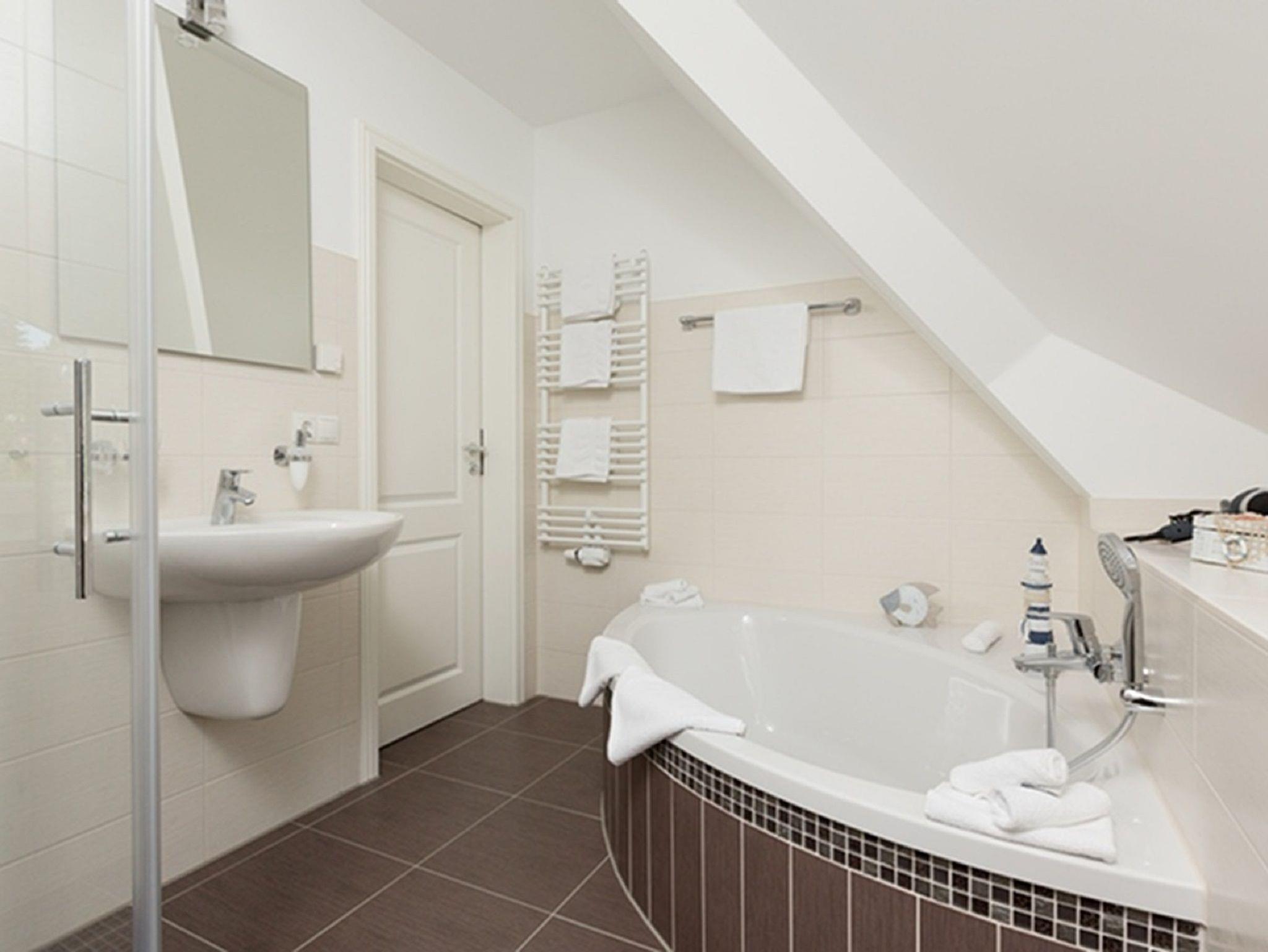 Ebenfalls im Obergeschoss finden Sie das große Badezimmer mit Dusche und Badewanne.