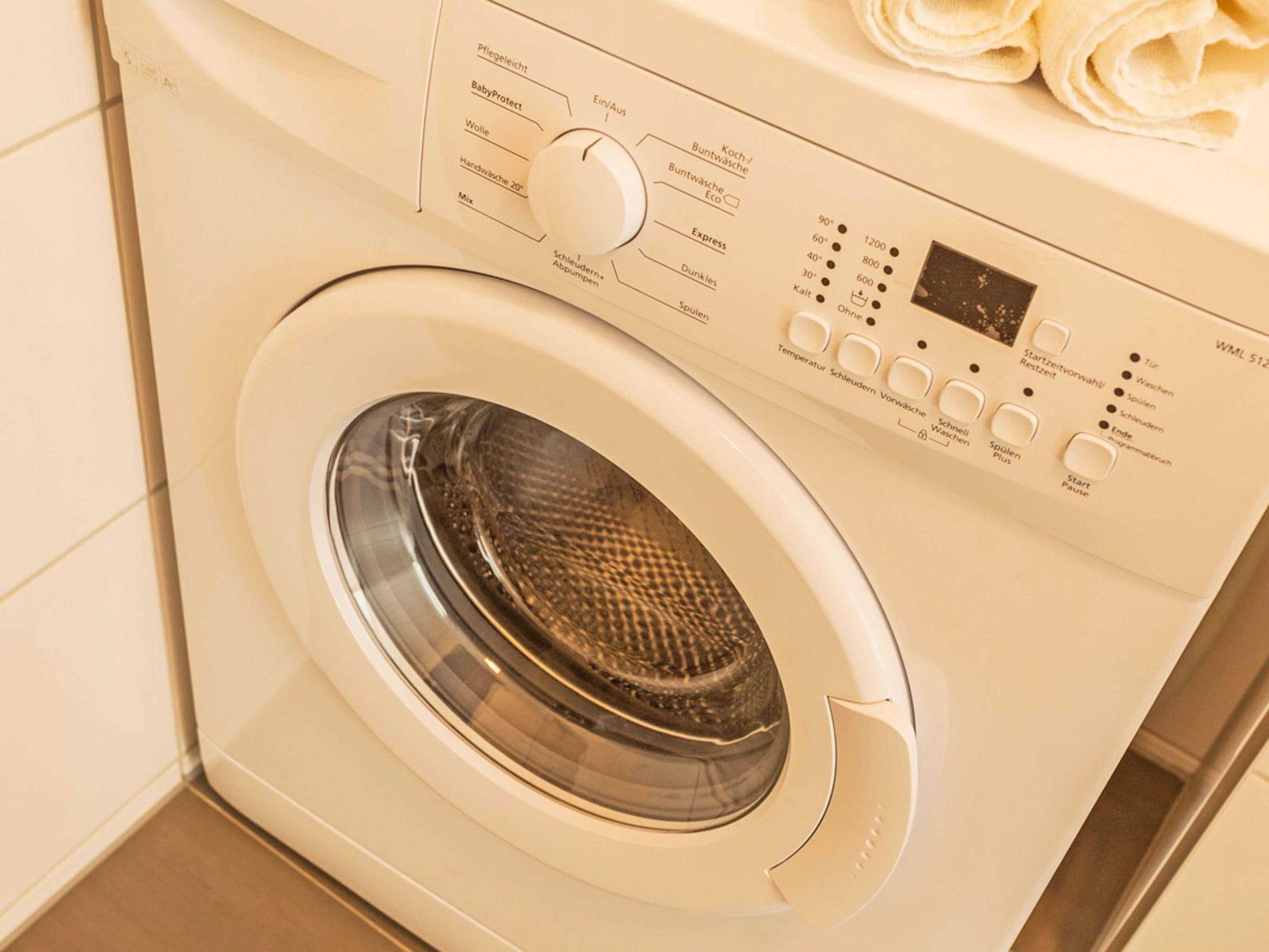 Das moderne Bad verfügt über eine ebenerdige Dusche, WC, ein Waschbecken mit großem Spiegel und Fön, einen elektrischen Handtuchtrockner und eine Waschmaschine.