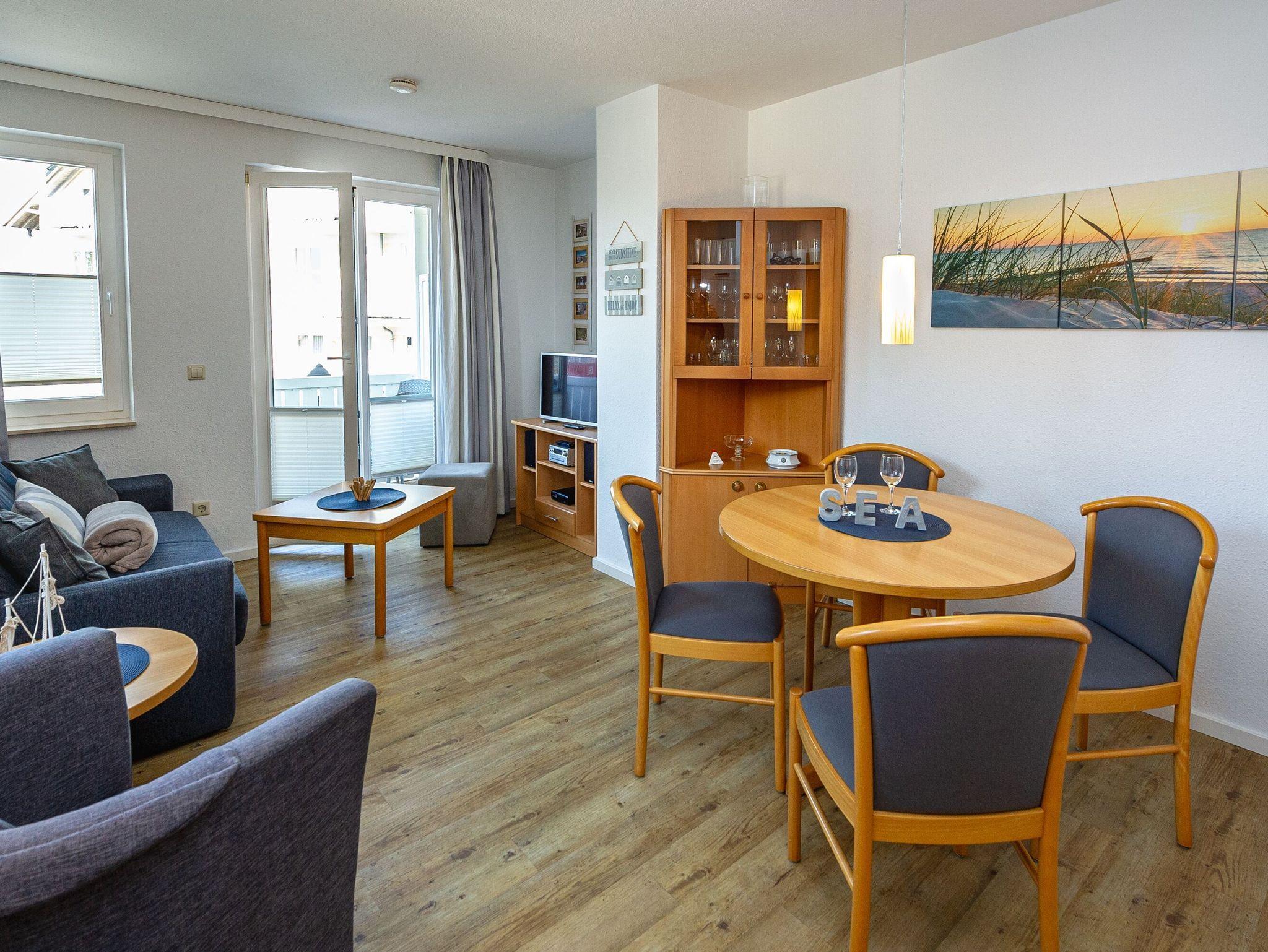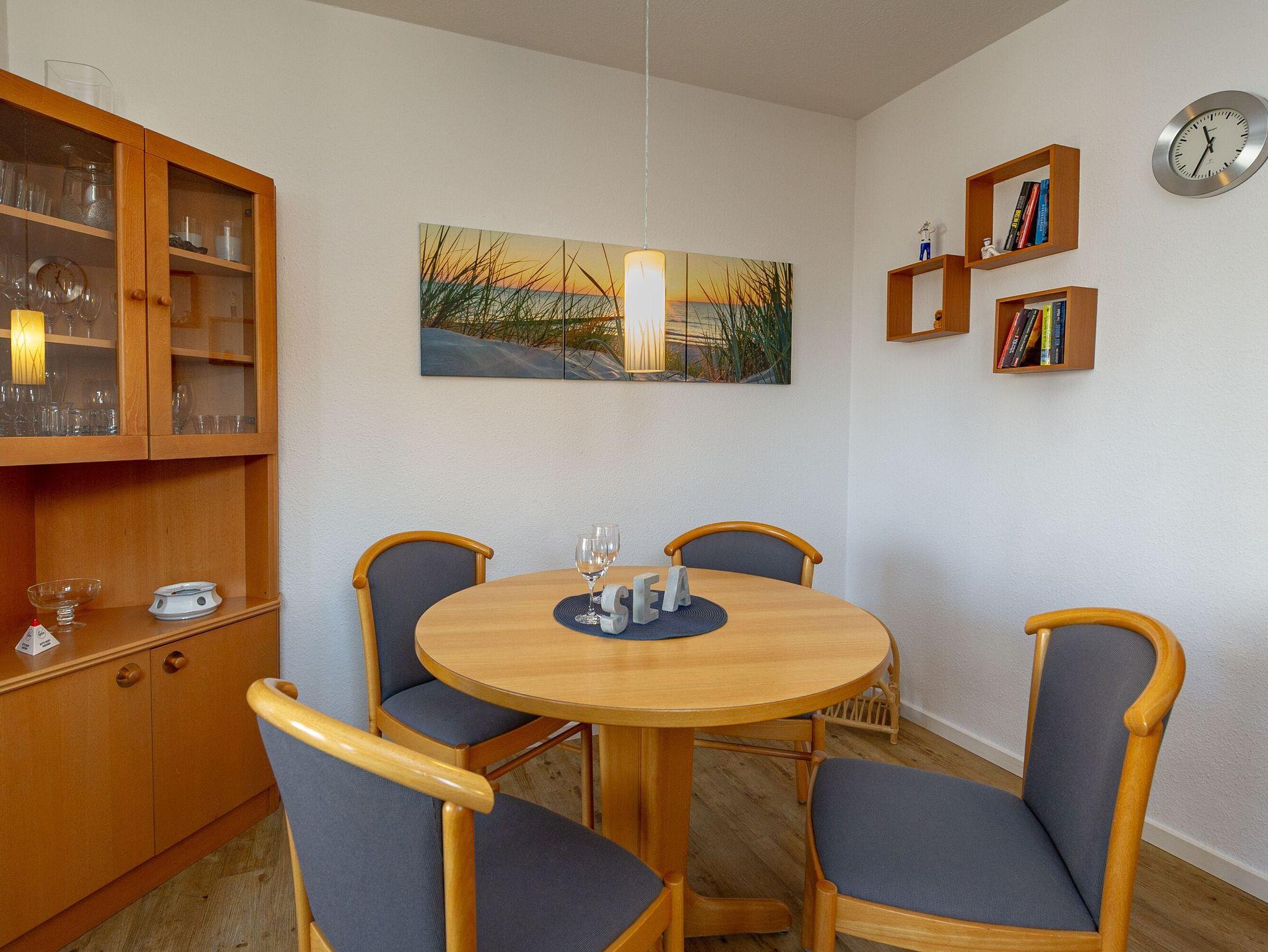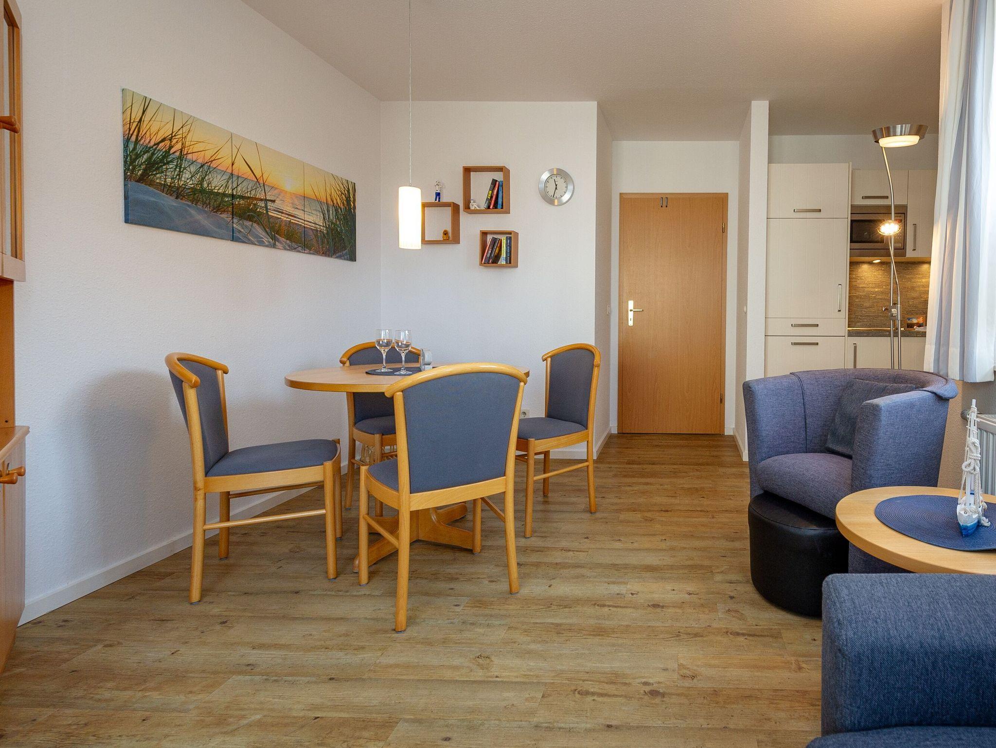 Das kombinierte Wohn-/Esszimmer ist gelungen in seine verschiedenen Funktionsbereiche unterteilt. Sie finden hier einen Esstisch, einen Sessel und eine bequeme Couch (Aufbettungsmöglichkeit für 1 Person), eine Mini-Stereoanlage mit CD-Player, einen Flachbild-TV und eine kleine Buchauswahl. Die moderne Küchenzeile bietet Ihnen u.a. einen geräumigen Kühlschrank mit Gefrierfach, ein 4-Zonen-Cerankochfeld, eine Mikrowelle sowie Wasserkocher, Kaffeemaschine, Toaster und diverses Kleininventar, das die Küchenausstattung komplettiert.