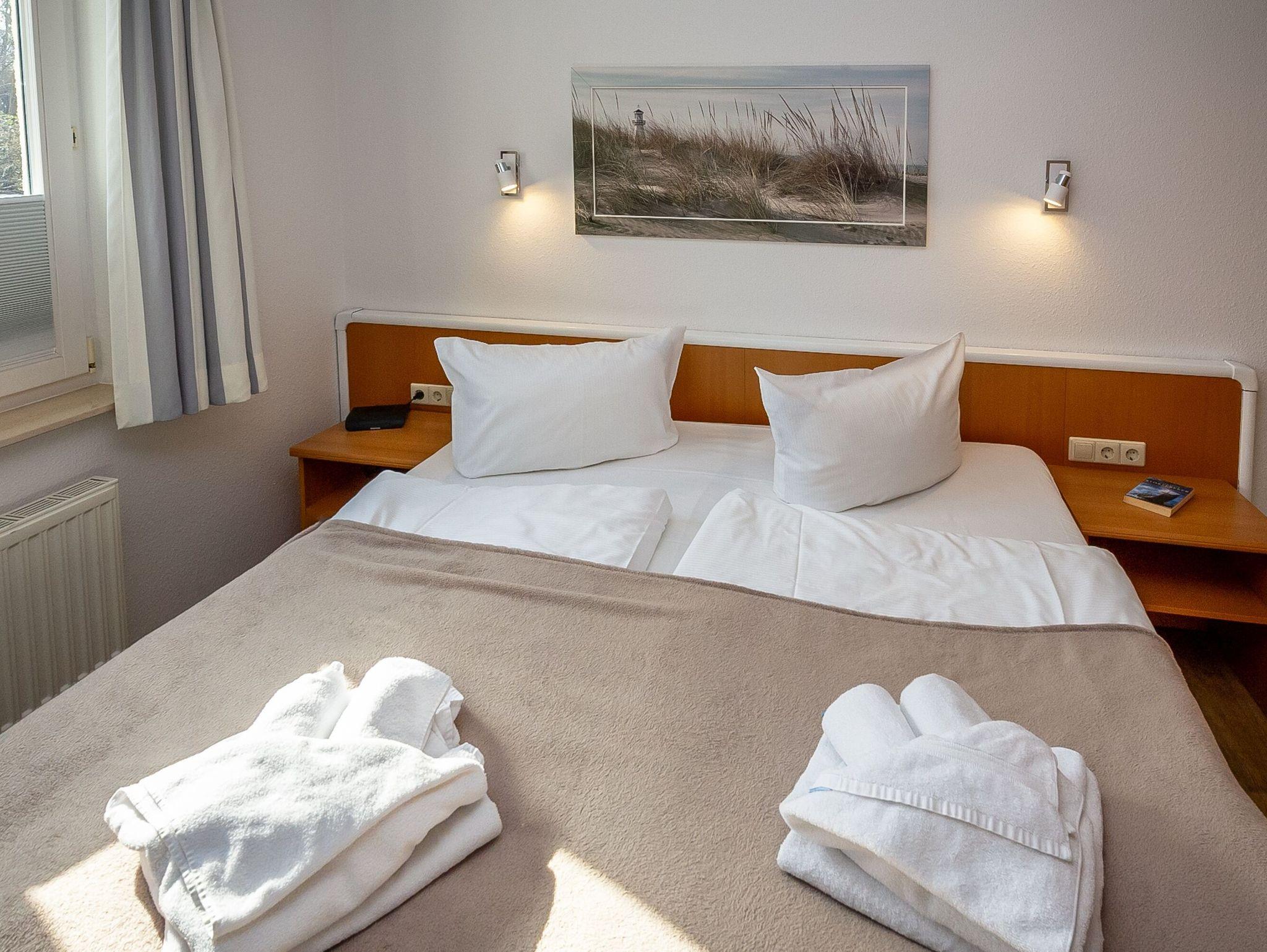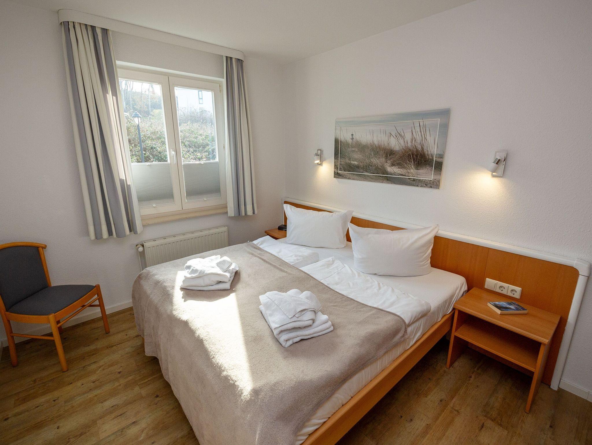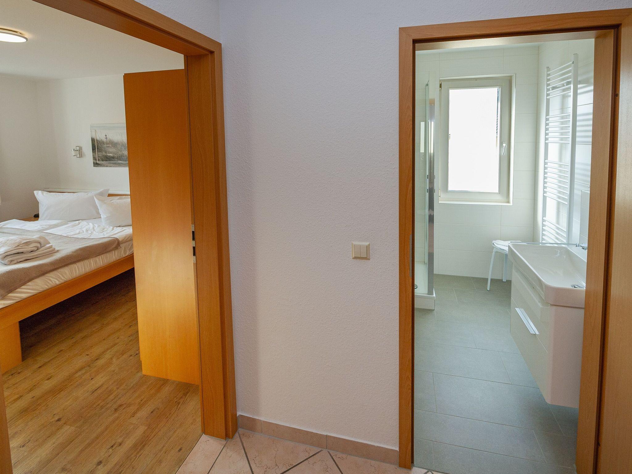 Weiterhin gibt es ein Schlafzimmer mit einem Doppelbett und einem Kleiderschrank für Ihre Urlaubsgarderobe sowie ein Tageslicht-Bad mit Dusche/WC, Waschtisch, Spiegel und Haartrockner.