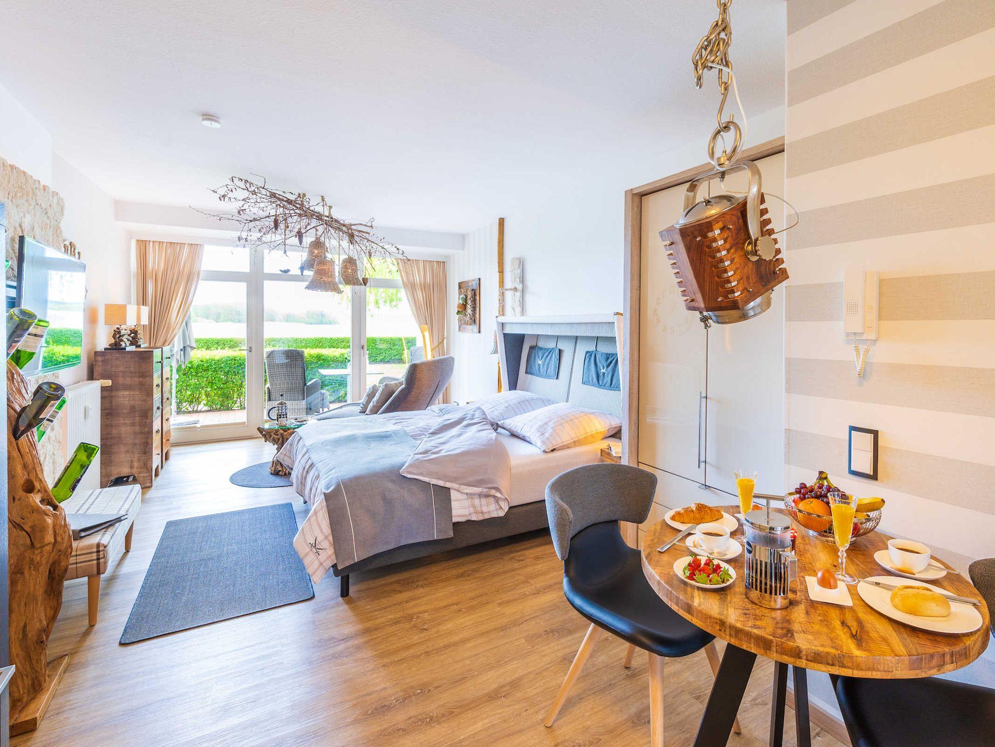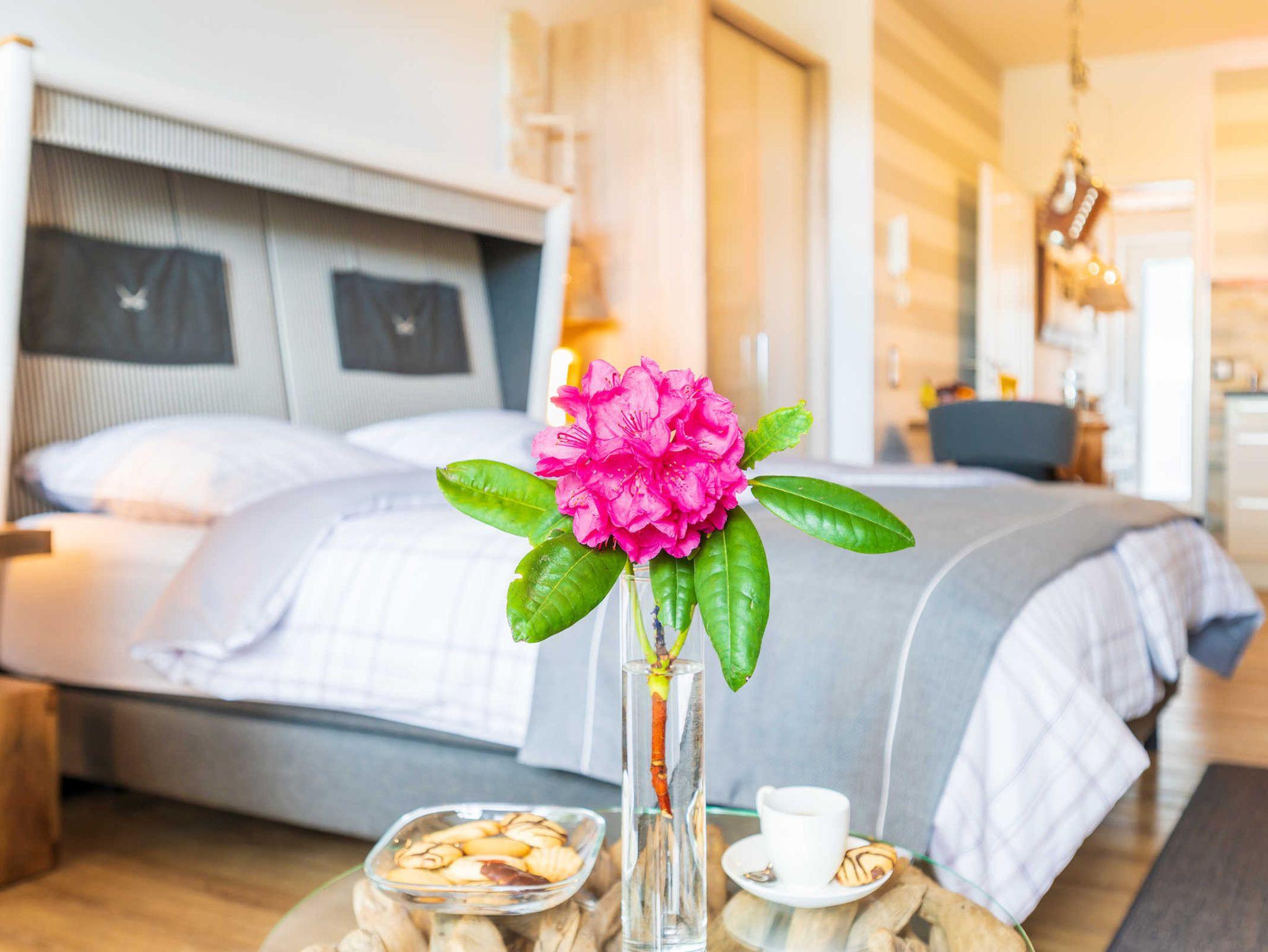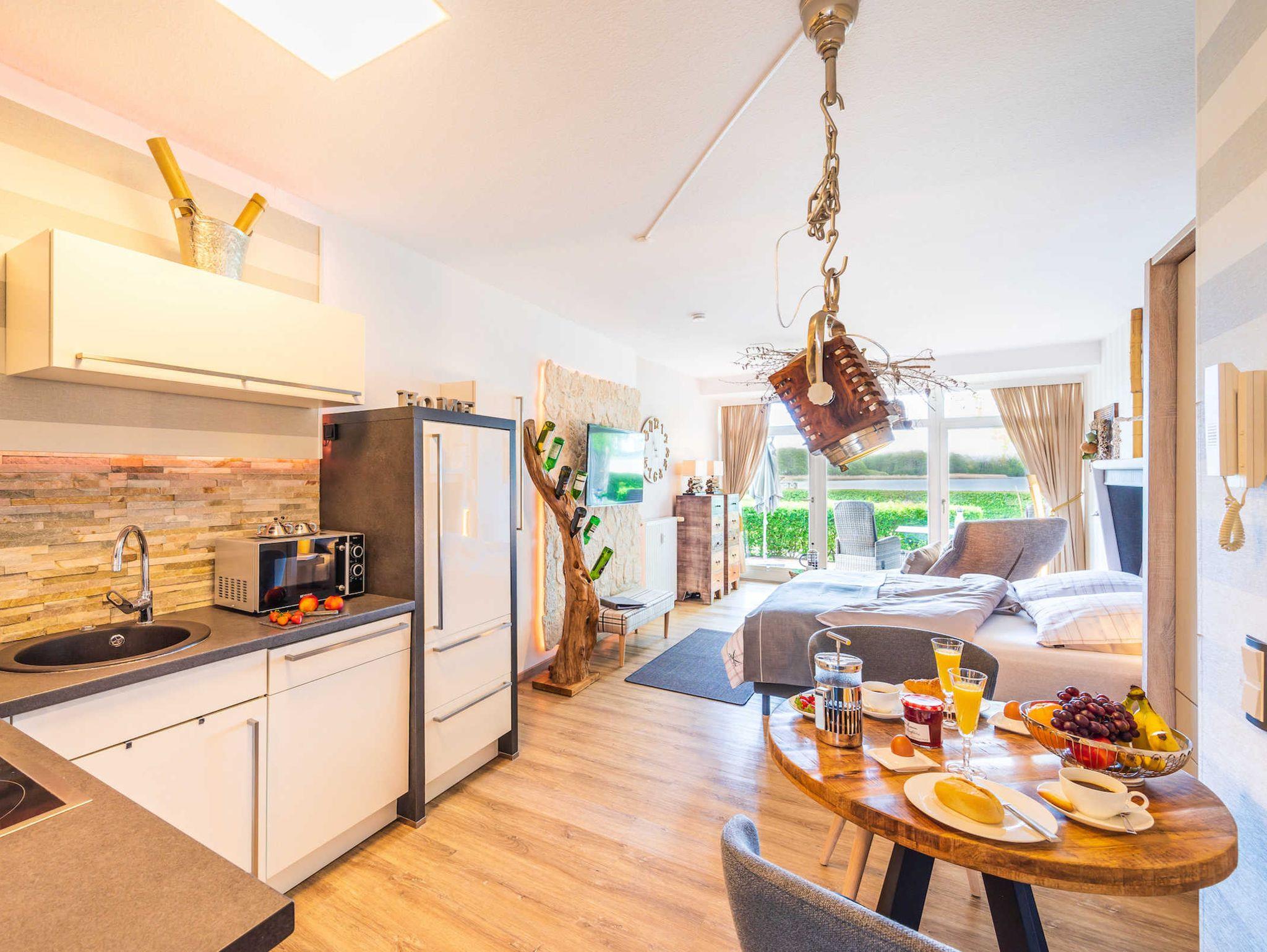 Die exklusive und mit viel Liebe eingerichtete Ferienwohnung ist lichtdurchflutet und verfügt über einen Wohnraum mit elektrisch verstellbarem Sitzmöbel, ein Sansibar-Boxspringbett (180 x 200 cm), einen 46-Zoll-LED-Fernseher, Kabel-TV, Digitalradio und kostenloses WLAN.