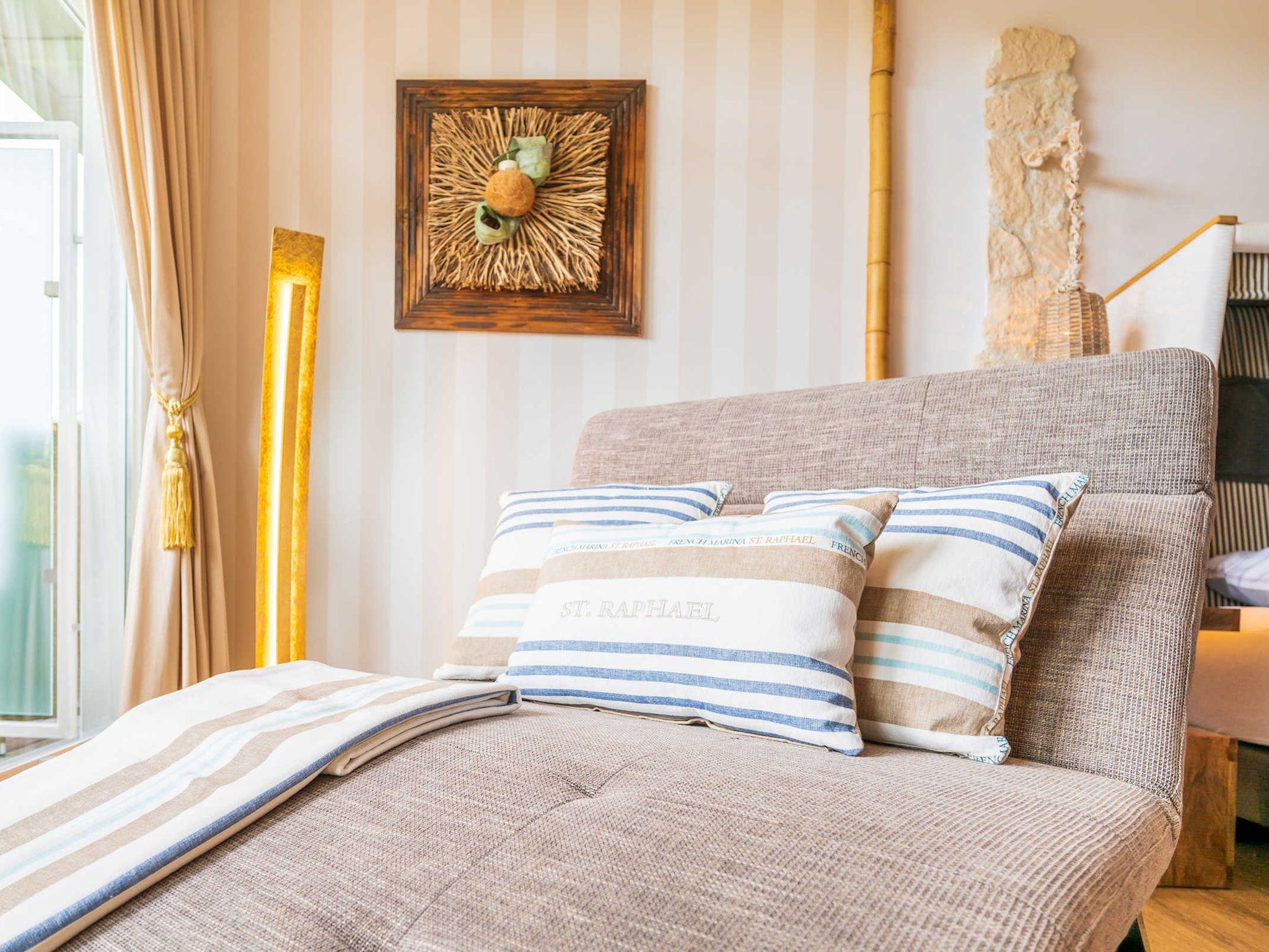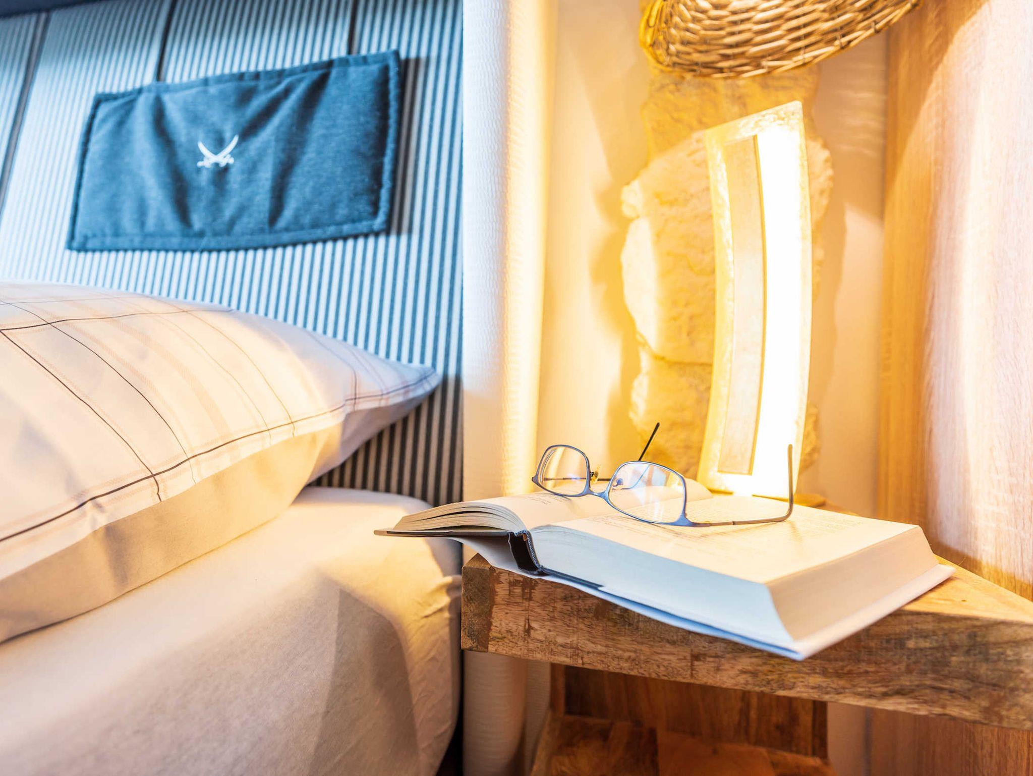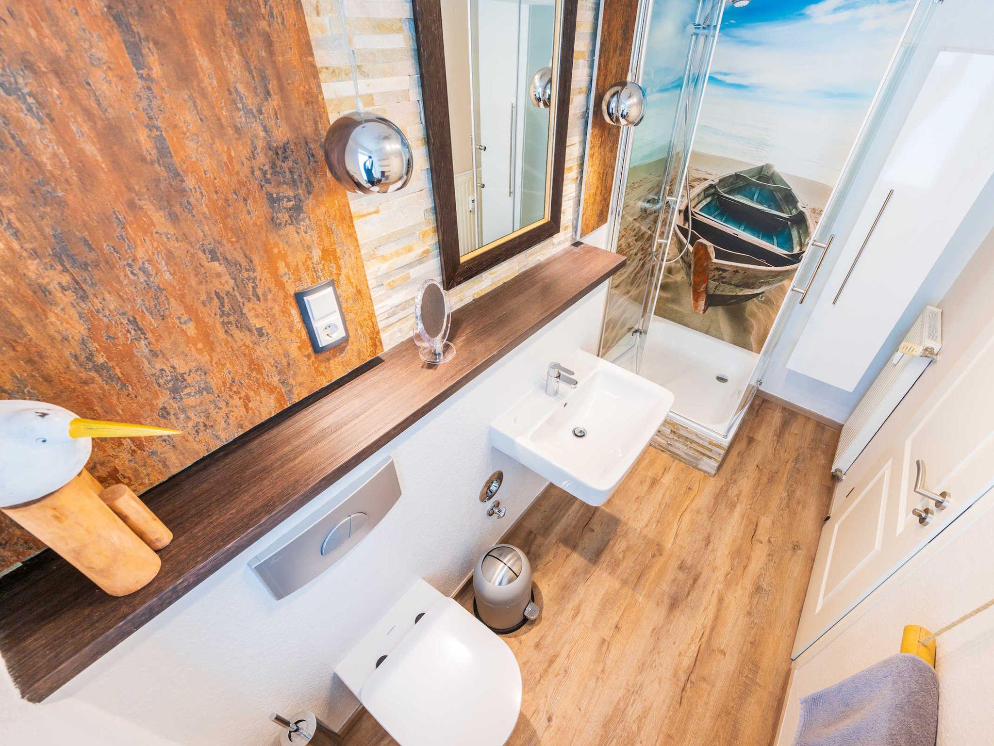 Die exklusive und mit viel Liebe eingerichtete Ferienwohnung ist lichtdurchflutet und verfügt über einen Wohnraum mit elektrisch verstellbarem Sitzmöbel, ein Sansibar-Boxspringbett (180 x 200 cm), einen 46-Zoll-LED-Fernseher, Kabel-TV, Digitalradio und kostenloses WLAN.