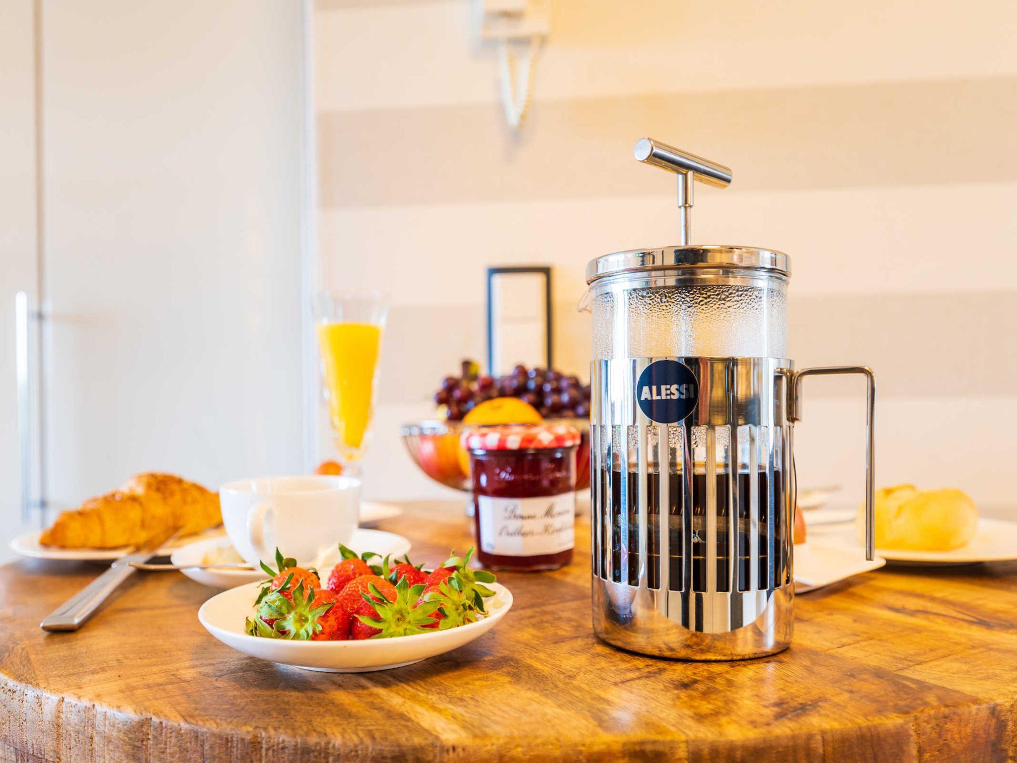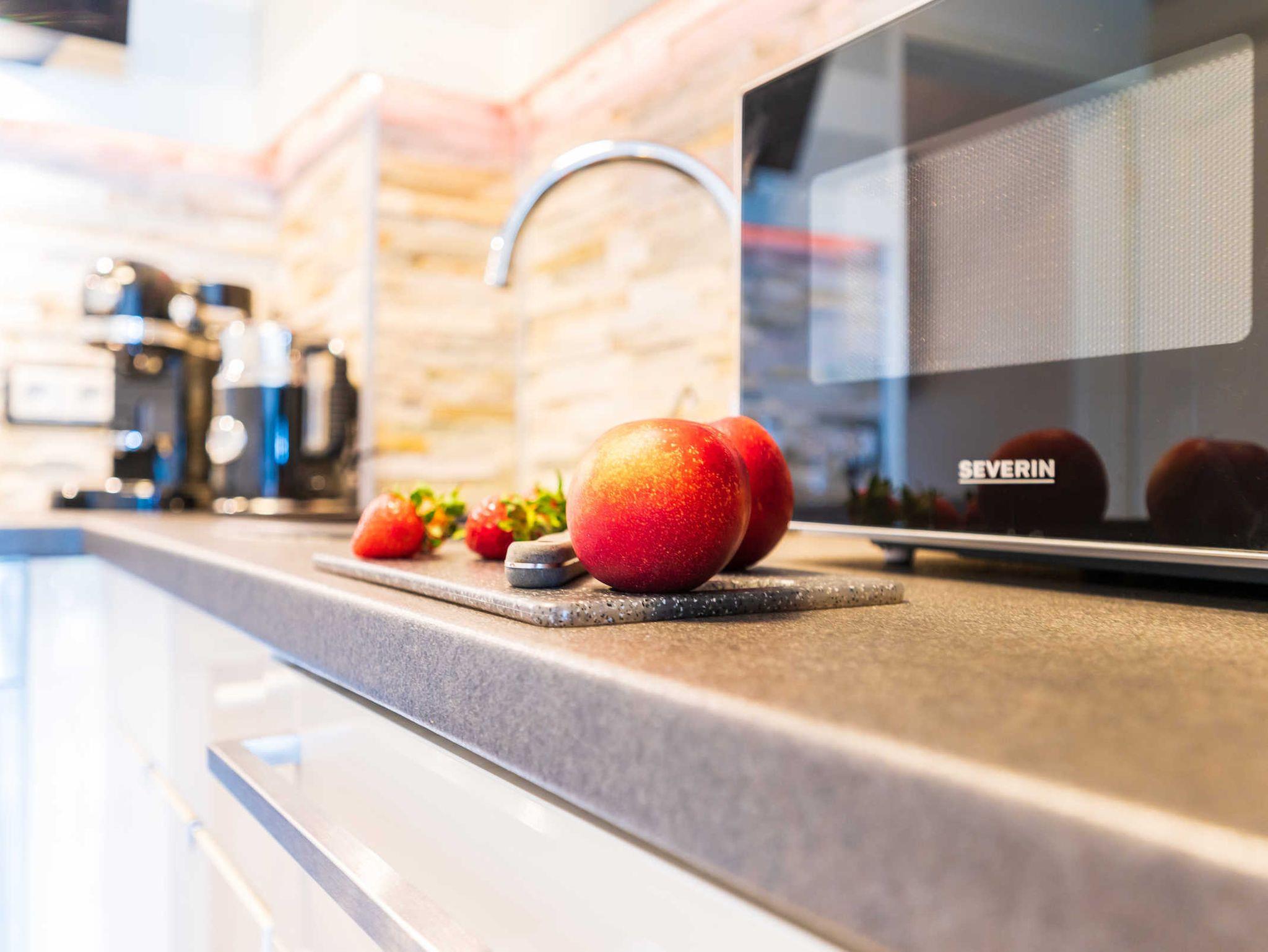 An den Wohnbereich grenzt eine sehr gut eingerichtete Küchenzeile mit Essplatz an (Geschirrspüler, Kühlschrank mit Gefrierfach, Cerankochfeld, Backofen, Mikrowelle, KitchenAid Nespressomaschine mit integriertem Milchaufschäumer, zusätzlicher Alessi-Pressfilter, Toaster, Wasserkocher, hochwertiges Porzellan, vollständiges Kaffeeservice etc.).