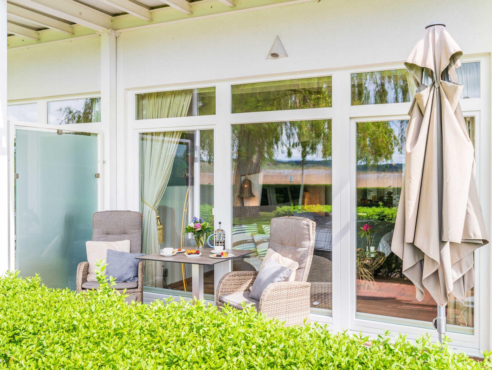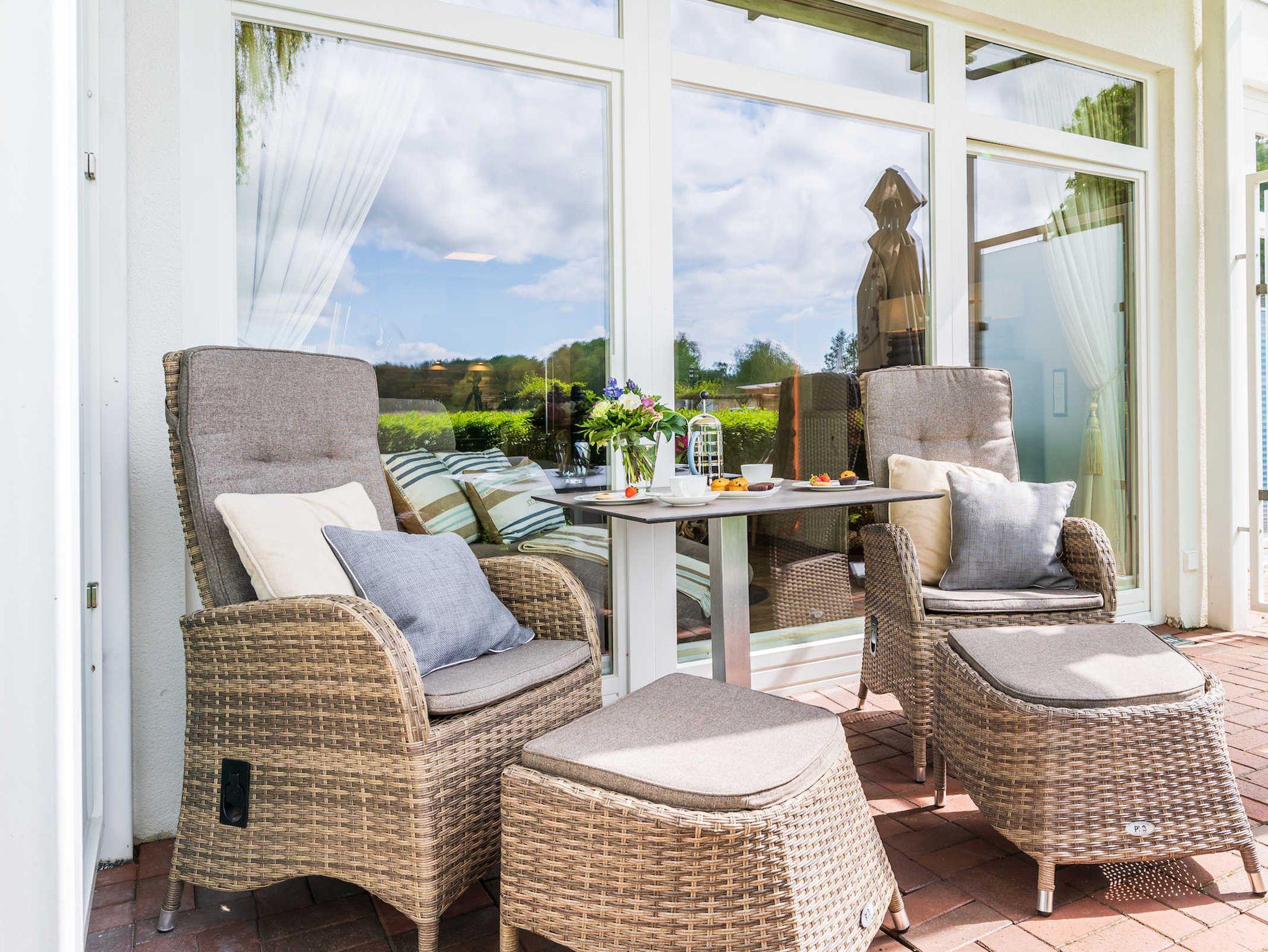 Darüber hinaus hat die Wohnung ein schönes Duschbad mit Fön, Kosmetikspiegel und eine Südterrasse (hochwertige, in der Sitzposition verstellbare Rattansessel von Ploß mit Fußauflage, Tisch und Sonnenschirm) u.v.a.m.