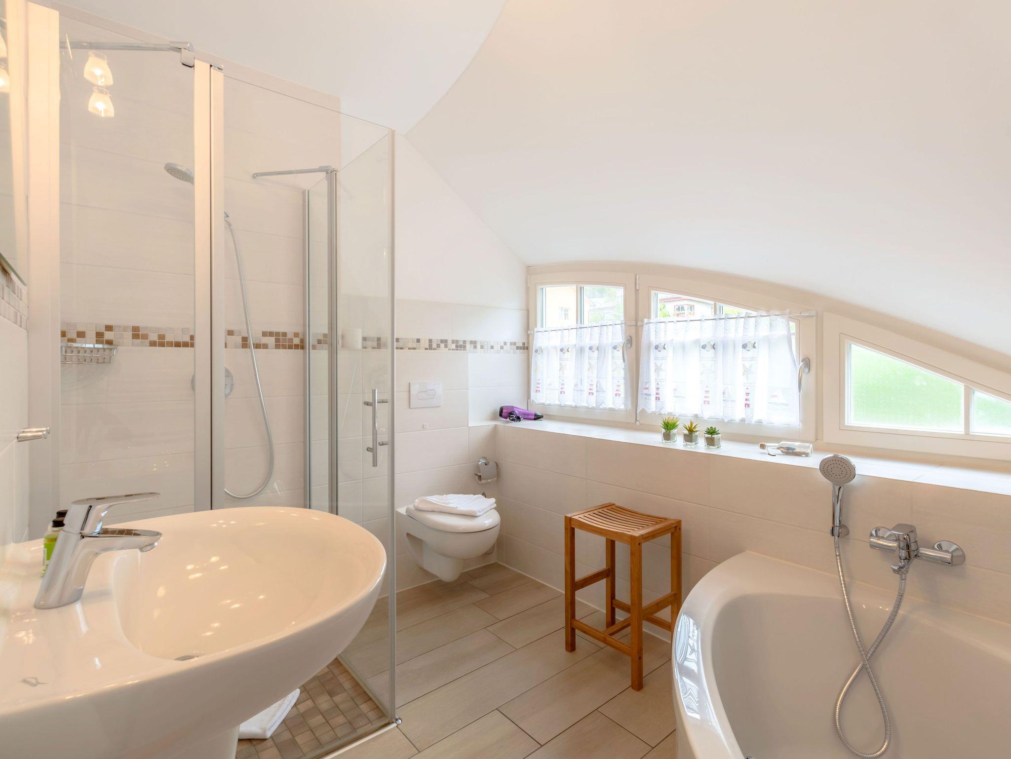 Im Obergeschoss ist ein weiteres Bad mit Fenster, ebenerdiger Dusche, WC und zusätzlich eine Eckbadewanne und Handtuchtrockner.