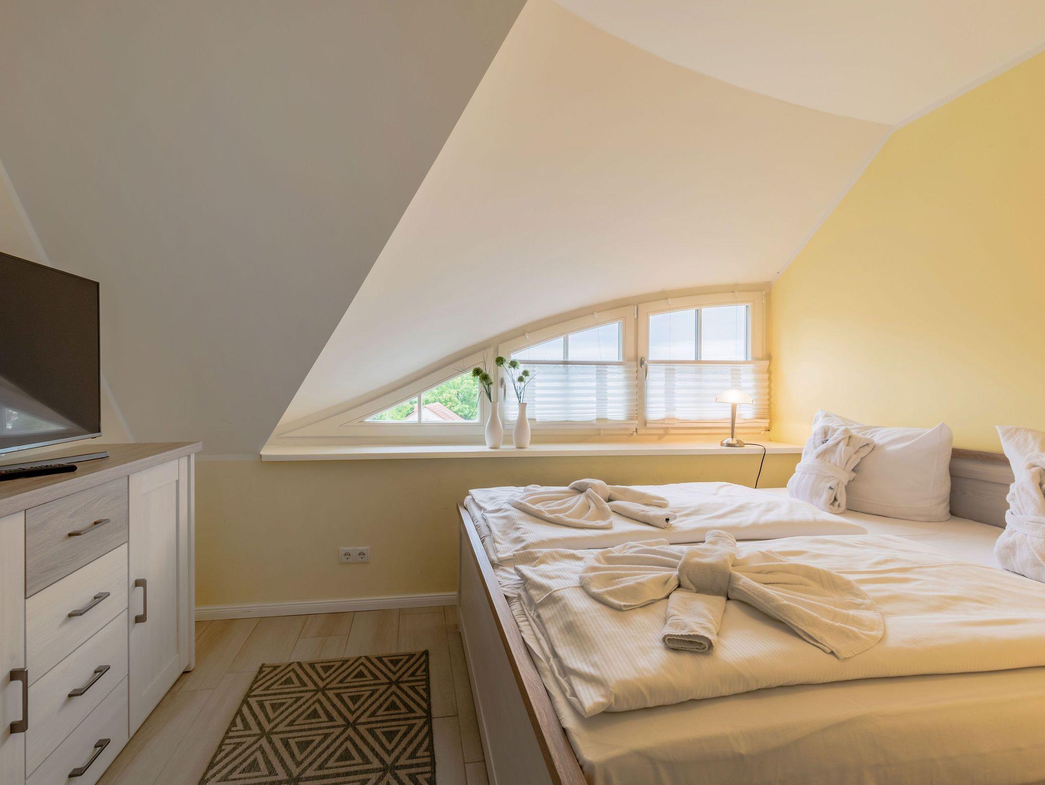 Angrenzend sind drei Schlafzimmer. Das erste Schlafzimmer besteht aus Doppelbett, Kommode, Drehspiegel- und Regal, Nachttischkästchen und TV. Das zweite Schlafzimmer besteht aus Doppelbett, zwei Kleiderschränken, zwei Nachttischkästchen und einer Kommode. Das dritte Schlafzimmer besteht aus zwei Einzelbetten, zwei Kleiderschränken, zwei Nachttischkästchen und TV. Letzteres ist ideal für Freunde oder Kinder. Alle Betten verfügen über eine Vierjahreszeitenbettdecke und Lattenroste die auf Härtegrad und Kopfneigung individuell und leicht einstellbar sind.