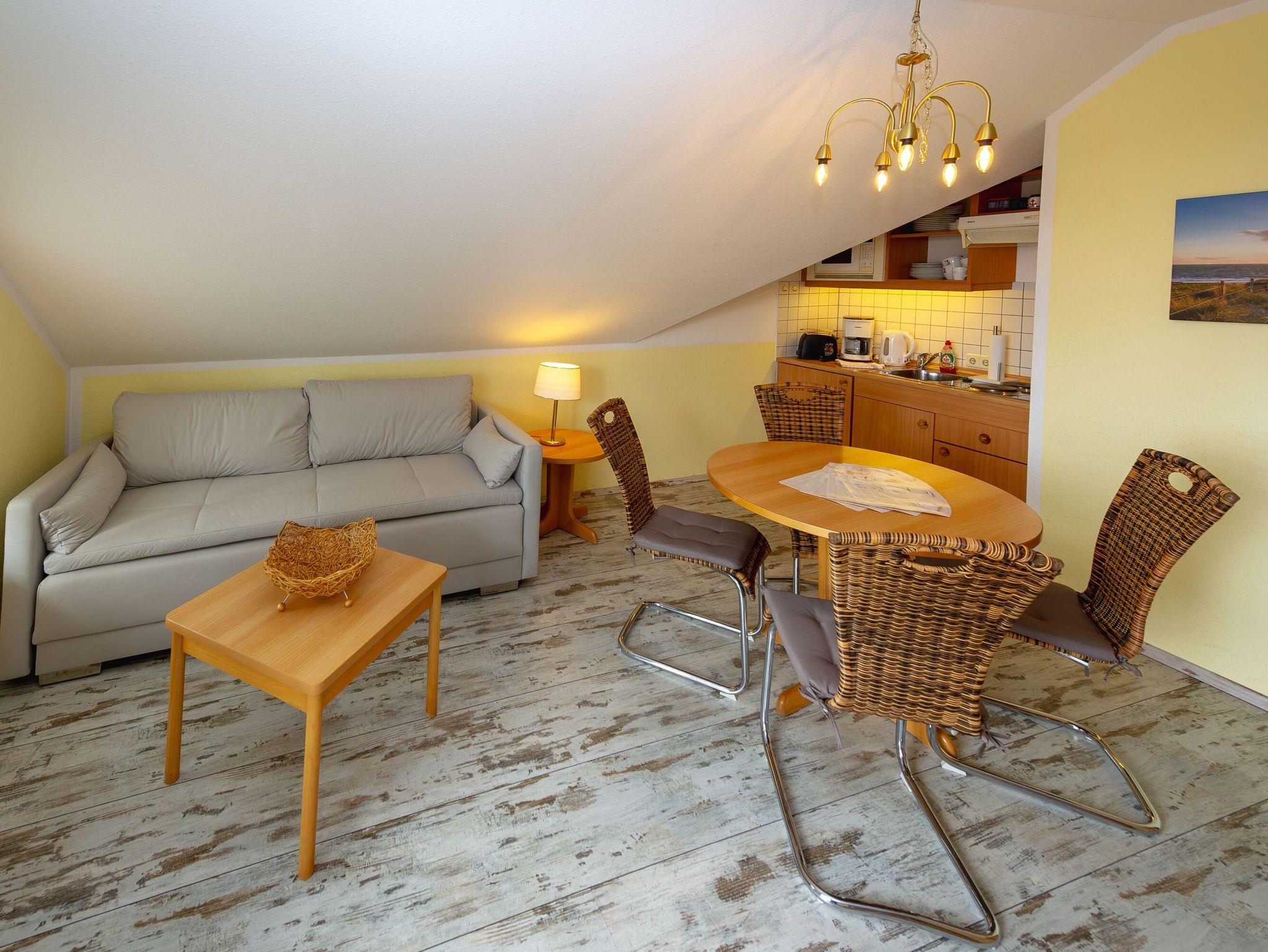 Der helle, freundliche Wohnraum verfügt über einen Esstisch, einen Sessel und eine Schlafcouch, die als Aufbettung für zwei Personen genutzt werden kann, eine Mini-Stereoanlage mit Radio/CD-Player, einen Flachbild-TV und eine im Wohnbereich harmonisch integrierte Küchenzeile. Diese ist ausgestattet mit einem Kühlschrank mit Gefrierfach, einer Mikrowelle, einem 2-Platten-Herd sowie Wasserkocher, Kaffeemaschine, Toaster und diversem Kleininventar, das die Küchenausstattung komplettiert.