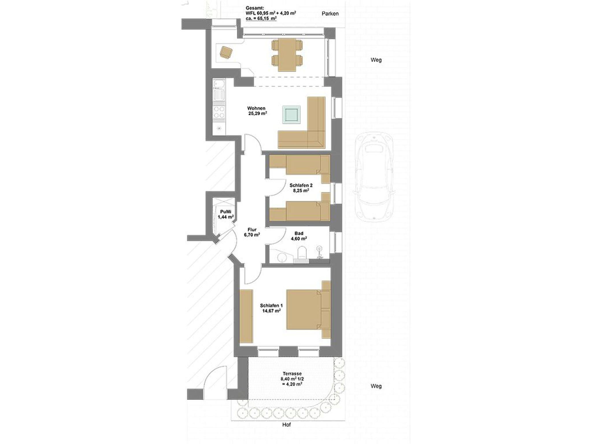 Unser freundliches 3-Zimmer Apartment Nr. 14 im Erdgeschoß bietet Platz für 4 Personen (zuzüglich Aufbettung für ein Kleinkind bis 2 Jahre).