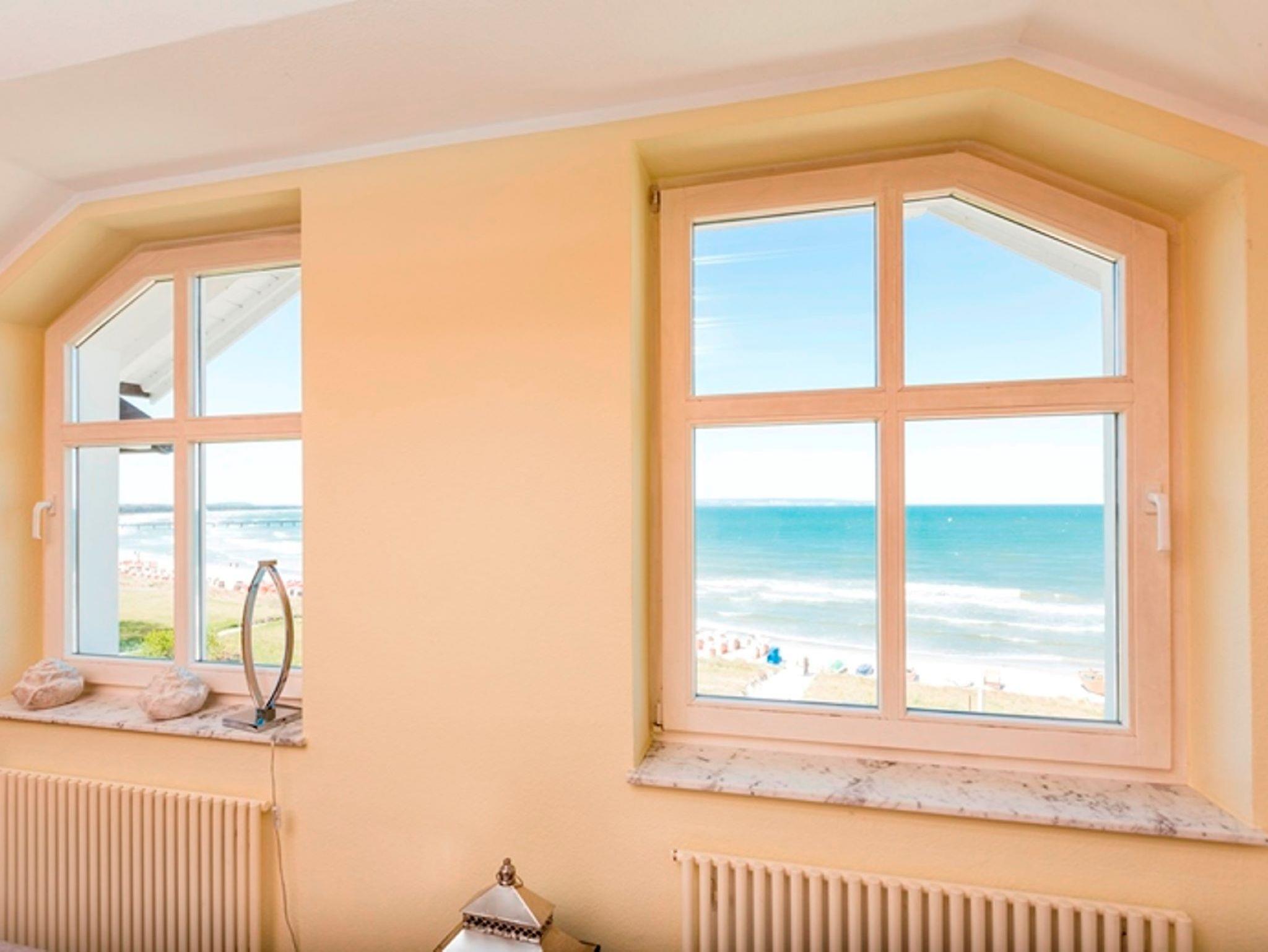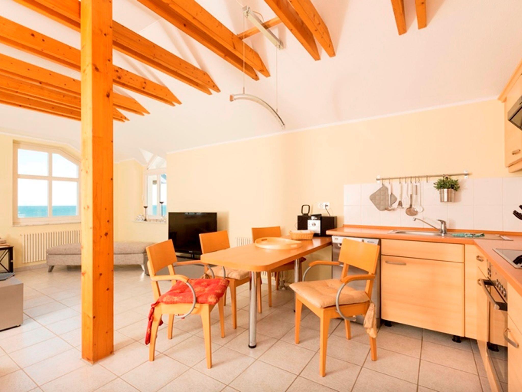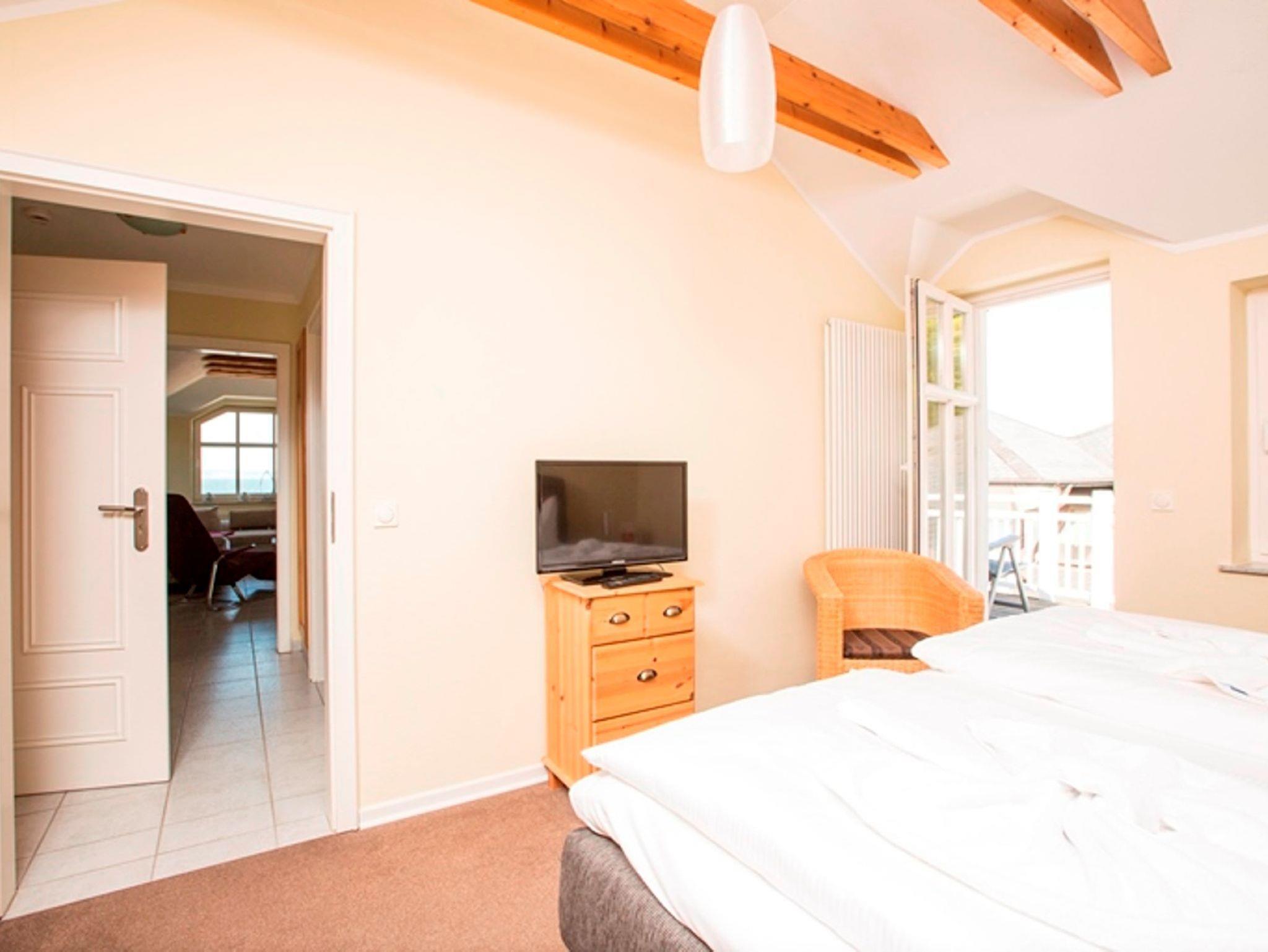 Das großzügige Wohn- und Esszimmer ist lichtdurchflutet und mit einer gemütlichen Sitzecke, einem Schlafsofa sowie einer komplett ausgestatteten Küchenzeile (inkl. E-Herd mit Ceranfeld) eingerichtet. Das separate Schlafzimmer mit komfortablem Boxspringbett ist zur ruhigen Waldseite der Granitz ausgerichtet und bietet Zugang zu einem seitlichen Balkon ? hier genießen Sie traumhaften Ostseeblick und die warme Mittagssonne.
