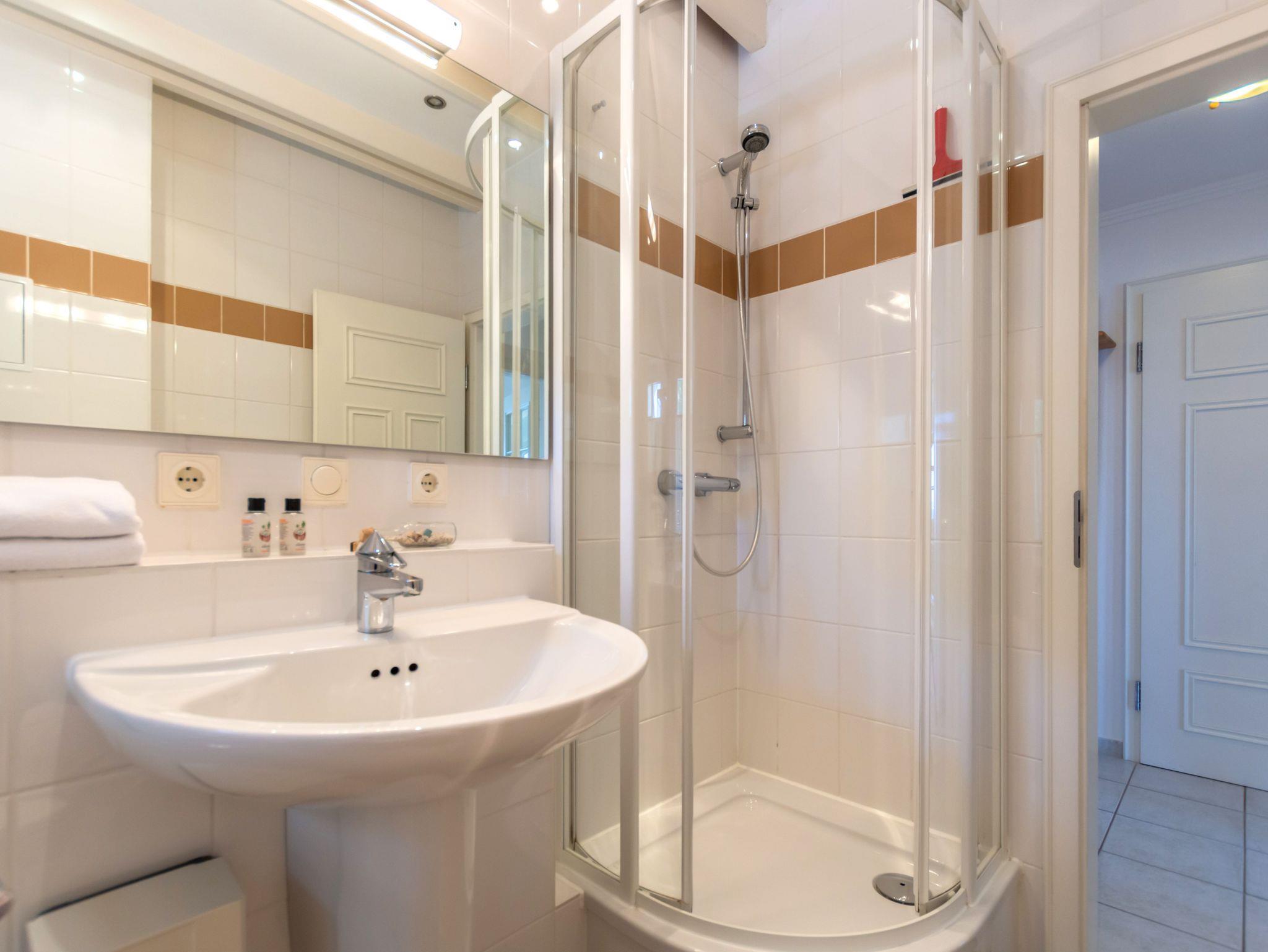 Das moderne Badezimmer mit Fenster ist großzügig ausgestattet und verfügt sowohl über eine Eckdusche als auch über eine Badewanne ? perfekt für entspannende Stunden nach einem Strandtag.