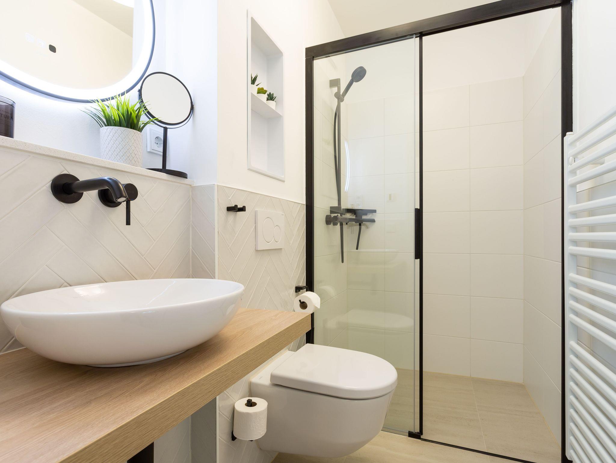 Das sonderangefertigte Inventar der Bäder (5,38 m² und 3,21 m²) ist erstklassig und besticht durch seine Optik.