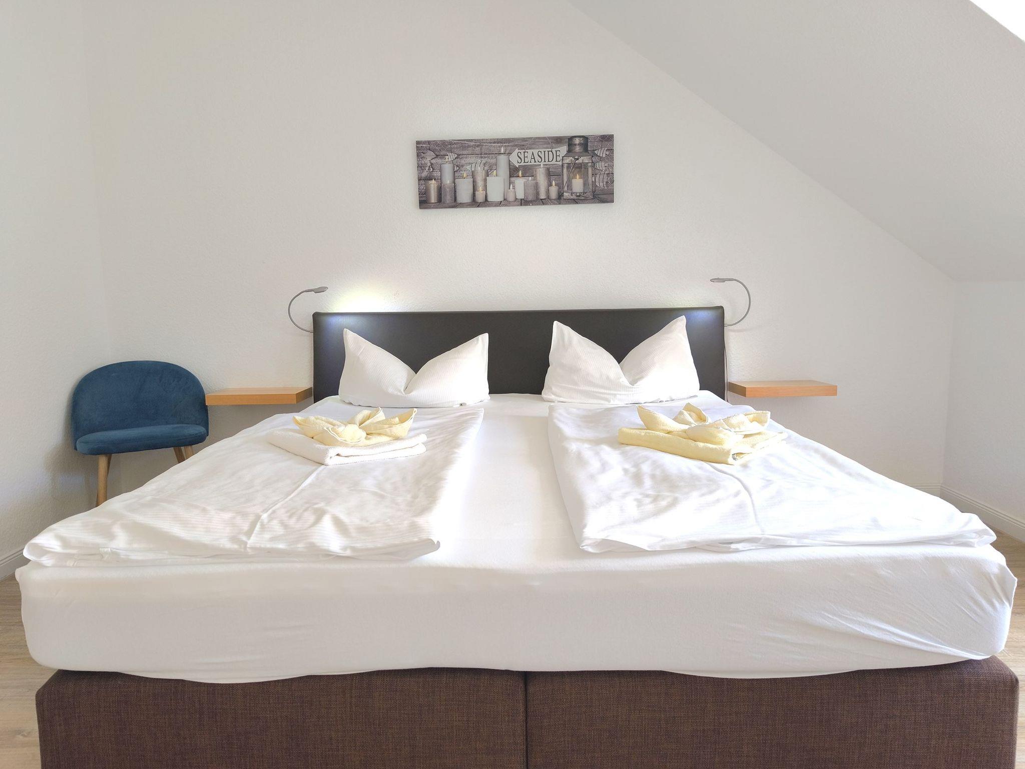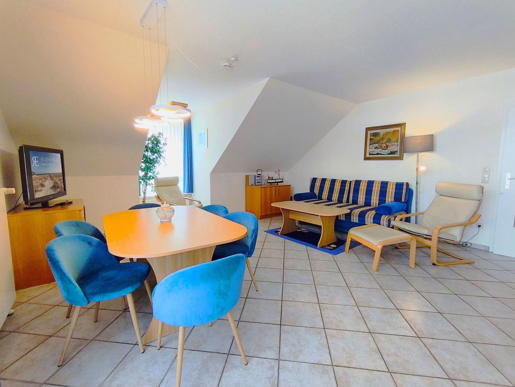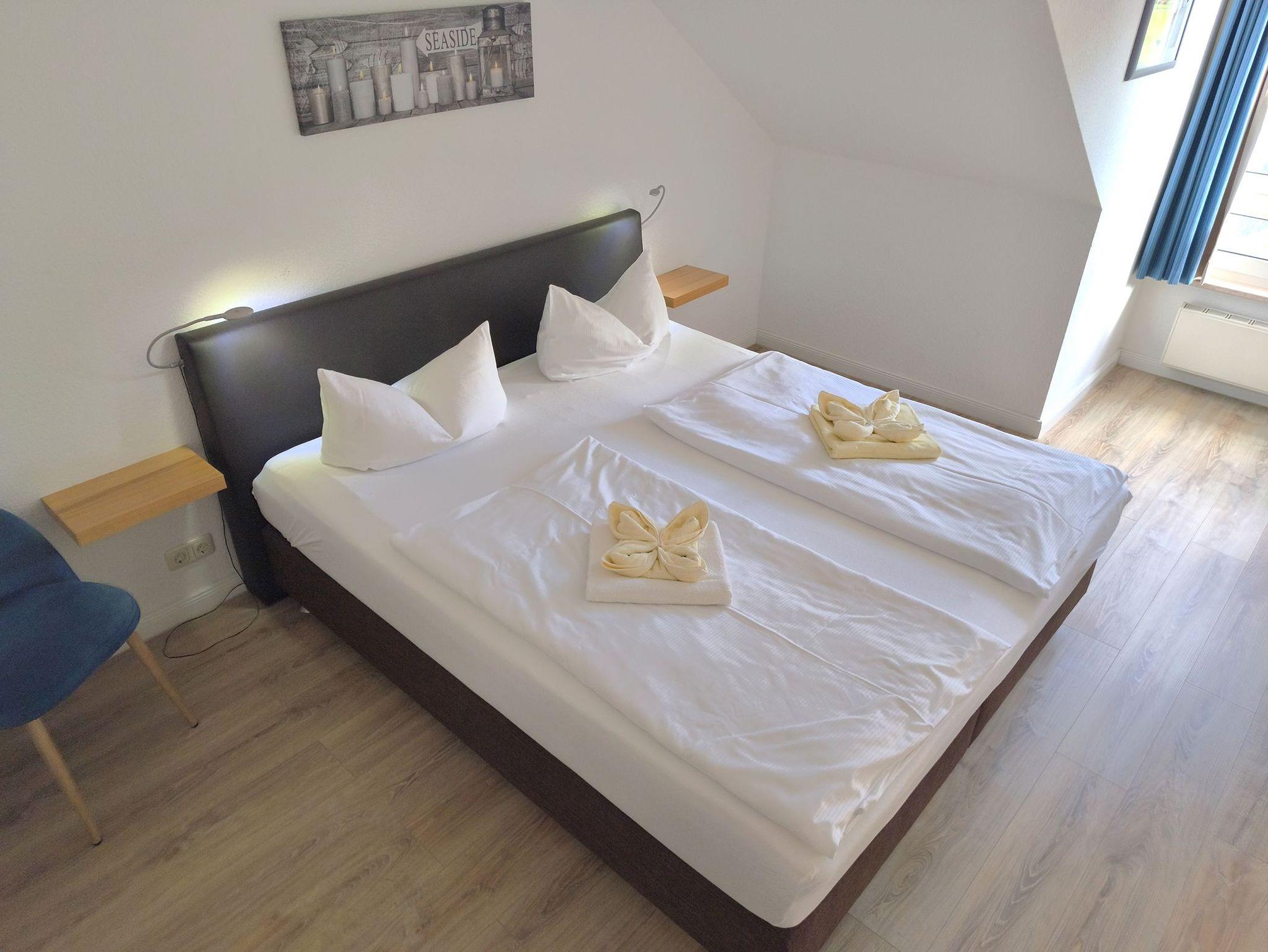 Die Ferienwohnung Nr. 19 befindet sich im Dachgeschoss und bietet mit rund 68 m² genügend Raum für Familien und kleine Gruppen. Der Wohnbereich ist großzügig geschnitten und verbindet Sitzecke, Essplatz und Küchenzone zu einem hellen Mittelpunkt, von dem aus Sie Zugang zum Balkon haben. Zwei getrennte Schlafzimmer, eines mit Doppelbett, eines mit zwei Einzelbetten, sorgen für klare Rückzugsmöglichkeiten und Privatsphäre. Die Küche ist vollständig ausgestattet und eignet sich sowohl für einfache Mahlzeiten als auch für längere Aufenthalte. Das Bad ist funktional und gepflegt. WLAN, ein eigener Stellplatz in der Tiefgarage sowie kurze Wege zu allen Gemeinschaftseinrichtungen der Anlage runden das Gesamtbild ab. Die Wohnung ist ideal für Gäste, die Wert auf Platz, Ruhe und Komfort legen, ohne überflüssige Extras zu benötigen.
