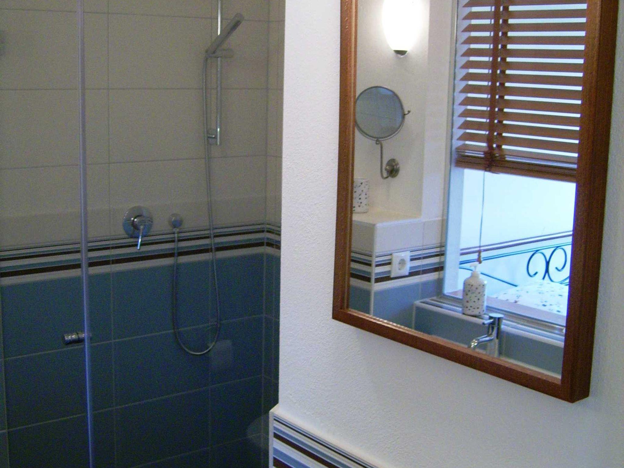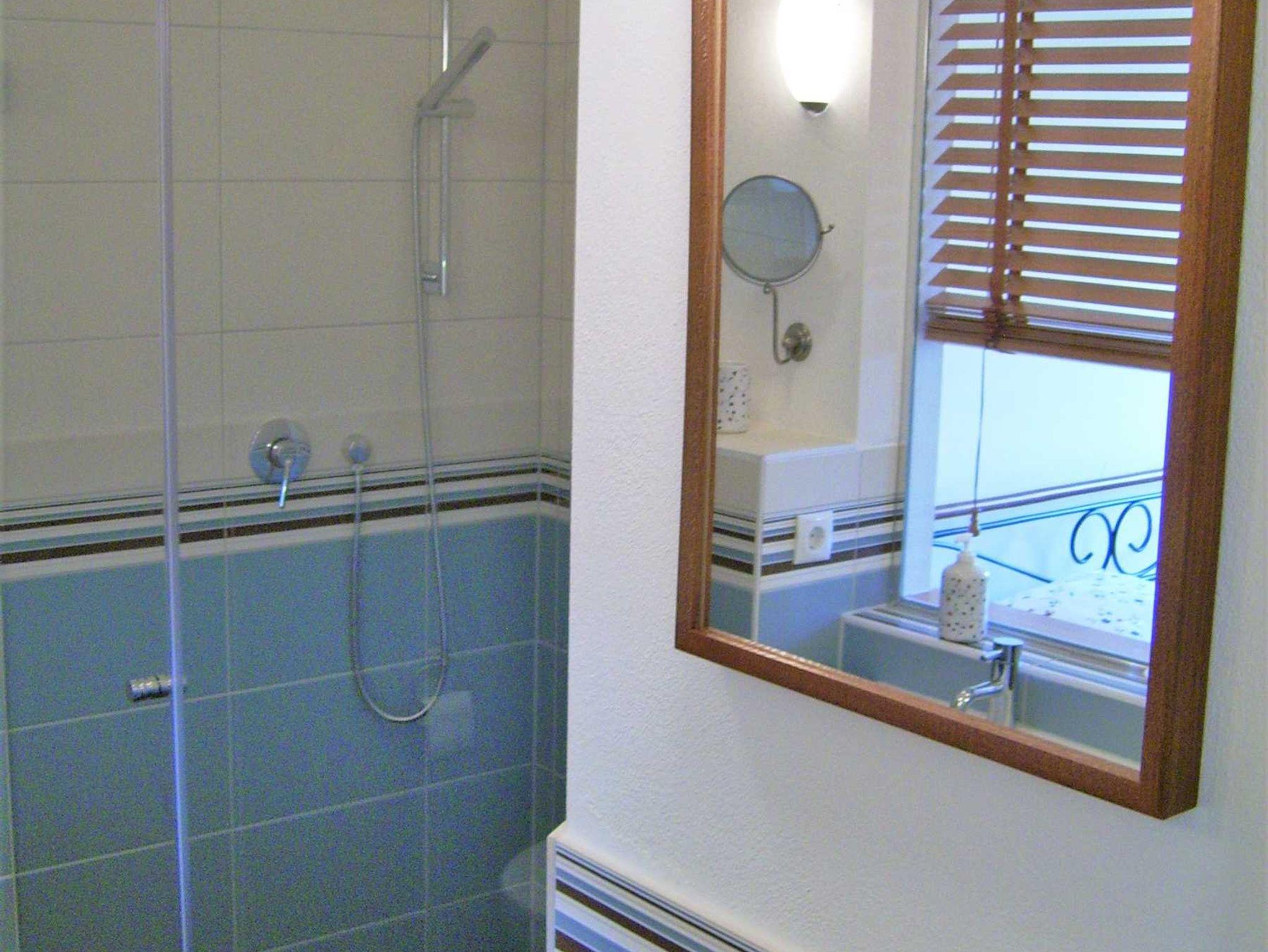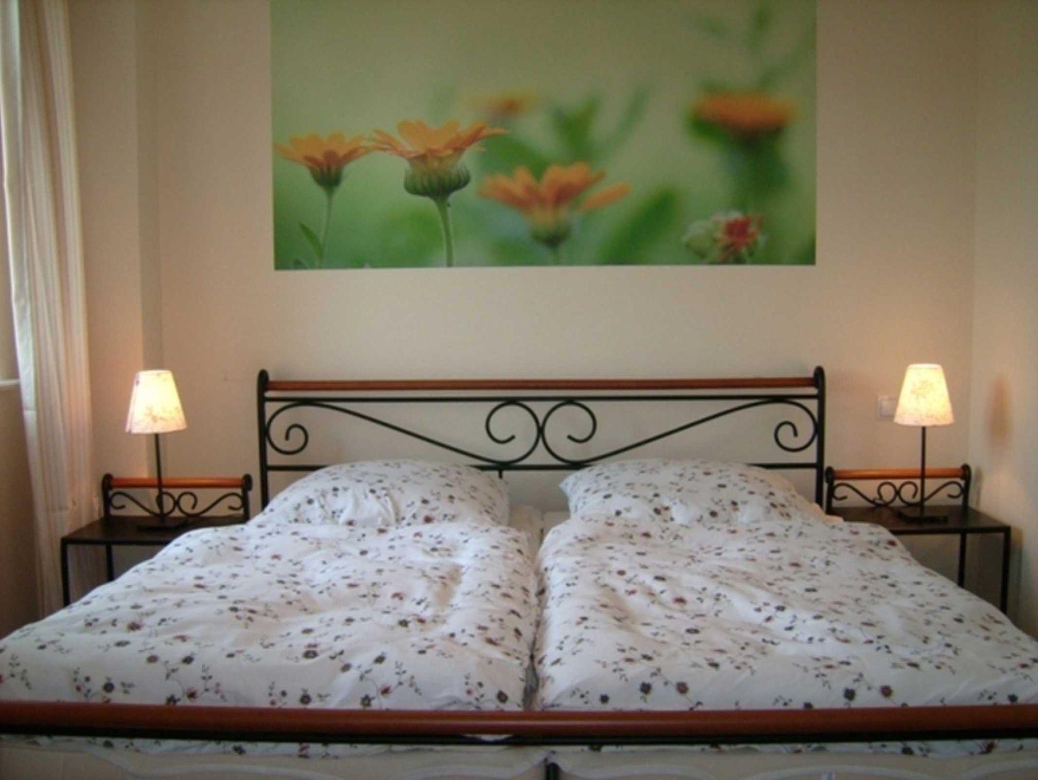 Ausstattung der Ferienwohnung 2: Sehr hell, großzügig geschnitten und gemütlich! Fußbodenheizung, Laminat. Schlafzimmer mit Doppelbett (180 x 200 cm), 100-jährige dreiteilige Falttür zum Wohn- / Kochbereich mit Ausziehcouch (170 cm x 122 cm), Kabel-TV, DVD Player, Stereoanlage. Bad mit WC und Dusche (120 x 90 cm), Fön und Glaswand zum Schlafzimmer. Küchenzeile mit Flüsterkühlschrank, Geschirrspüler, Cerankochfeld, Backofen, Kaffeemaschine, Wasserkocher und Toaster. Großer Esstisch. Größe ca. 44 m². Gepflasterte Terrasse Richtung Westen mit Möblierung, Gartengrill und einer kleinen Liegewiese. Diese Wohnung ist geeignet für 2 Erwachsene mit bis zu 2 kleineren Kindern, die im Kinderbett oder auf der Ausziehcouch übernachten können.