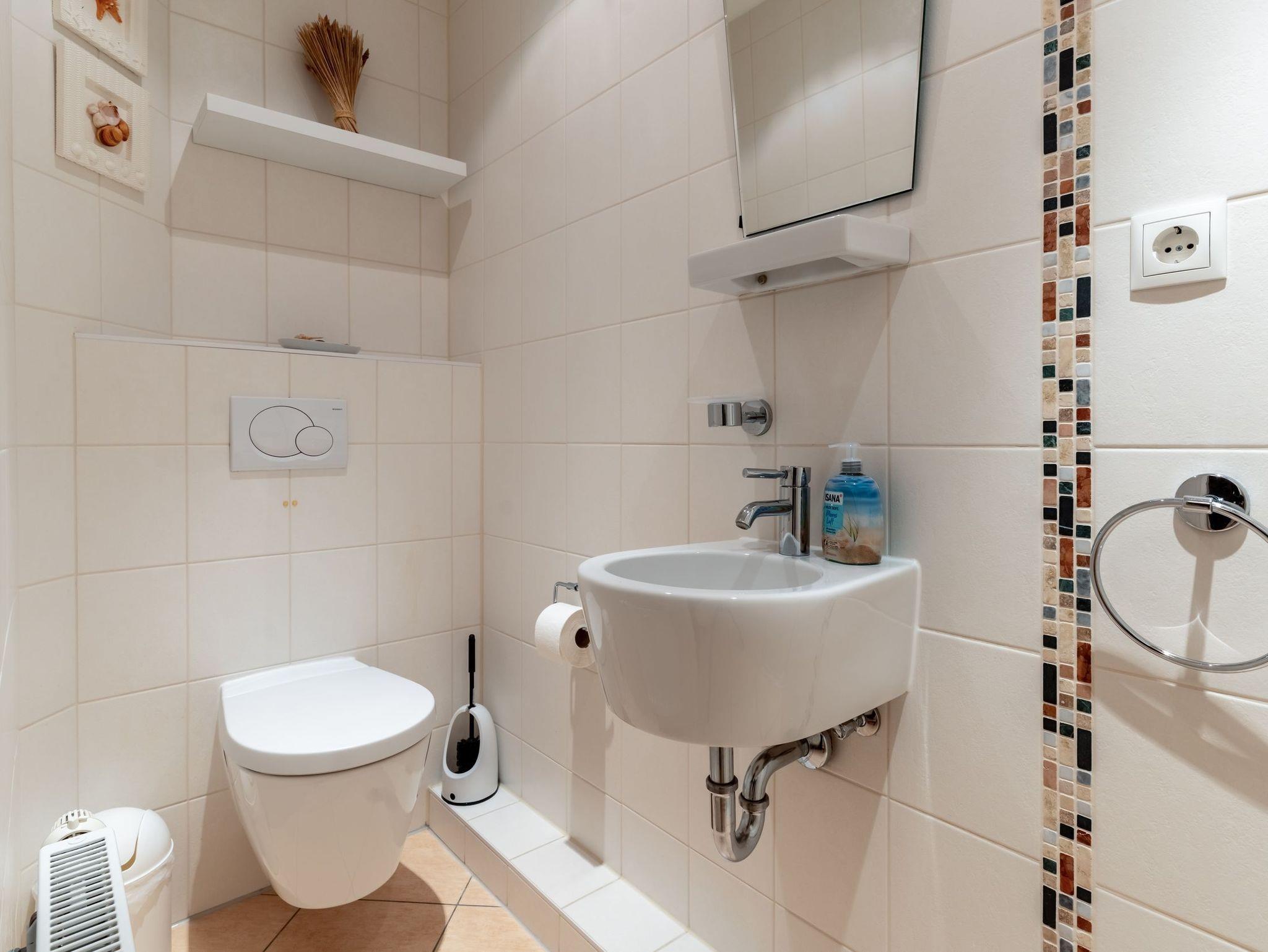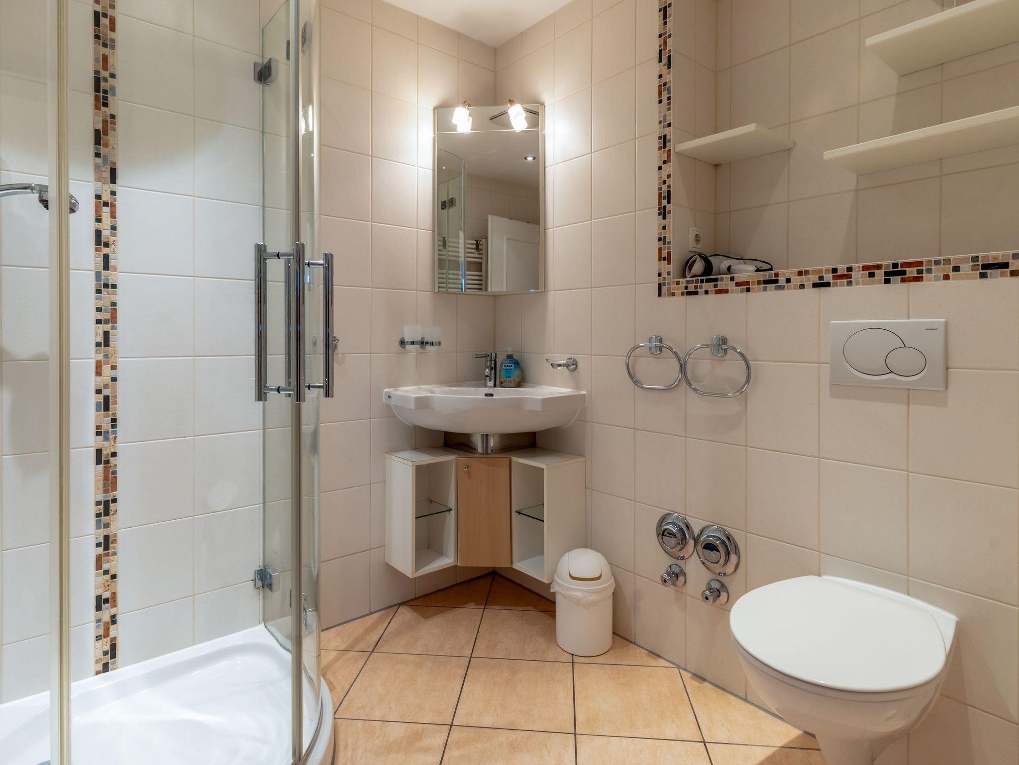 Starten Sie entspannt in den Tag im hellen Badezimmer mit Glasdusche, Waschtisch, WC, Handtuchheizung und Radio. Besonders praktisch bei einer Belegung mit mehreren Personen: Die Wohnung verfügt zusätzlich über ein separates Gäste-WC.