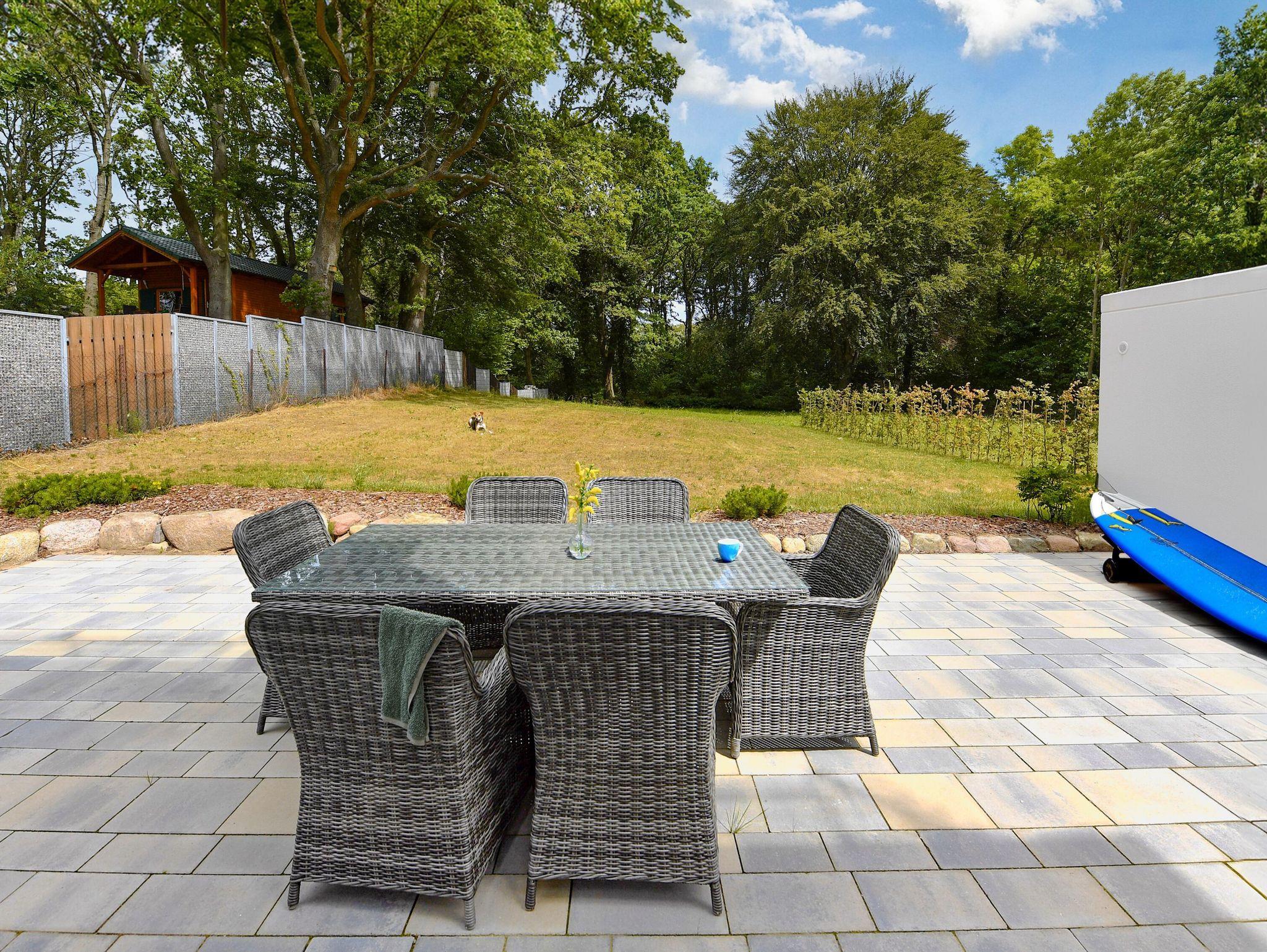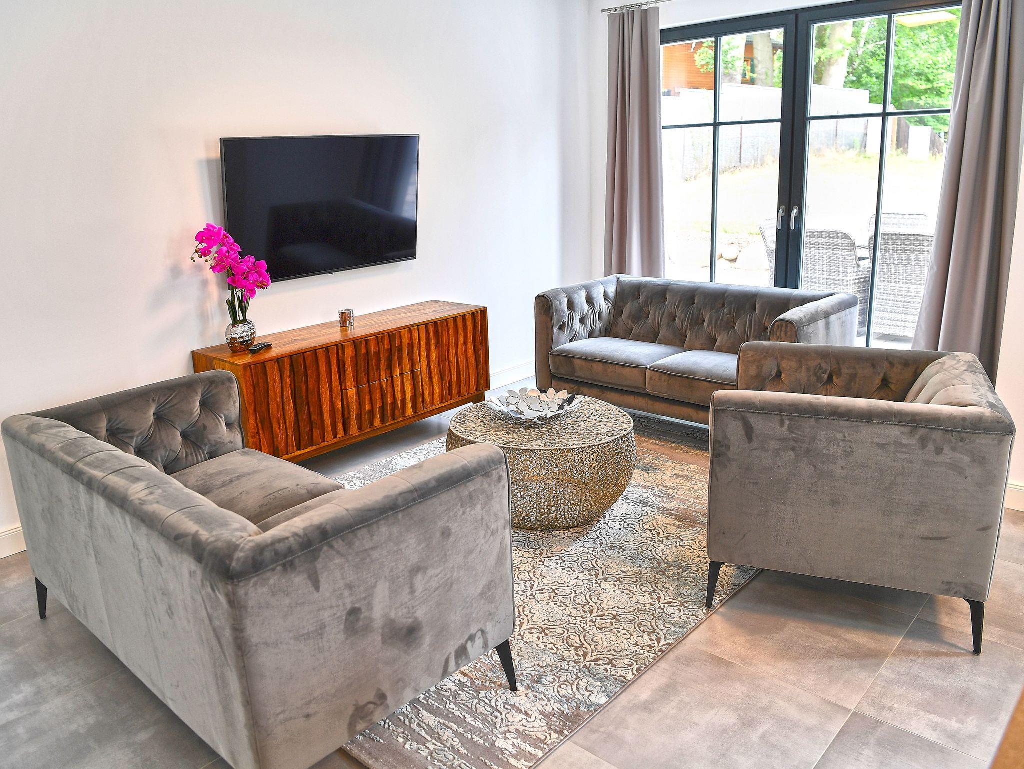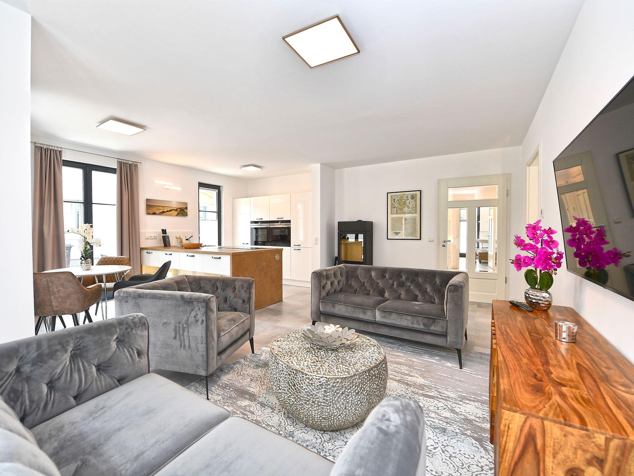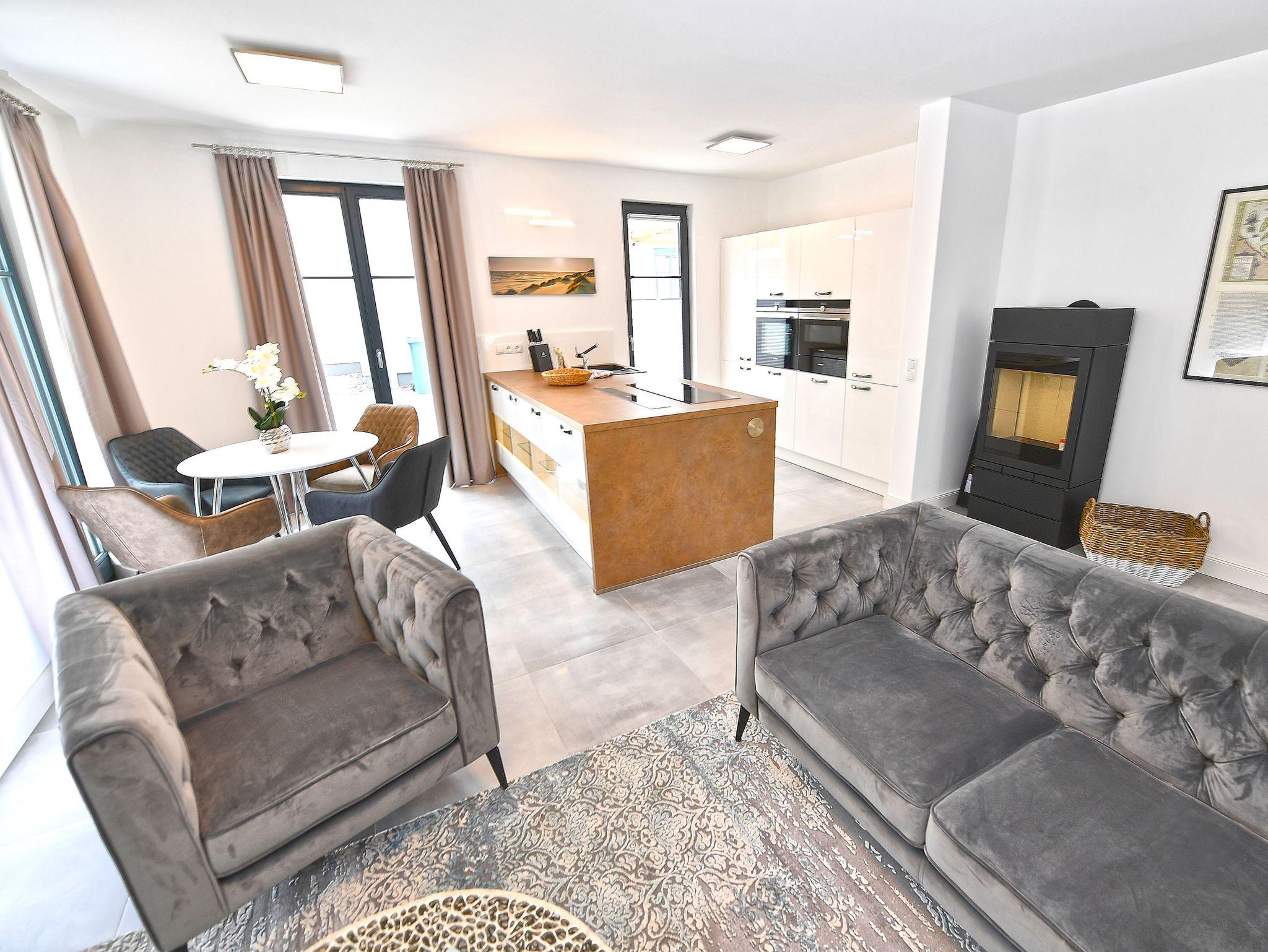 Im Wohnzimmer fühlt man sich auf Anhieb willkommen. Exklusive Sitzmöbel, modernste Unterhaltungstechnik, dezente Dekorationen, harmonische Farben und eine stimmige Beleuchtung verleihen dem Raum ein ganz besonderes Ambiente. Durch die bodentiefen Fenster fällt der Blick auf die vorgelagerte Terrasse, wo komfortable Gartenmöbel zum Frühstück in der gesunden Ostseeluft oder einfach nur zum Relaxen einladen. Auch die Rasenfläche am Haus, auf der die Kinder spielen oder Sie Ihr Sonnenbad genießen können, verdient dicke Pluspunkte. Zum besonderen Wohlgefühl gerade in der kühleren Jahreszeit trägt der Kaminofen von Scantherm bei.