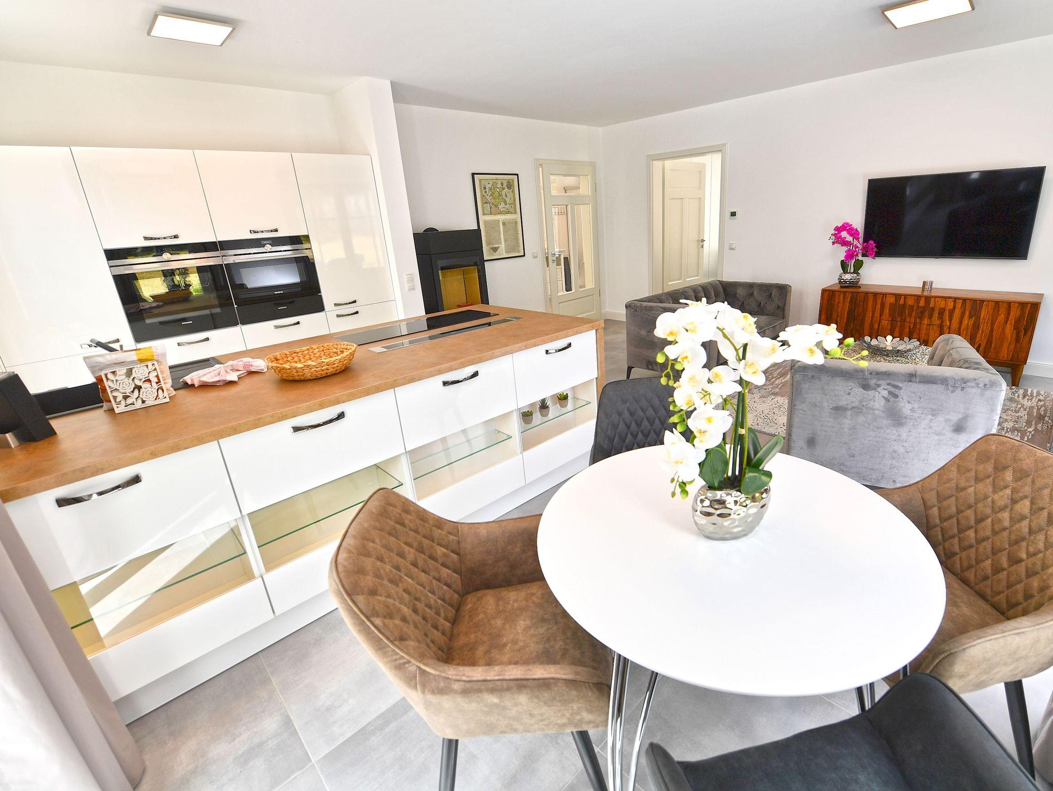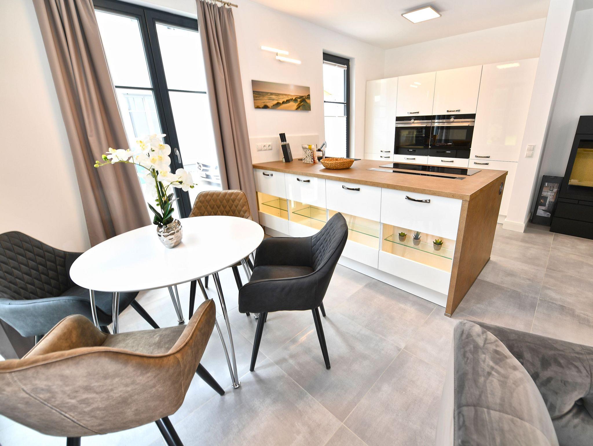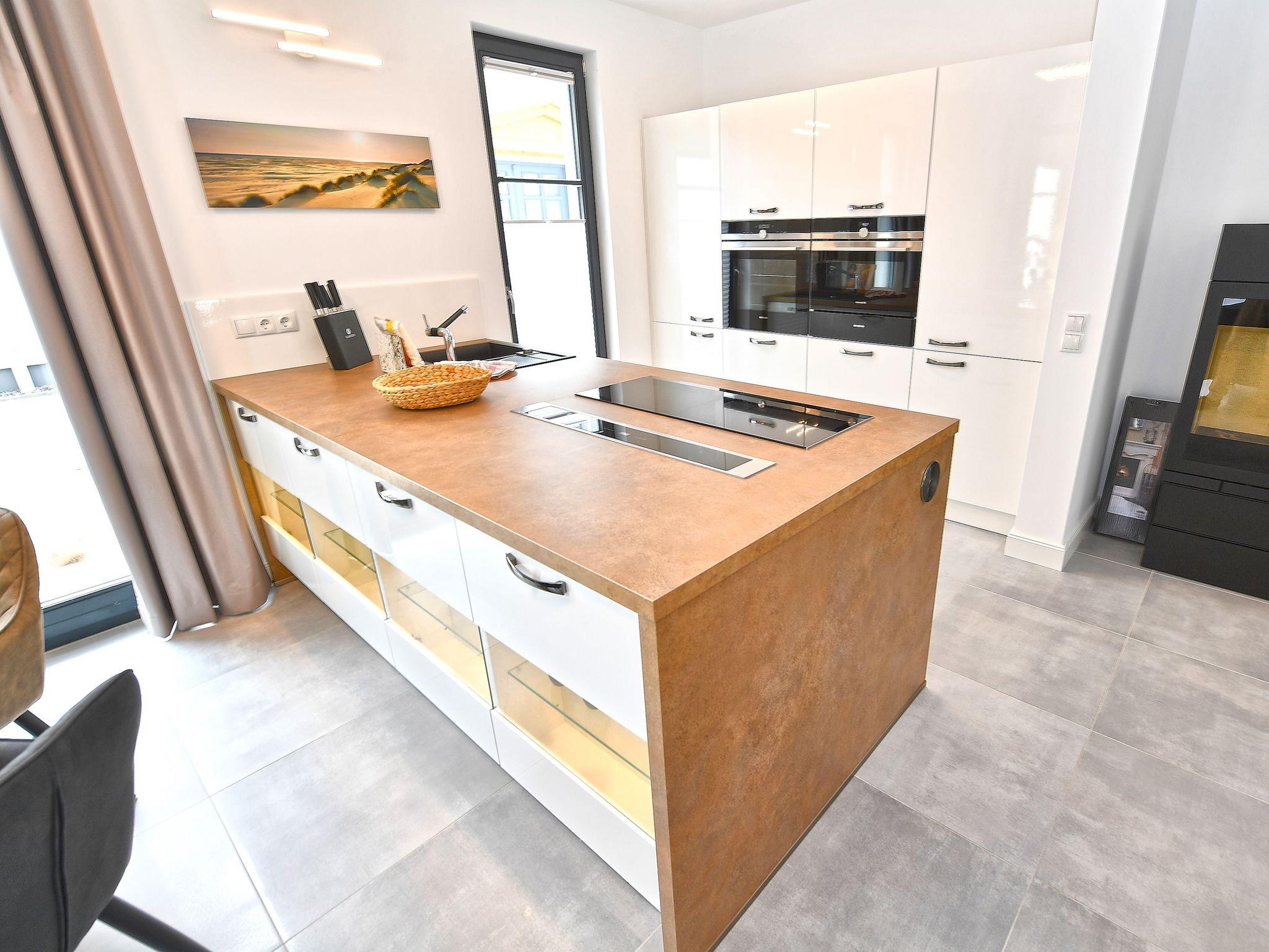 Harmonisch in das Wohnzimmer integriert sind der Essbereich und der Hochglanz-Küchenblock. Voll ausgestattet mit Markengeräten von Siemens und WMF, können Sie sich hier nach Herzenslust bekochen, wenn Sie nicht gerade in einem der zahlreichen Restaurants im Ort speisen. Auf jeden Fall haben Sie in Ihrer Ferienwohnung mit einer großen Kühl-/Gefrierkombi, einem Geschirrspüler, einem Cerankochfeld, Backofen, Filter-Kaffeemaschine, Toaster sowie Mikrowelle und Wasserkocher beste Bedingungen.