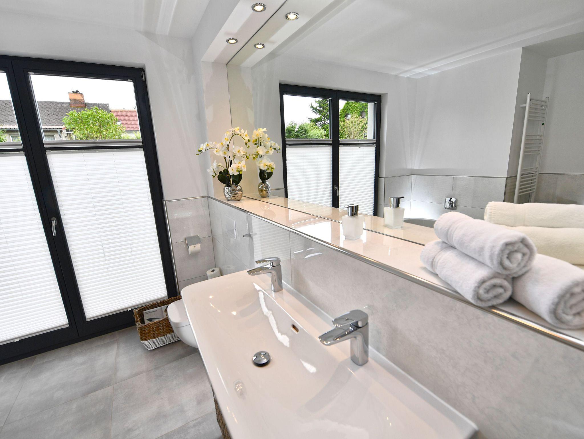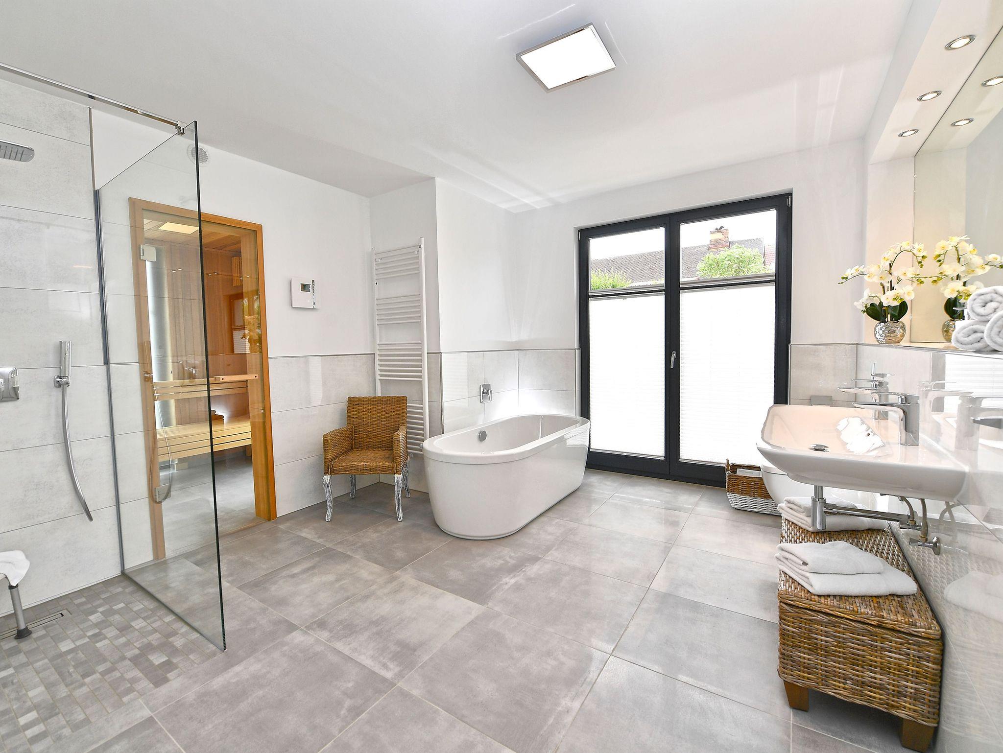 Mit jeder Menge Platz und exklusivem Wohlfühl-Komfort begeistert das Badezimmer. Ganz nach Belieben können Sie es sich hier in der freistehenden Badewanne bequem machen oder in der geräumigen Dusche abbrausen. Der beleuchtete Doppelwaschtisch mit großen Ablageflächen, der beheizbare Handtuchtrockner und natürlich Ihre ganz private Finnische Sauna sind weitere Highlights dieses Raumes, dessen Ausstattung durch WC, Fön und Kosmetikspiegel abgerundet wird.
