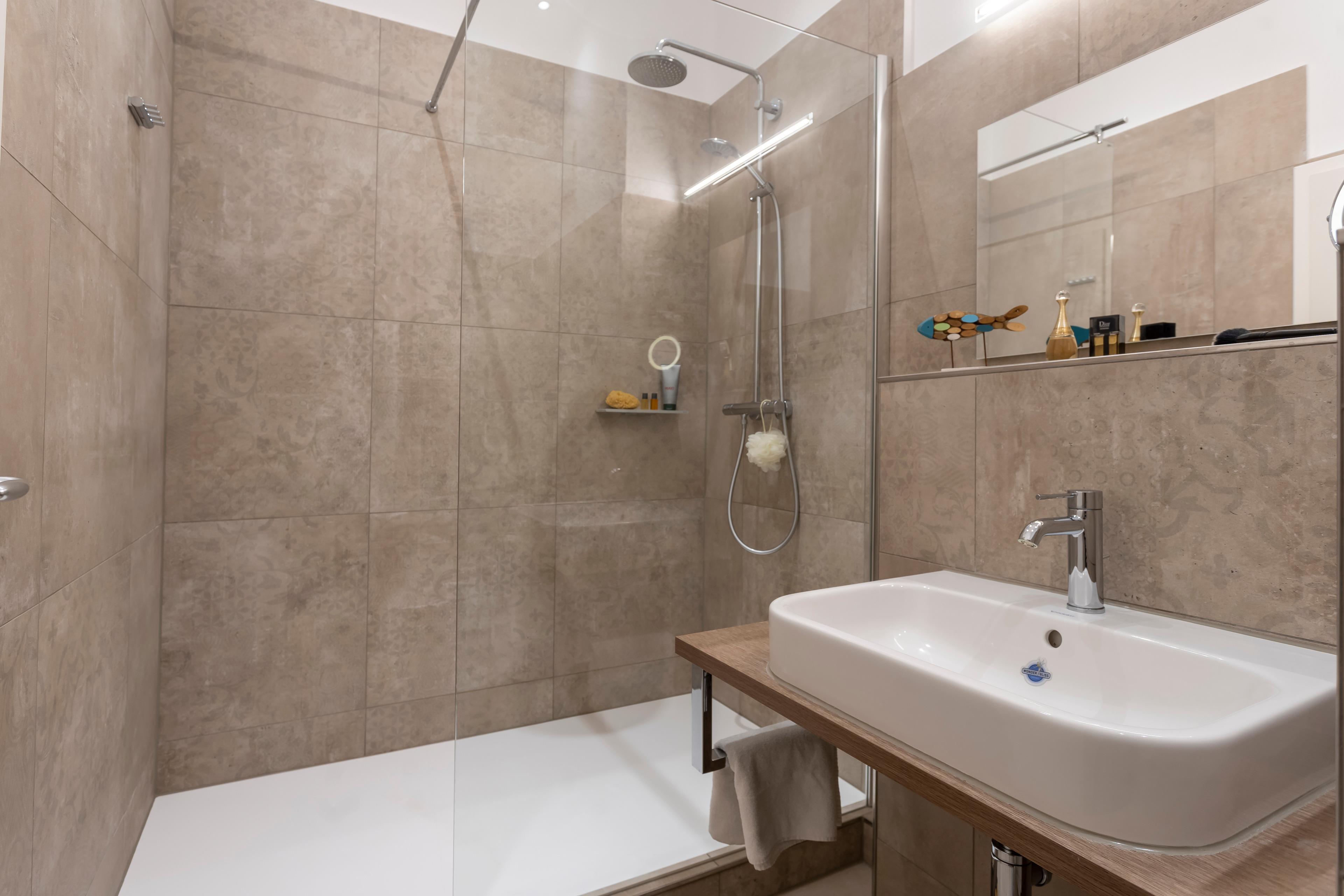 Bad mit Dusche und WC, großzügiger Balkon mit direktem Meerblick.