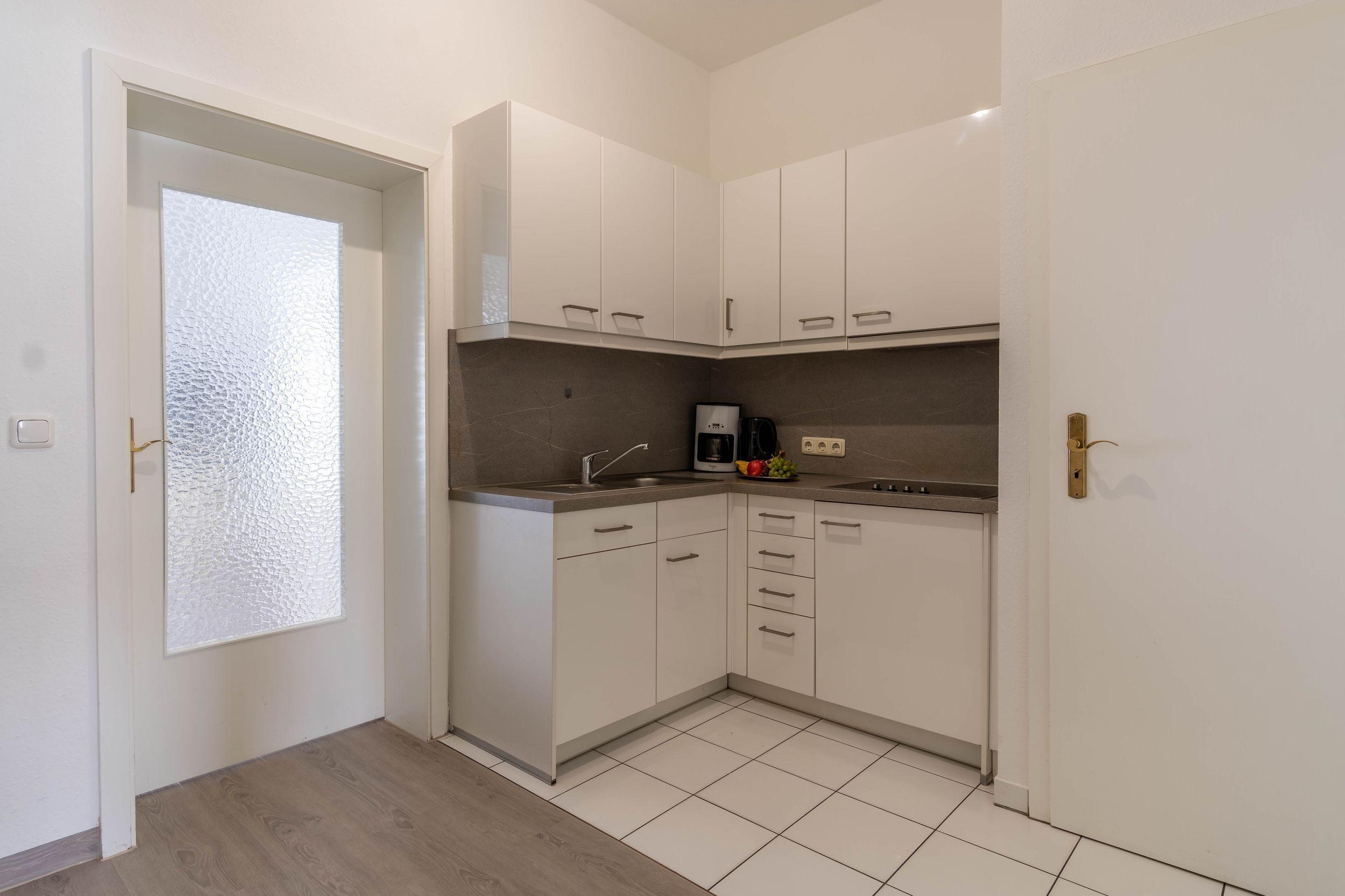 In der Küchenzeile befindet sich ein 4-Platten-Elektroherd, eine Dunstabzugshaube, ein Kühlschrank mit Gefrierfach, Geschirrspüler, Elektrogeräte wie Kaffeemaschine, Toaster, Wasserkocher sowie Geschirr, Besteck und Gläser.