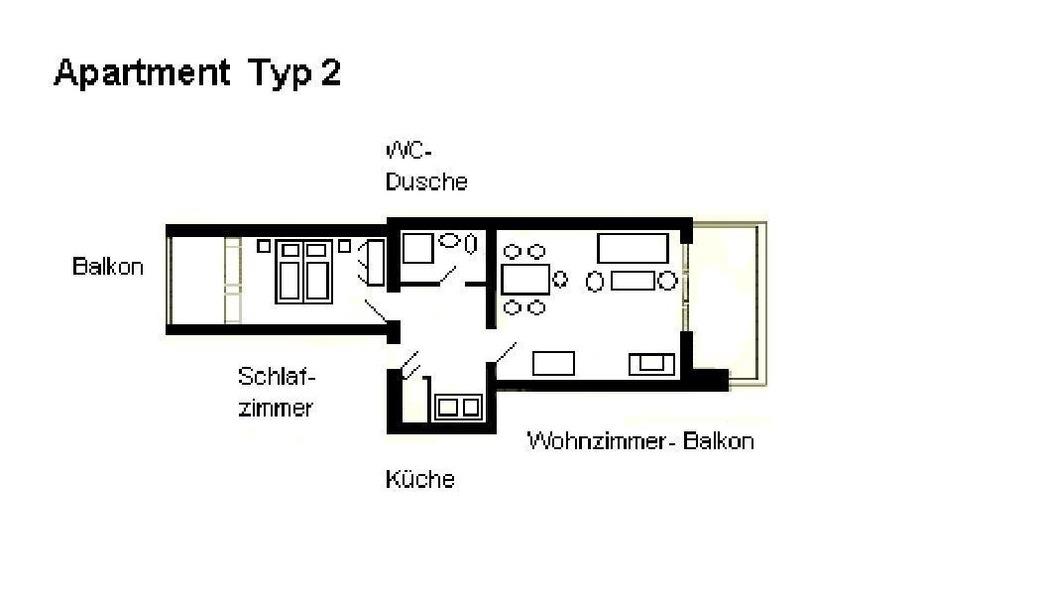 Die Ferienwohnung besteht aus einem Wohn-/ Essraum, einem Schlafzimmer sowie einem Duschbad. An dem Wohnbereich schließt sich der möblierte Balkon mit Meerblick an. Vom Schlafzimmer können Sie einen zusätzlichen Balkon erreichen.