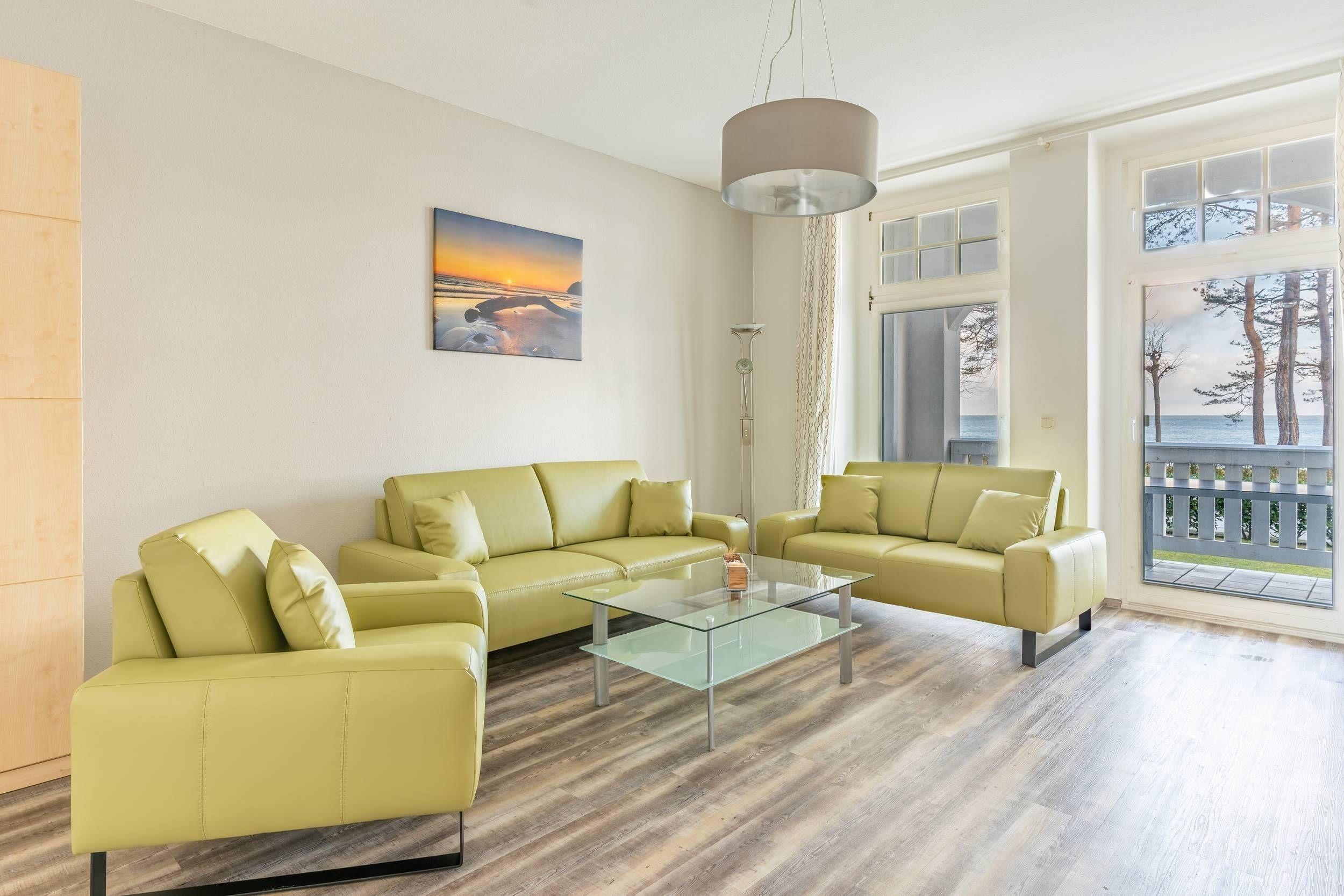 Vom Wohnzimmer aus erreichen Sie die beiden möblierten Balkone mit traumhaften Blick auf die Ostsee. Im Wohnbereich befindet sich ein Schrankbett, was mit wenigen Handgriffen zu einem vollwertigen Doppelbett ausgeklappt werden kann. Auf der Couch können Sie entspannt eine Urlaubstag vor dem Flat TV ausklingen lassen.