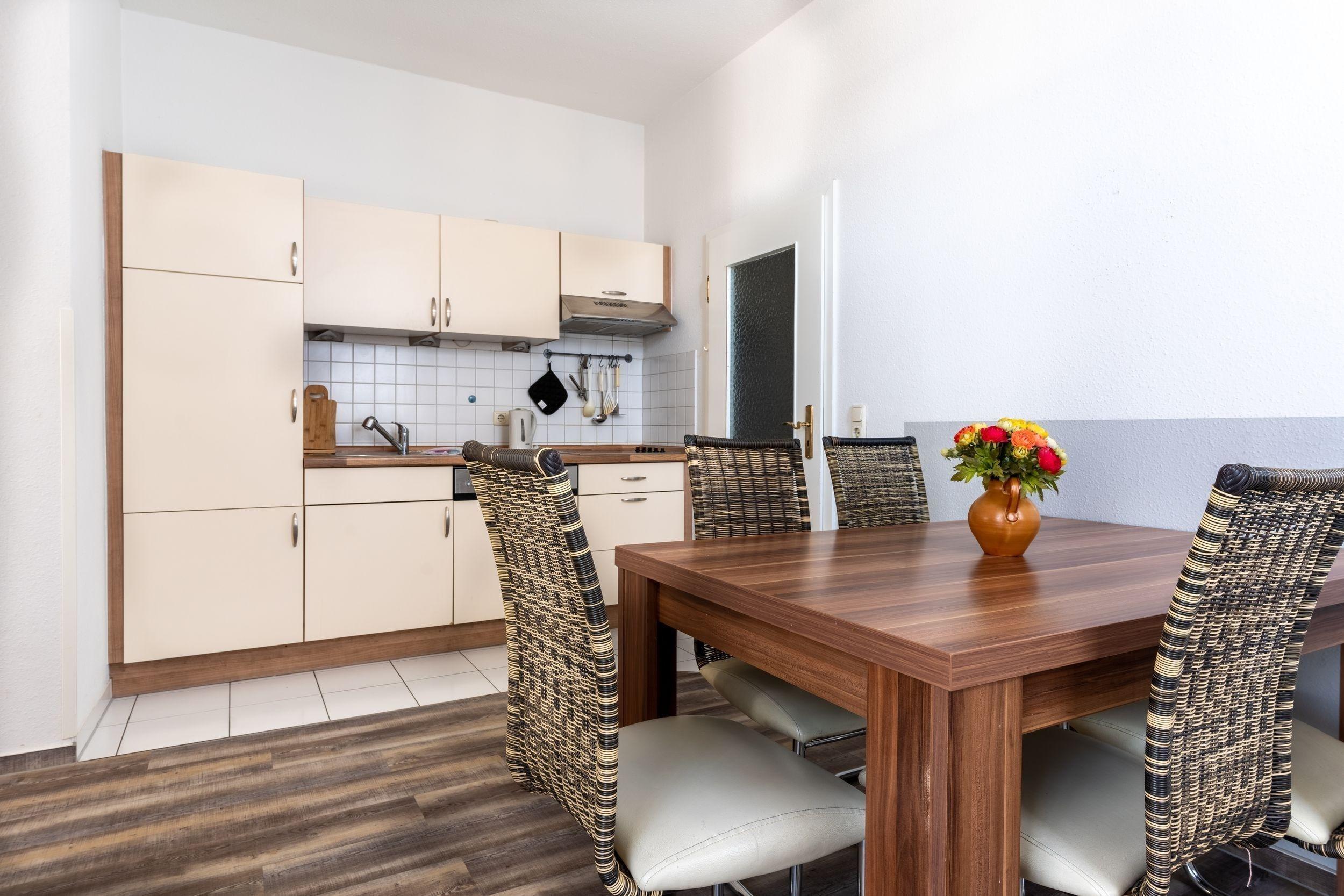 Die Küchenzeile mit Essbereich lädt zum Wohlfühlen ein. Sie ist umfangreich mit einem Herd, Kühlschrank, Geschirrspüler und allem weiteren notwendigen Utensilien ausgestattet.
