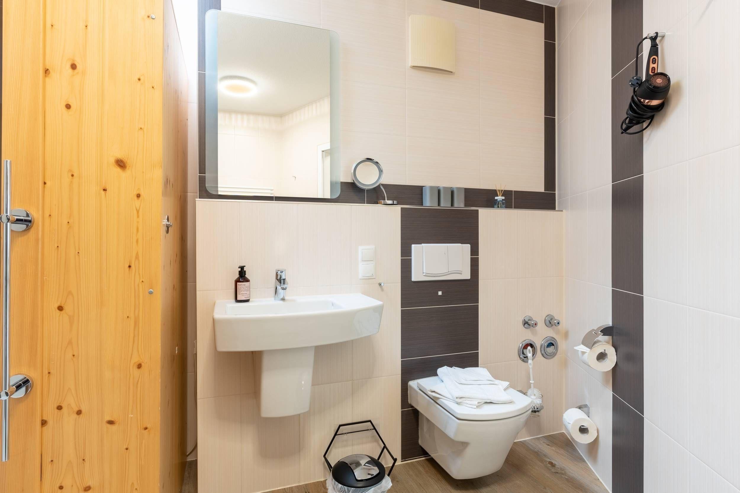 Im modernen Bad mit Tageslicht haben Sie eine Dusche sowie eine Elektrosauna, WC und Waschbecken. Im Abstellraum des Apartments können Sie eine Waschmaschine nutzen.