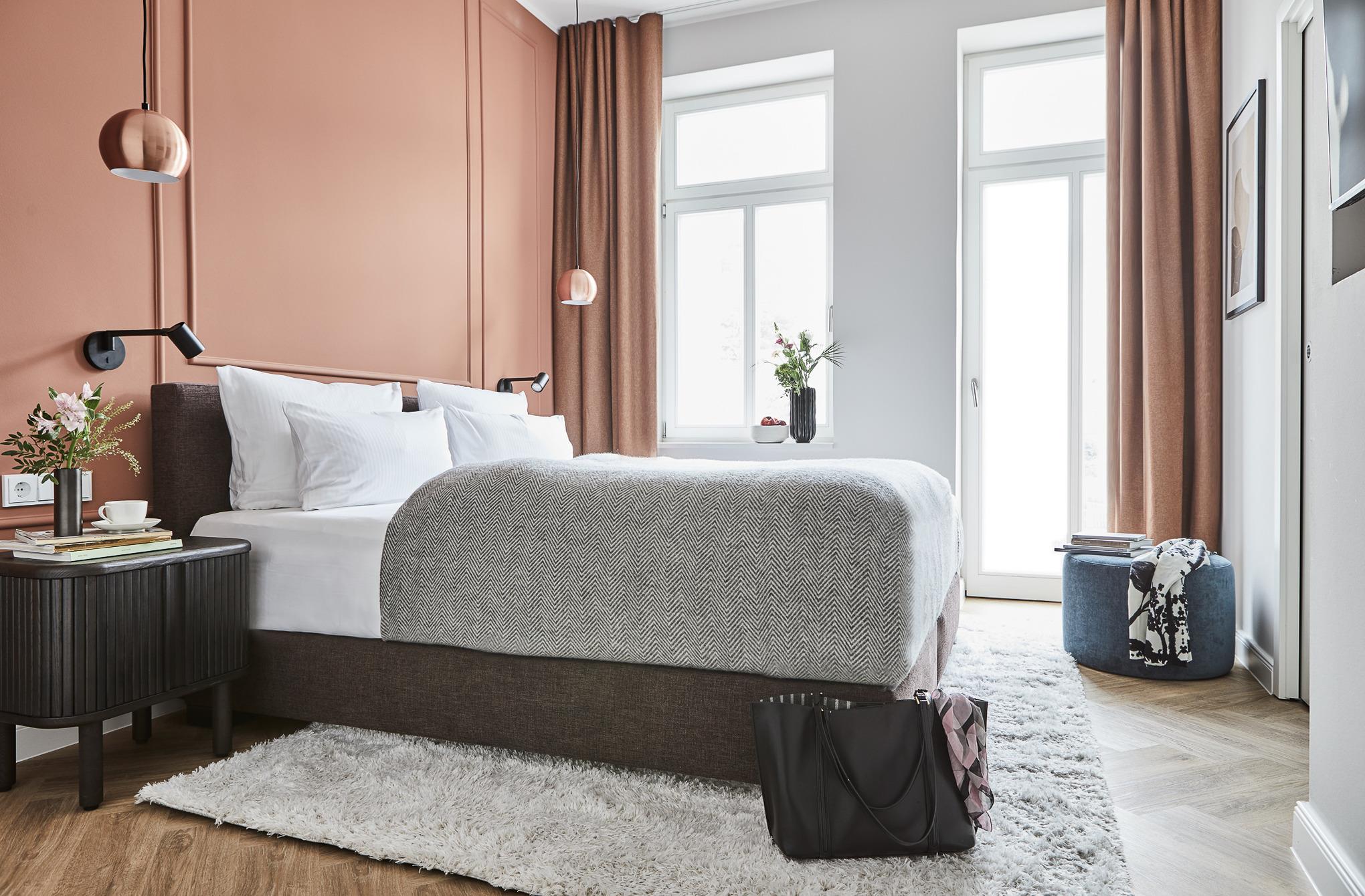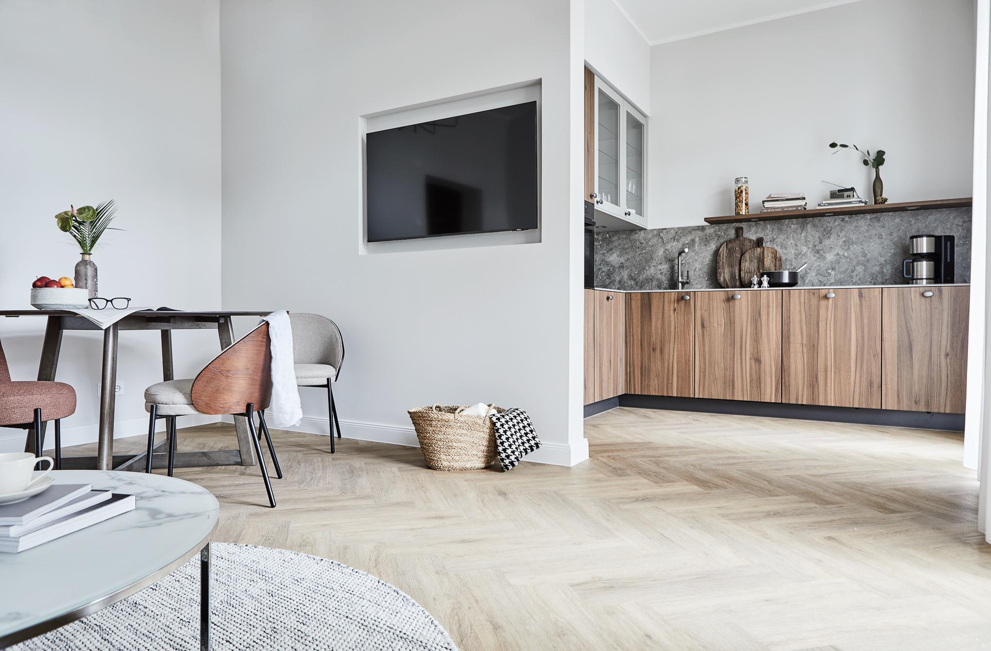 Die Deluxe Suite mit Balkon und Dampfbad befindet sich im Erdgeschoss und verfügt über geräumige ca. 56 m2, über einen separaten Schlaf-/Wohnraum, eine offene Küchenzeile und ein Badezimmer mit Dampfbad. Der Balkon ist nach Westen gelegen.