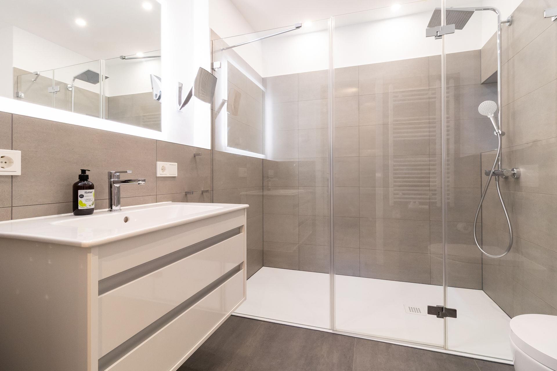 Das große Badezimmer ist direkt von einem Schlafzimmer aus zugänglich und verfügt über eine moderne, großzügige Dusche.