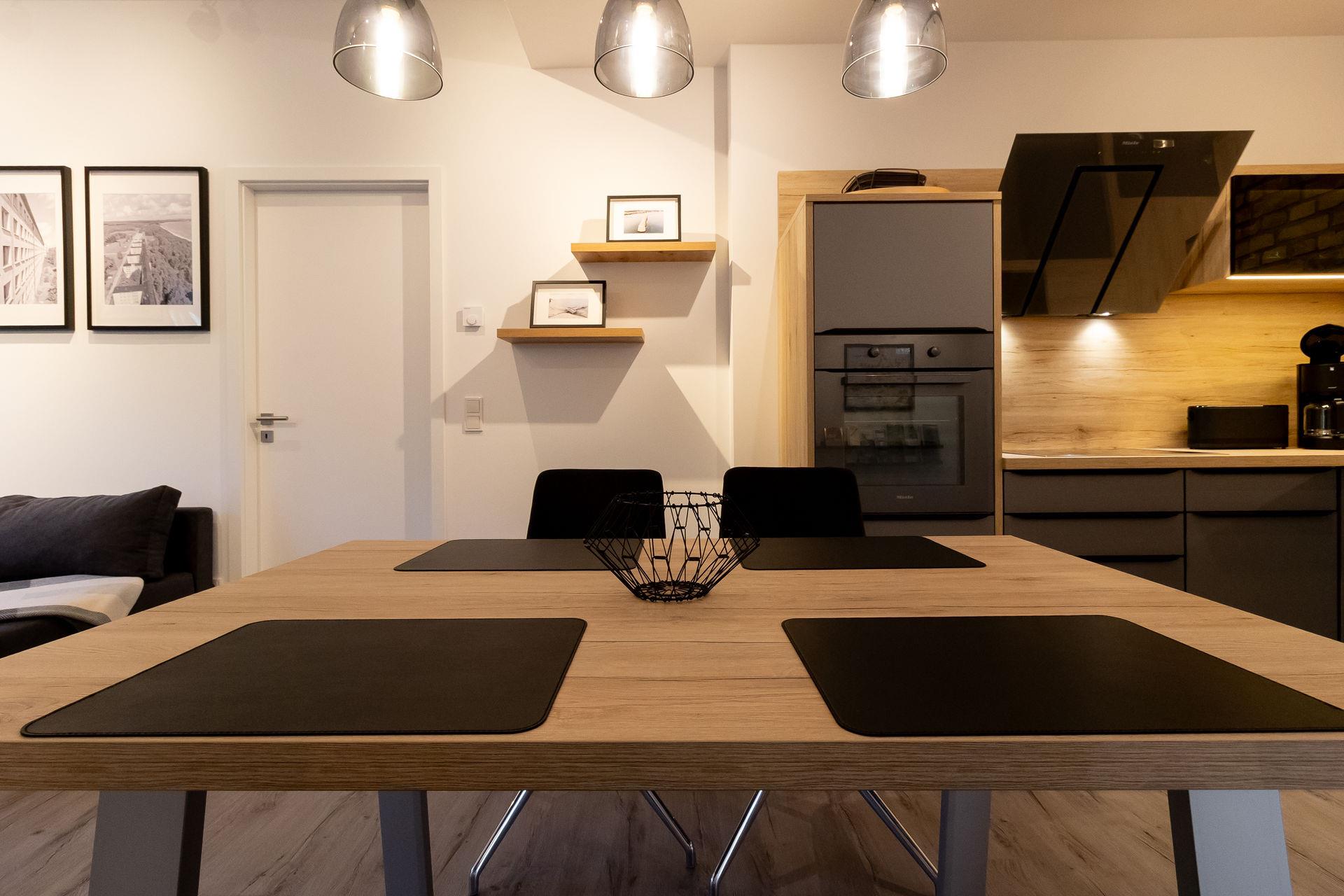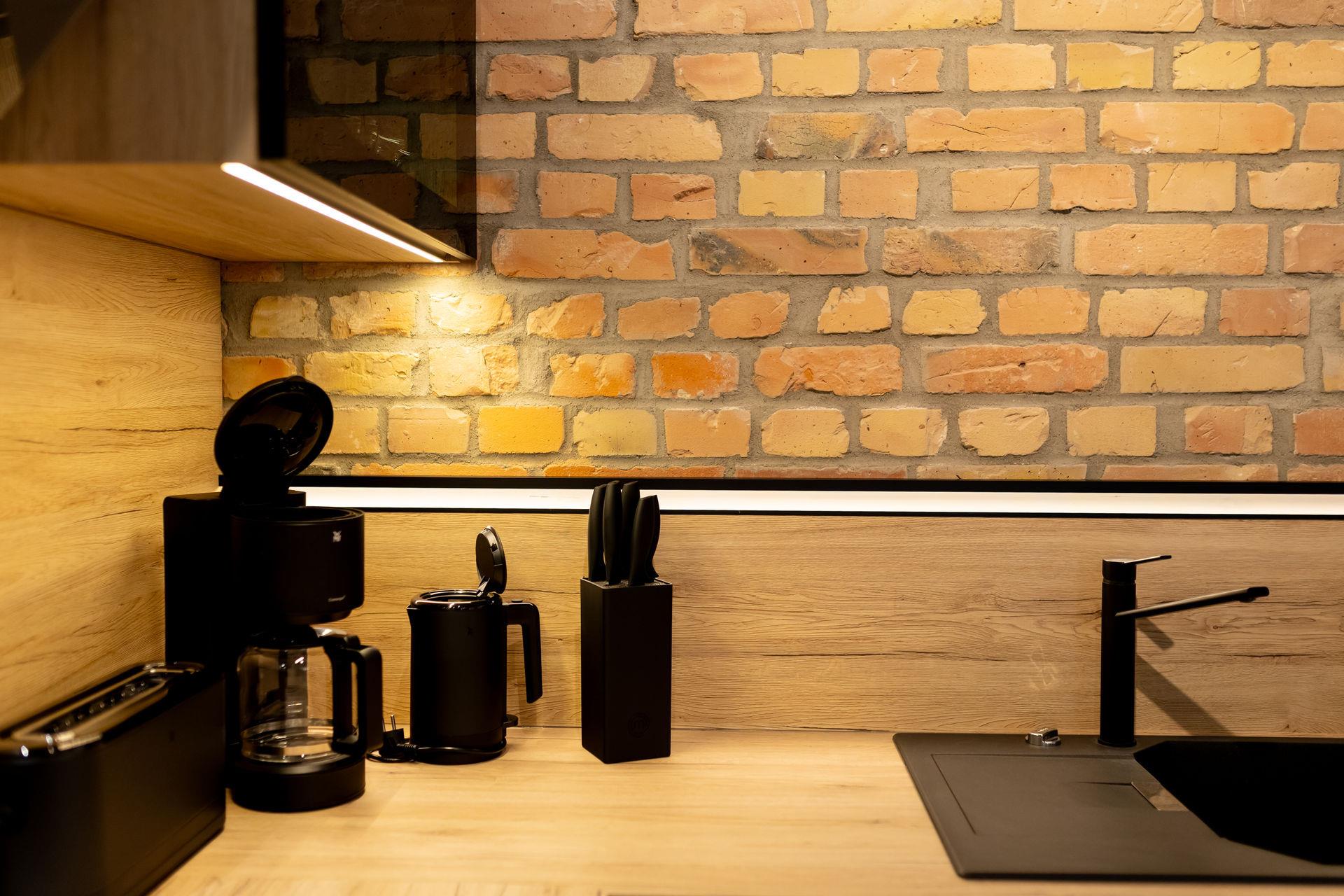 Das Studio verbindet den industriellen Charakter des ehemaligen KdF-Bads mit modernem Wohnkomfort. Klare Linien, ausgewählte Materialien und originale Details – wie die Steinwand aus historischen Ruinensteinen – lassen die Geschichte des Ortes bewusst weiterleben und schaffen gleichzeitig eine warme, entspannte Atmosphäre.