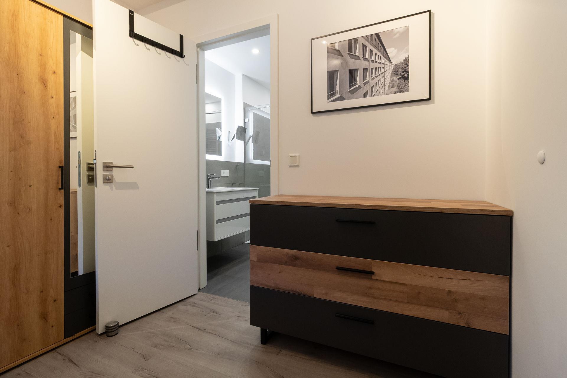 Loris Studio befindet sich im Haus Mönchgut und verfügt über einen separaten Eingang im Erdgeschoss. Sie betreten die Wohnung ganz ohne Durchgangsverkehr, direkt vom Parkplatz aus – ideal auch für längere Aufenthalte oder die Anreise mit Hund. Vor dem Eingang lädt eine kleine Sitzlounge dazu ein, die Nachmittags- und Abendsonne auf der ruhigen Landseite zu genießen.