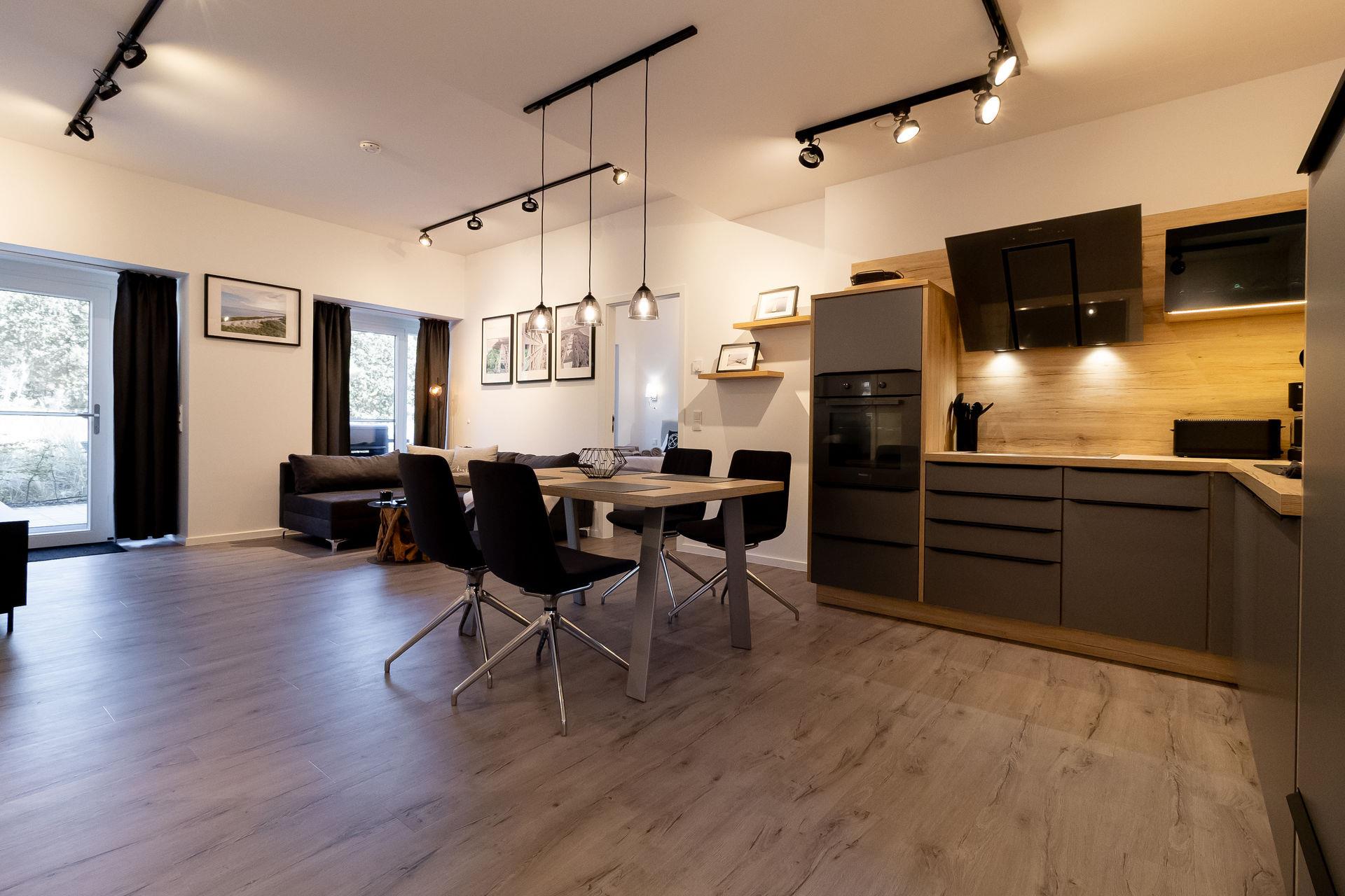Über den großzügigen Flur mit Zugang zu Abstellraum und Gäste-WC gelangen Sie in den offenen Wohn- und Essbereich. Die hochwertige Küche ist modern und vollständig ausgestattet – mit Herd, stylischer Dunstabzugshaube, Spülmaschine, Backofen, Mikrowelle, Kühlschrank mit Gefrierfach sowie Kaffeevollautomat, Filterkaffeemaschine, Wasserkocher und Toaster.