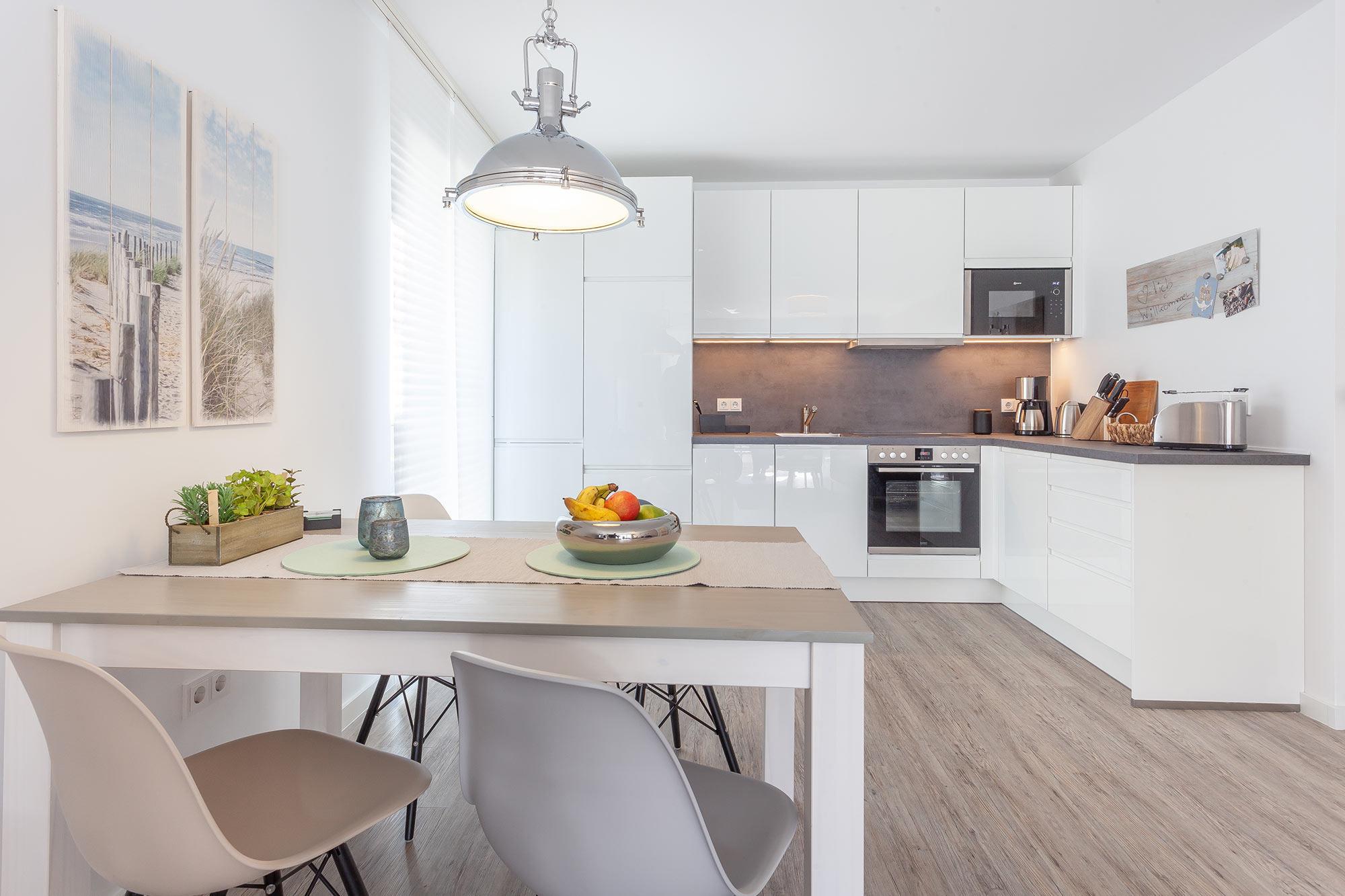 In der modernen, komplett ausgestatteten Einbauküche können Sie sich nach Herzenslust selbst bekochen. Ihren Kaffee aus der de Longhi Nespresso Maschine können Sie im eleganten Essbereich genießen.