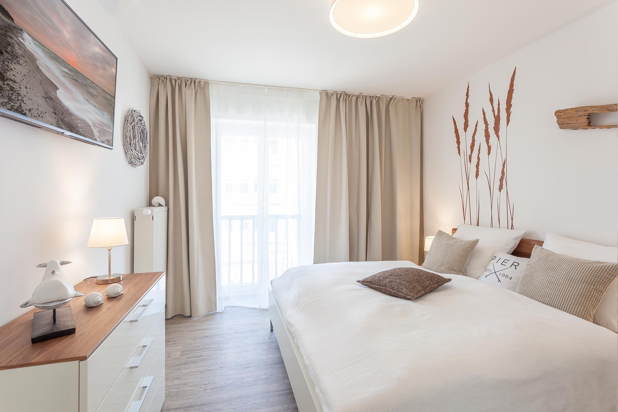 Das Highlight dieser Ferienwohnung ist das hell und modern eingerichtete zweite Schlafzimmer, welches sich auf der offenen Galerie über dem Wohn- und Essbereich befindet. Es bietet Platz für ein 160 x 200 cm großes Doppelbett und einen Kleiderschrank.