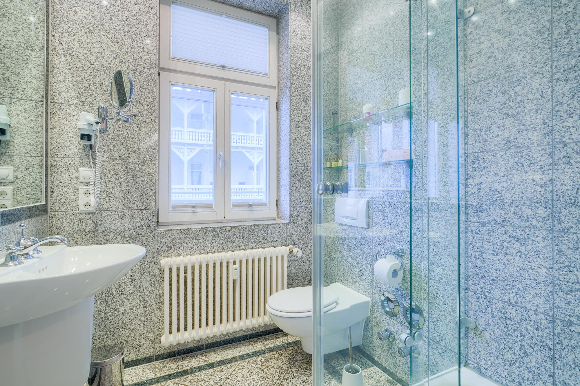 Das Badezimmer ist mit einer Dusche und WC ausgestattet.
