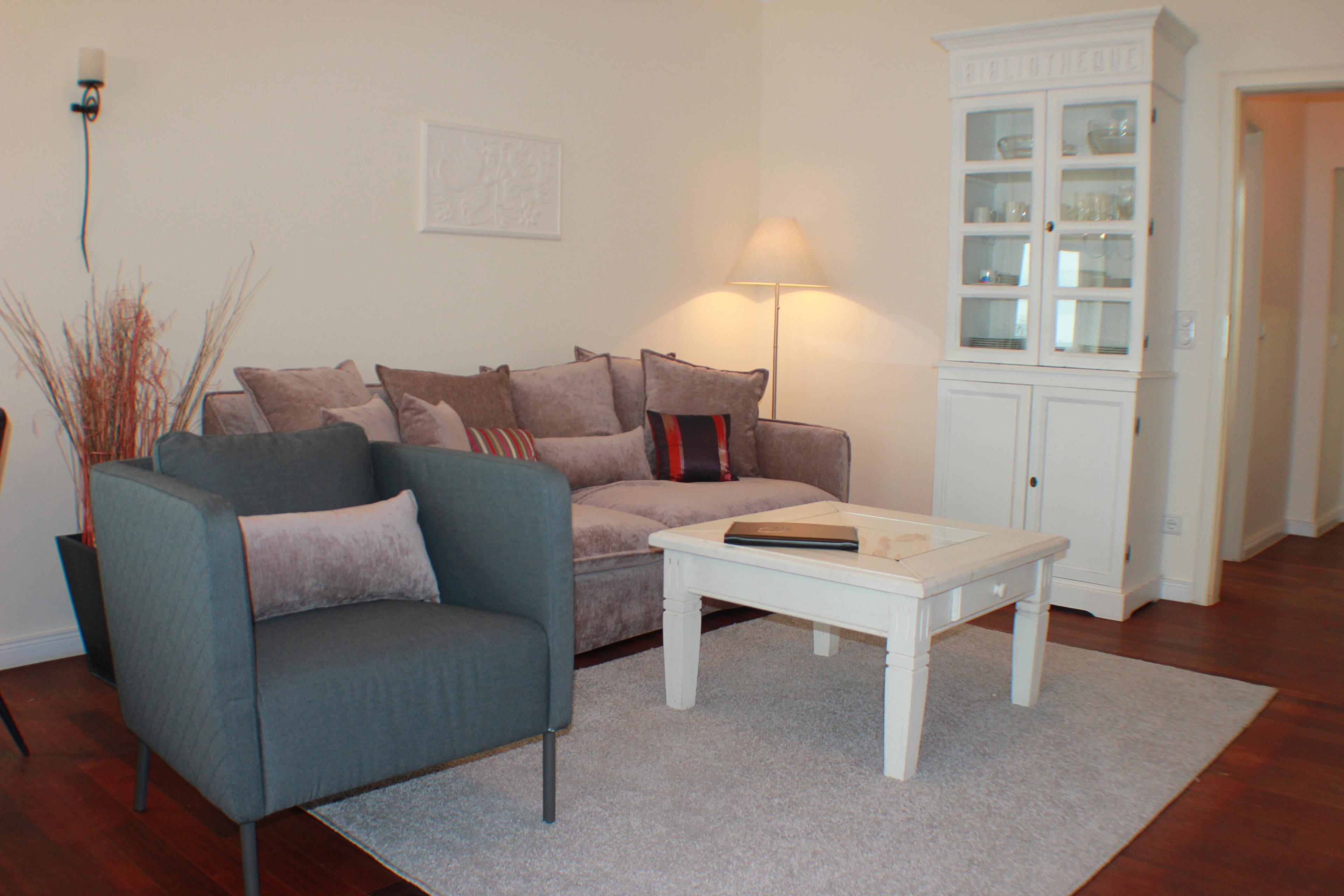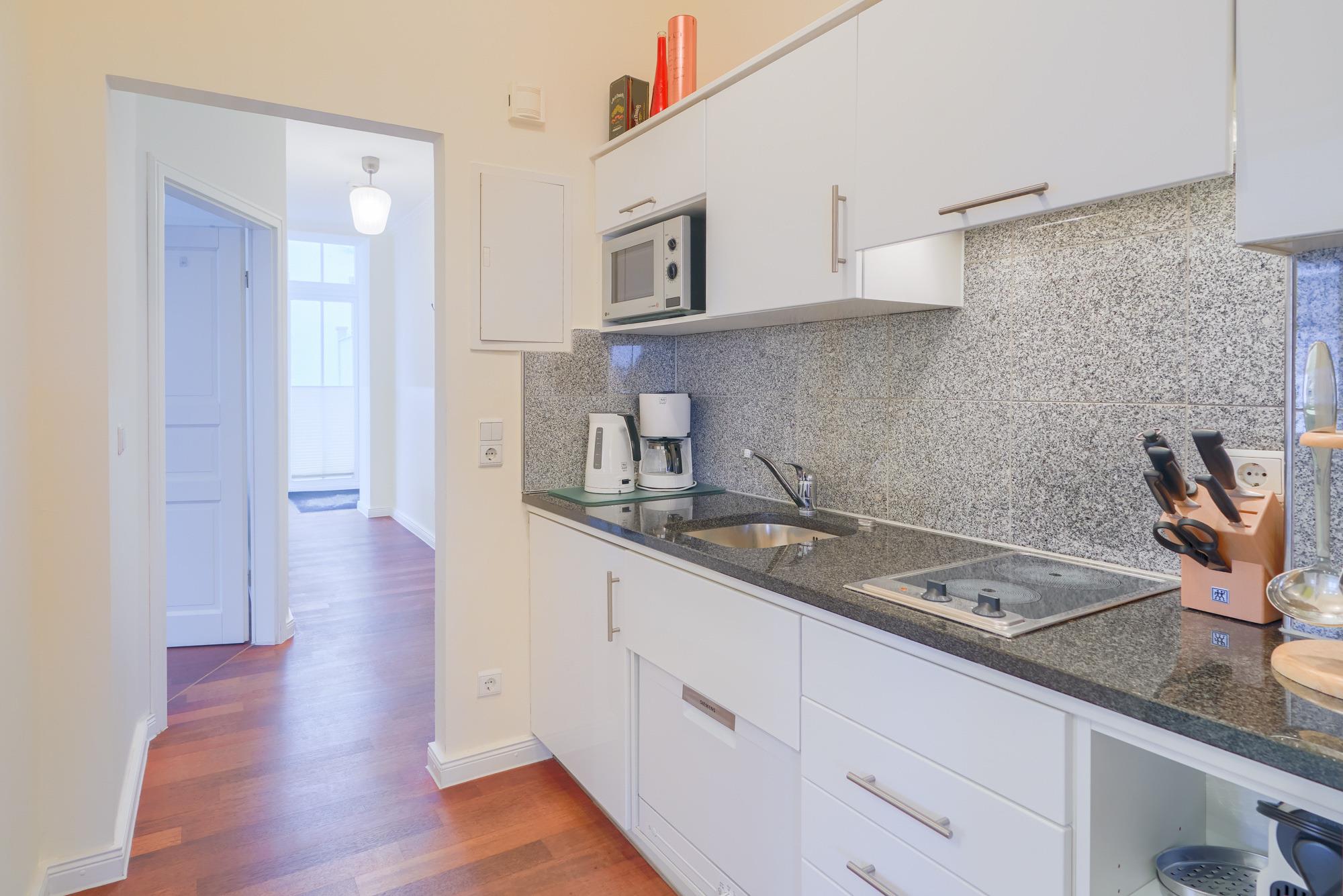Die am Wohnbereich separat angrenzende Küchenzeile ist mit einem Kühlschrank mit Gefrierfach, einem Geschirrspüler, einem Cerankochfeld und einer Mikrowelle ausgestattet. Eine Kaffeemaschine, ein Toaster, ein Eierkocher und ein Wasserkocher stehen Ihnen hier selbstverständlich zur Verfügung.