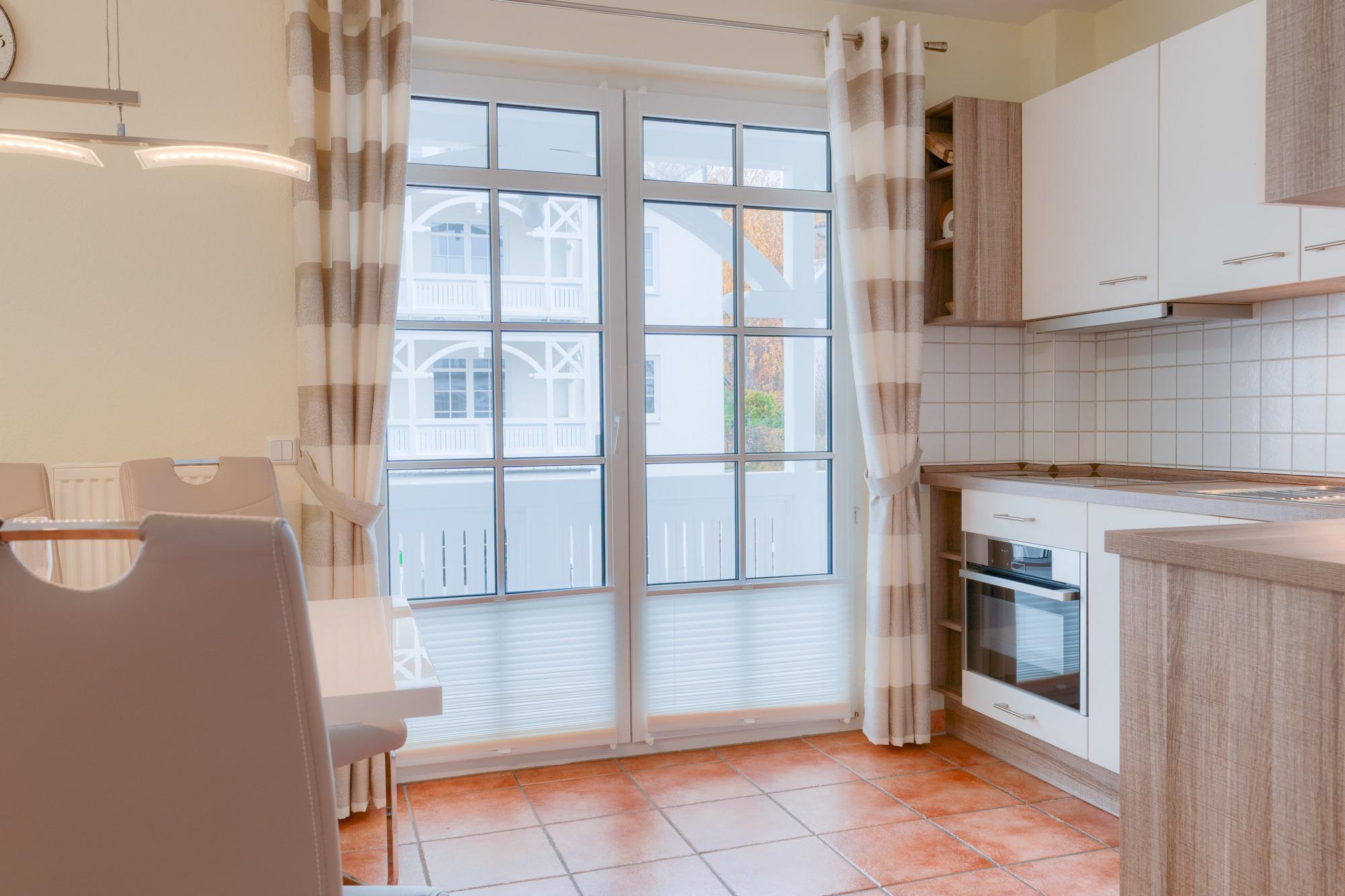 Die hier angrenzende Küchenzeile ist mit einem Kühlschrank mit Gefrierfach, einem Geschirrspüler und einem Kombigerät aus Backofen, Grill und Mikrowelle mit Cerankochfeld ausgestattet. Eine Kaffeemaschine, ein Toaster, ein Eierkocher und ein Wasserkocher stehen Ihnen hier selbstverständlich zur Verfügung.