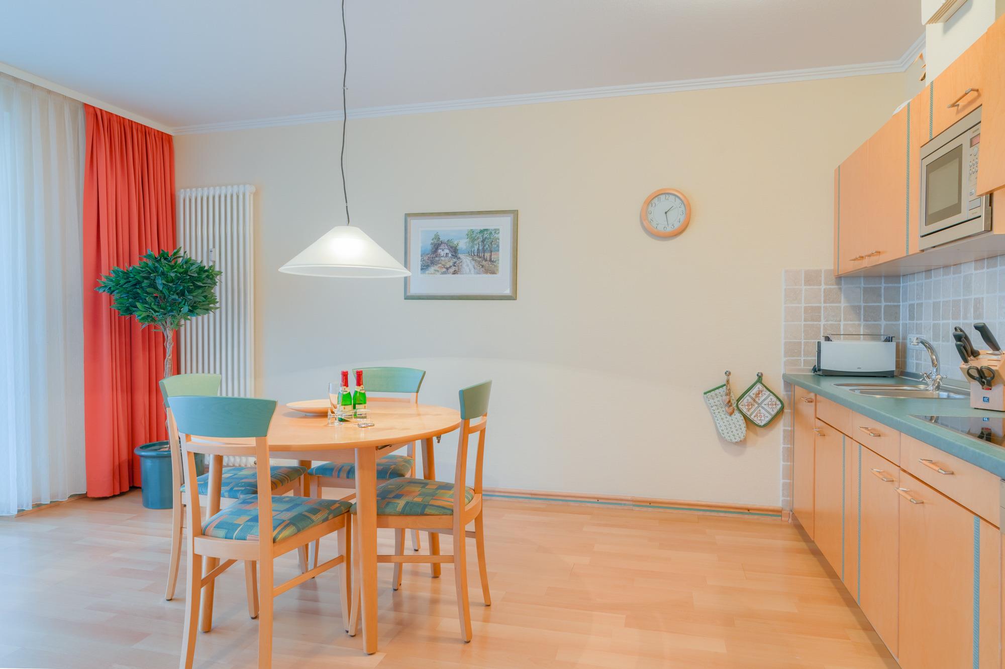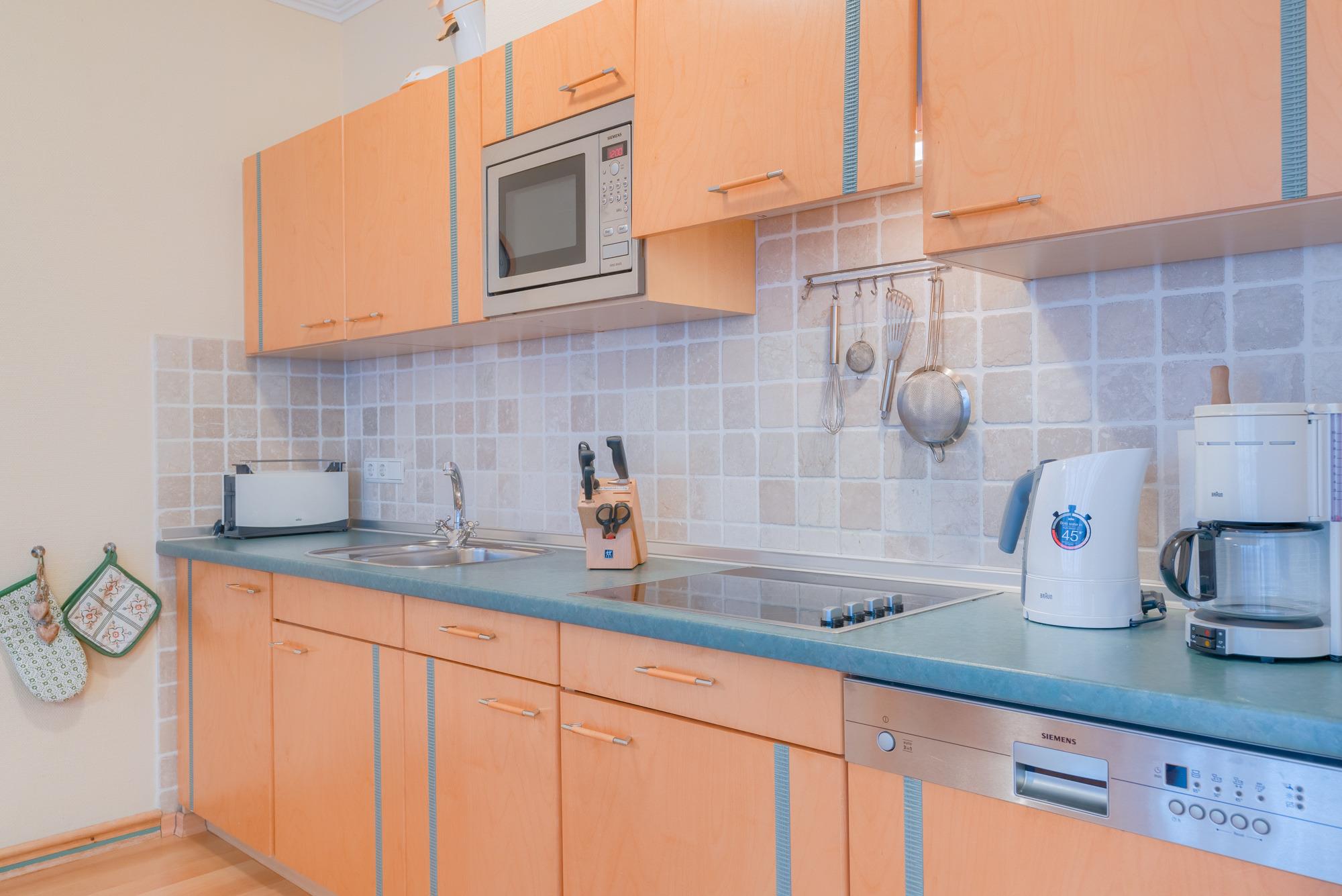 Die hier angrenzende Küchenzeile ist mit einem Kühlschrank mit Gefrierfach, einem Geschirrspüler, einem Cerankochfeld, einer Mikrowelle und einem Backofen ausgestattet. Eine Kaffeemaschine, ein Toaster, ein Eierkocher und ein Wasserkocher stehen Ihnen hier selbstverständlich zur Verfügung.
