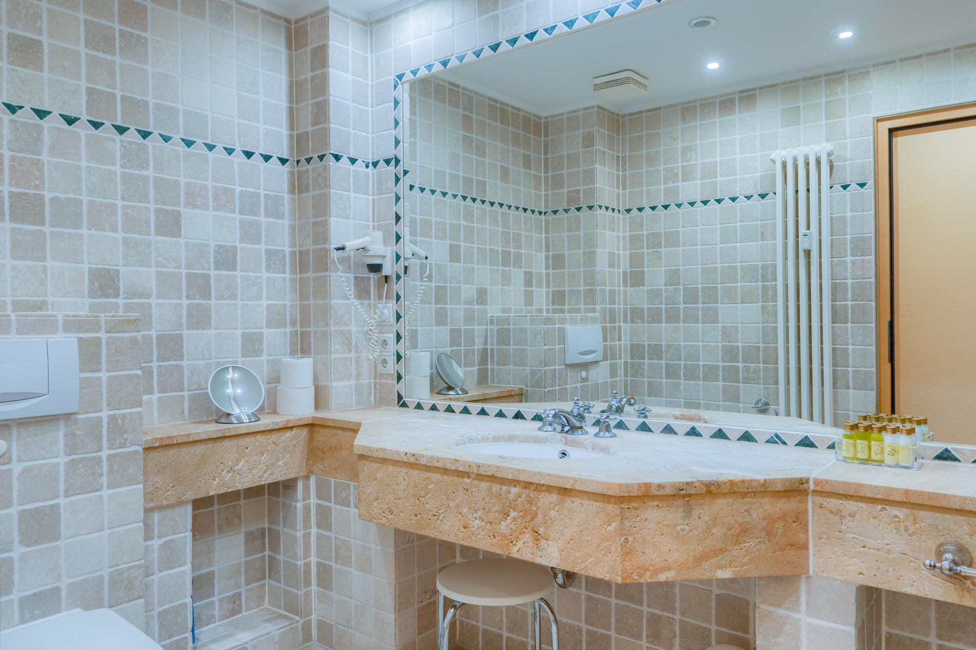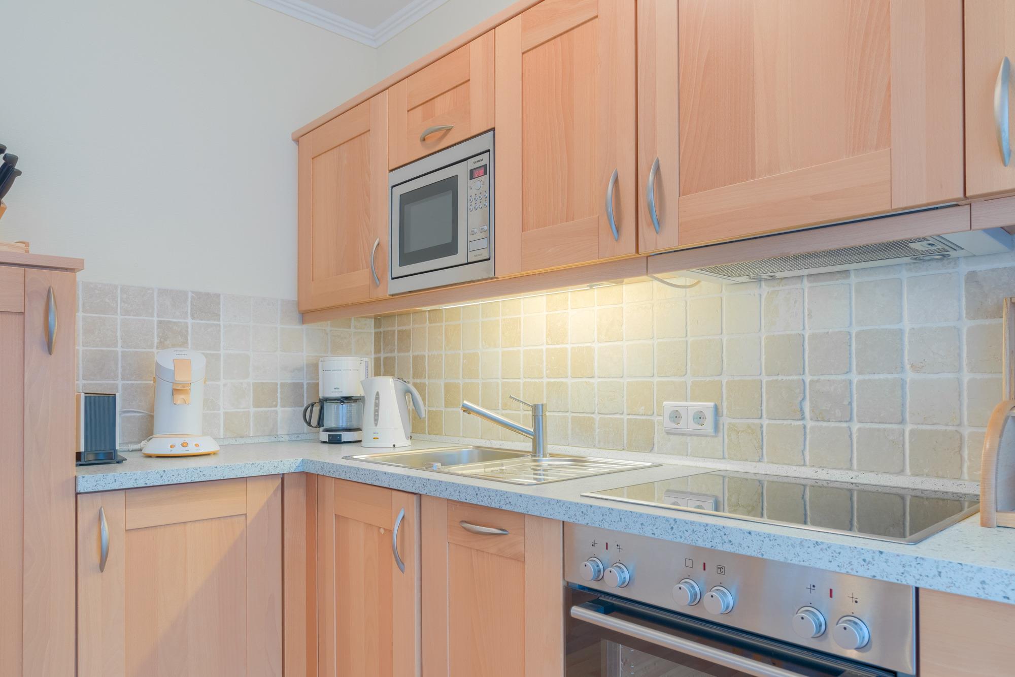 Die hier angrenzende Küchenzeile ist mit einem Kühlschrank mit Gefrierfach, einem Geschirrspüler, einem Backofen mit Cerankochfeld und einer Mikrowelle ausgestattet. Eine Kaffeemaschine, ein Toaster, ein Eierkocher und ein Wasserkocher stehen Ihnen hier selbstverständlich zur Verfügung.