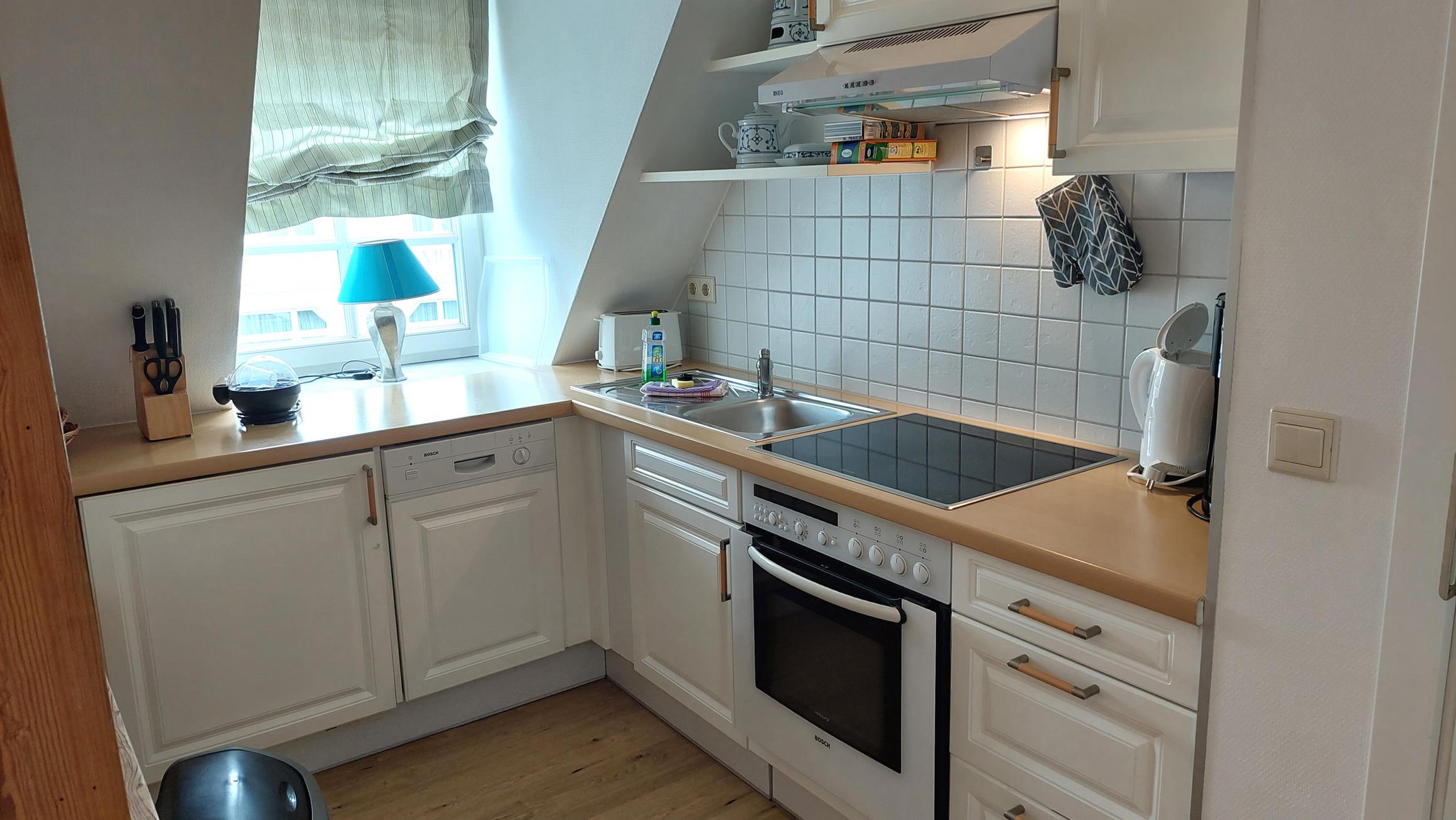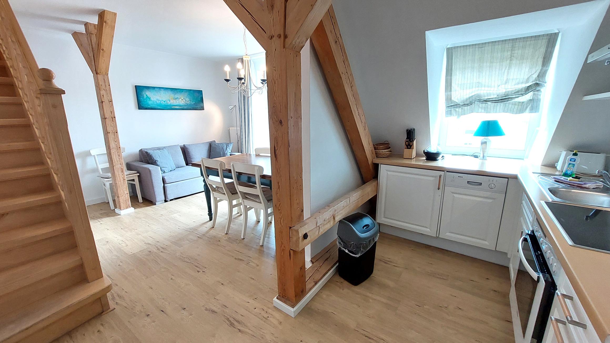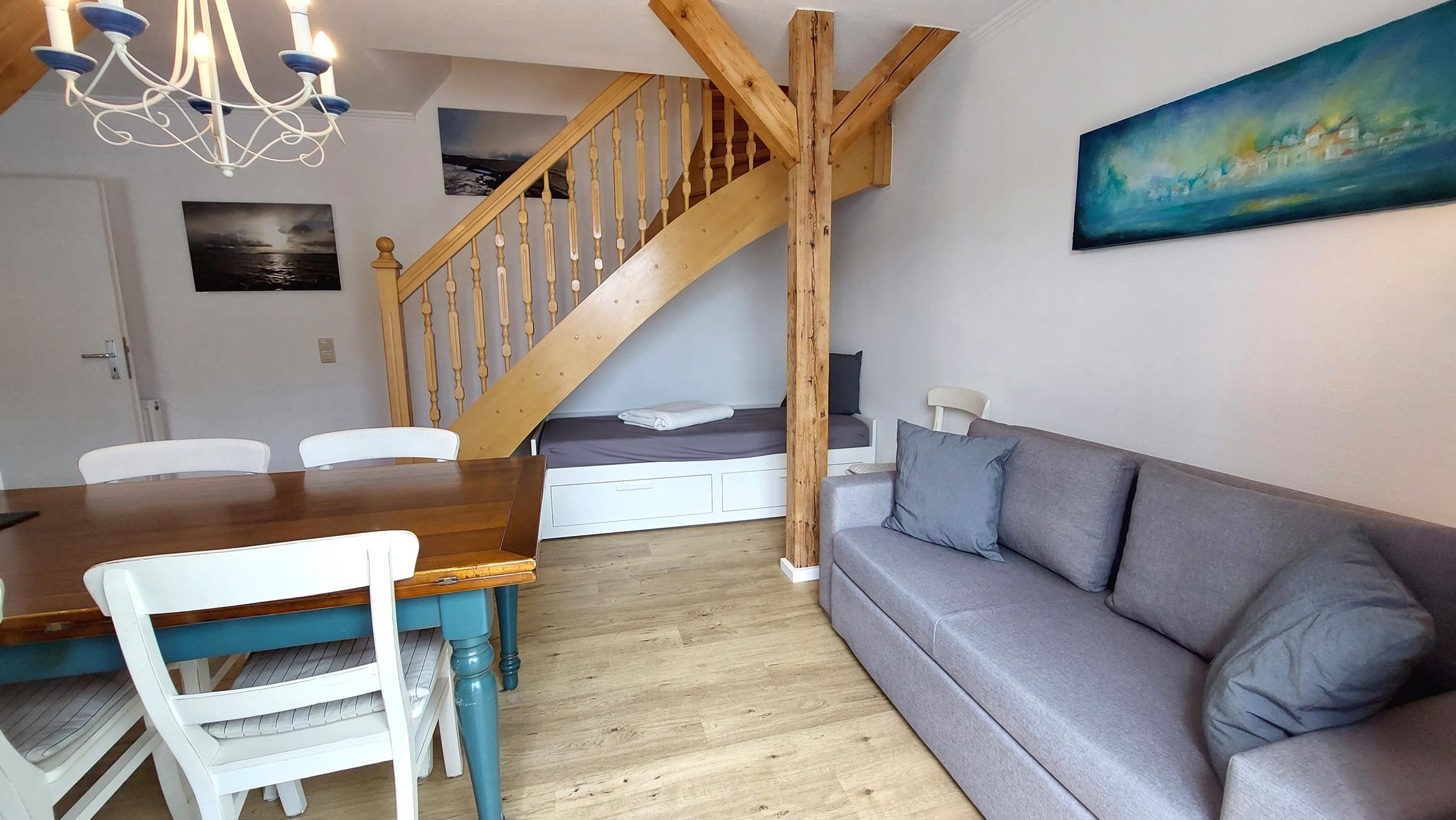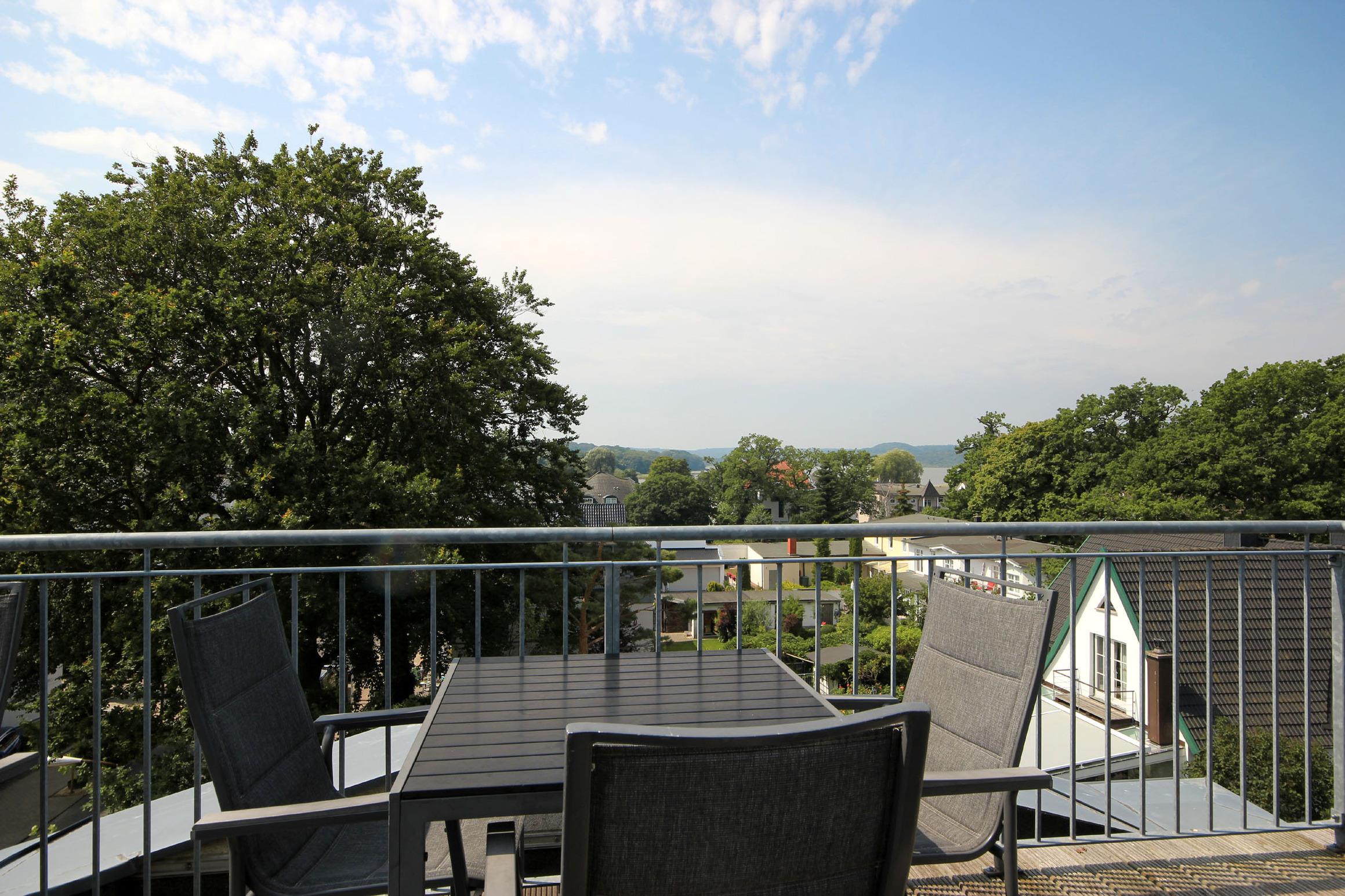 Ihre moderne Maisonette-Wohnung 26RB12 - Silbermöwe hat eine Größe von ca. 67 qm und ist für 5 Personen eingerichtet. Das 3-Raum-Appartement befindet sich im 2. und 3. Obergeschoss und verfügt über eine große Dachterrasse mit Blick über die Dächer von Binz sowie einen Balkon der zu einem sonnigen Frühstück einlädt. Im 2. Obergeschoss befindet sich der gemütliche Wohnraum mit angrenzender Wohnküche, das Bad sowie ein Schlafzimmer mit Doppelstockbett und Kleiderschrank. Der Wohnbereich verfügt über ein Sofa, einen Fernseher sowie Stereo-Anlage. Eine weitere vollwertige Schlafgelegenheit befindet sich in der Nische unter der Treppe. Die Küchenzeile ist komplett ausgestattet mit Geschirrspüler, Backofen, Ceranfeld, Kühlschrank, Kaffeemaschine, Wasserkocher und Toaster. Das schöne Duschbad verfügt über einen großen Waschtisch, WC sowie eigene Waschmaschine und Trockner. Über die Holztreppe gelangen Sie in das 3. Obergeschoss direkt in das geräumige Schlafzimmer. Hier finden Sie ein Doppelbett, Sitzmöglichkeiten, einen zusätzlichen Fernseher sowie den Zugang zur Dachterrasse. Für die bequeme Erreichbarkeit ist ein Aufzug im Haus vorhanden. Ein Stellplatz steht Ihnen im nahe gelegenen Parkhaus zur Verfügung. Unseren Gästen steht ein kostenfreier W-Lan Zugang zur Verfügung.