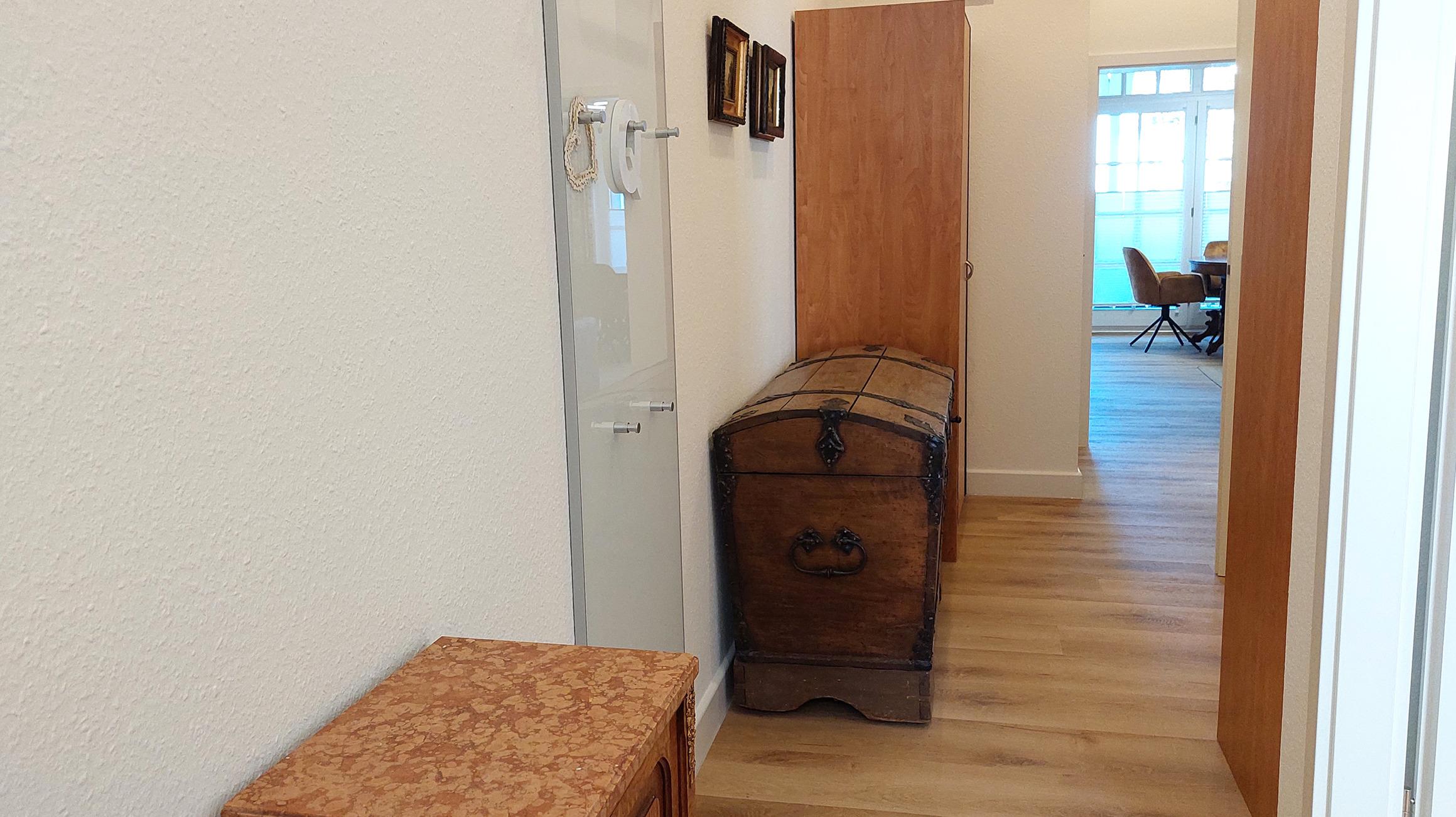 Der Flurbereich bietet ausreichend Stauraum im Kleiderschrank und der kleinen Abstellkammer. Von dort haben Sie Zugang zum Wohnzimmer, Bad, Schlafzimmer und zur separaten Küche.