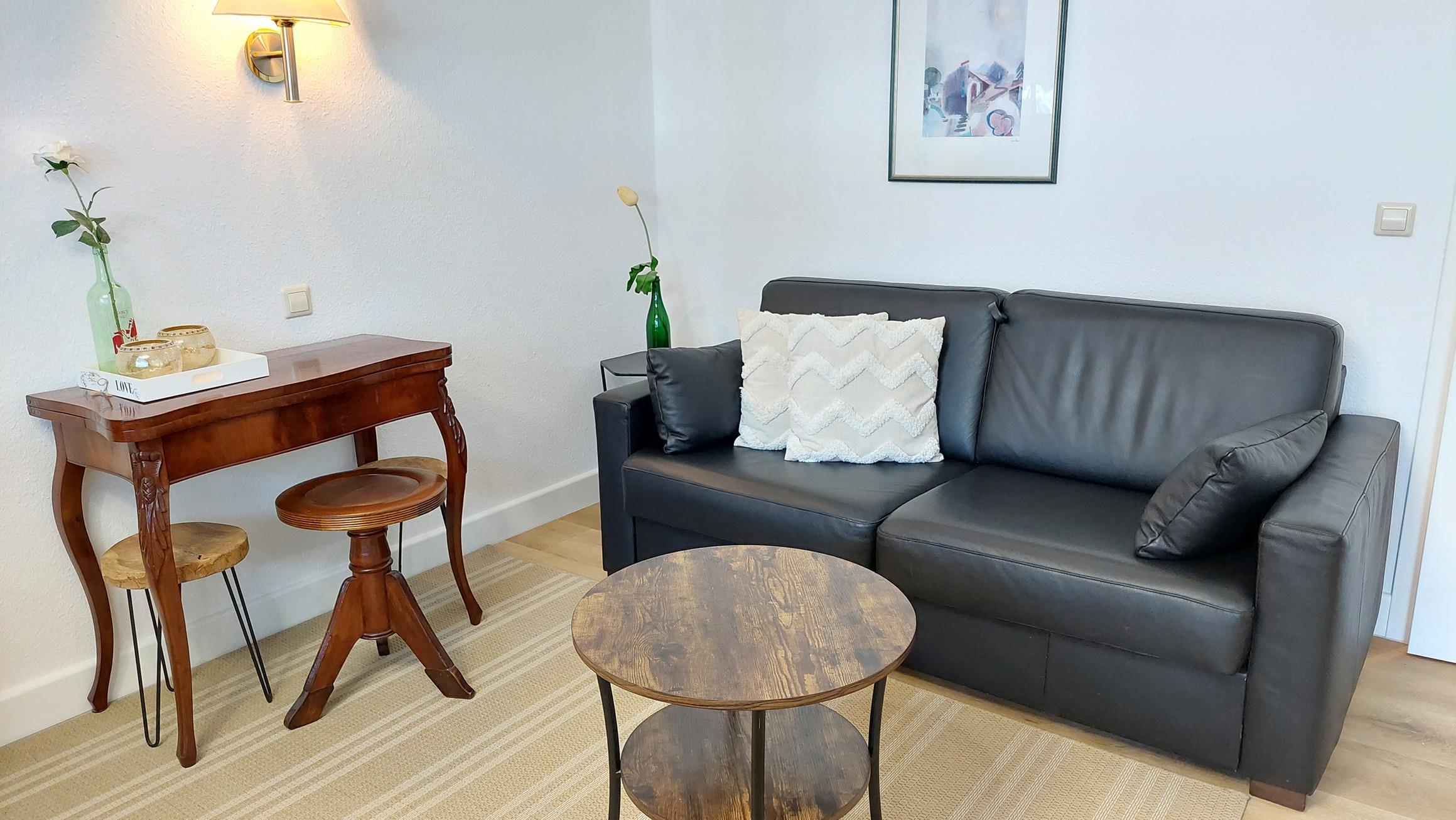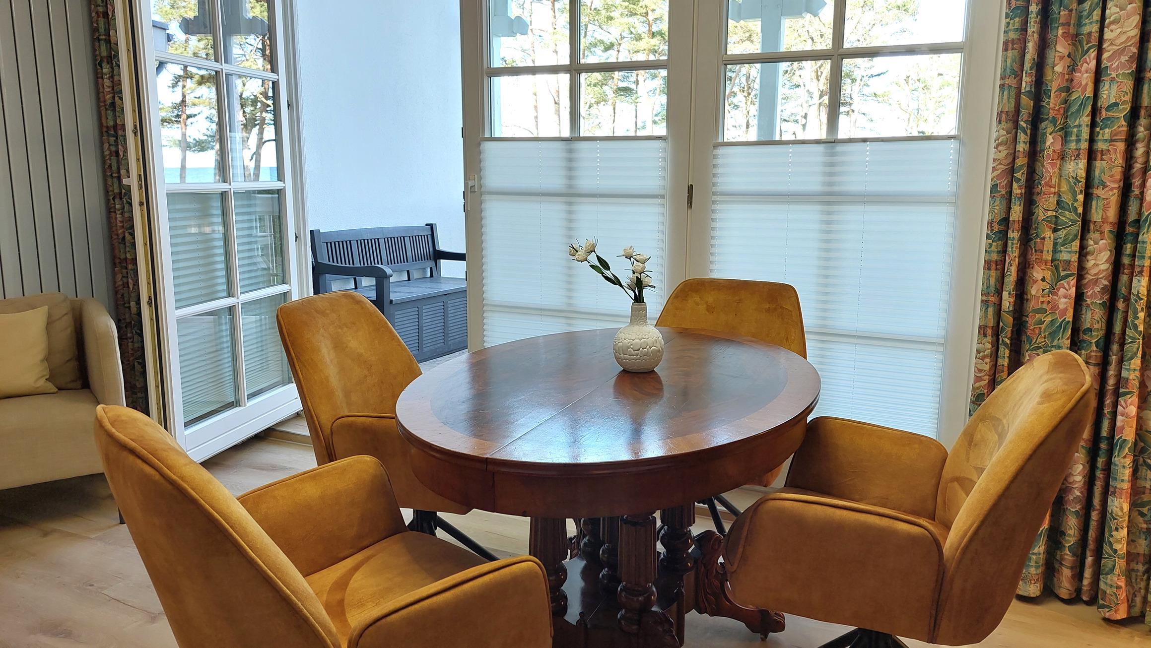Das Wohnzimmer verfügt über einen hochwertigen Essbereich, 2 Sessel, Smart-TV und ein gemütliches Sofa (mit Schlaffunktion für 2 weitere Personen).