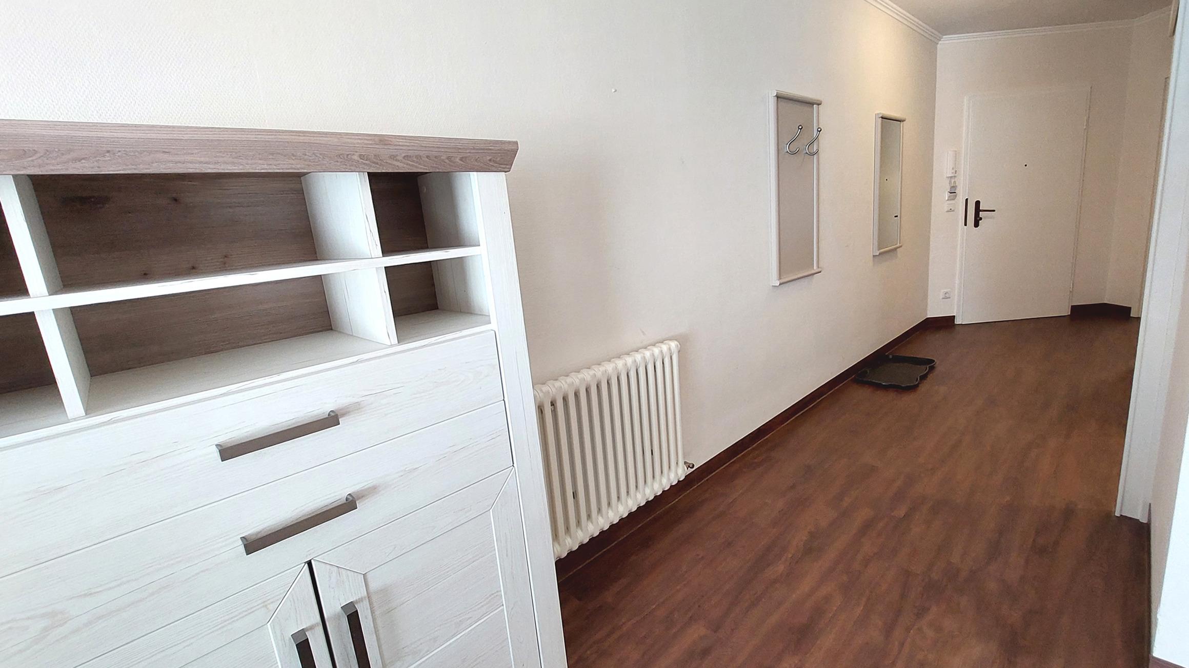 Der Flur führt zu den einzelnen Räumen, darunter das Schlafzimmer, das Badezimmer und den großen, hellen Wohnbereich.