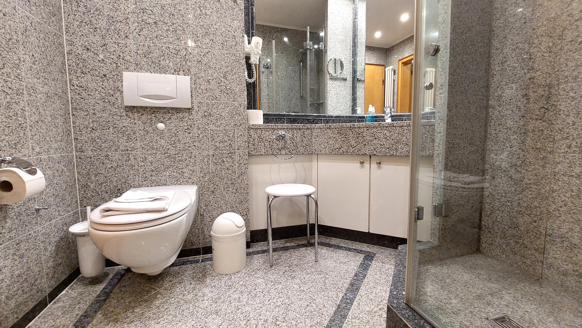 Der Eingangsbereich führt ins Badezimmer und in den großen und hellen Wohnbereich. Das Badezimmer ist in Marmoroptik gehalten und verfügt über eine Toilette, Waschtisch, Dusche, Kosmetikspiegel und Fön.