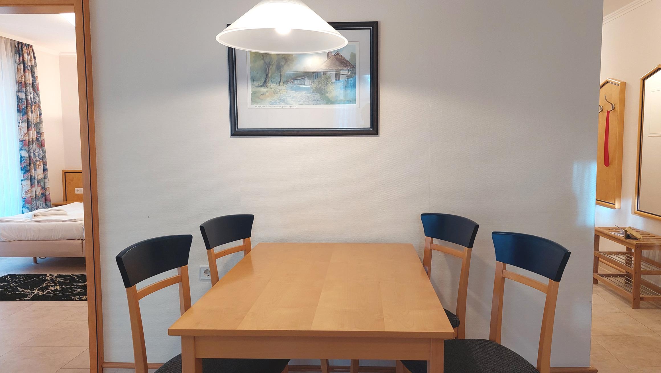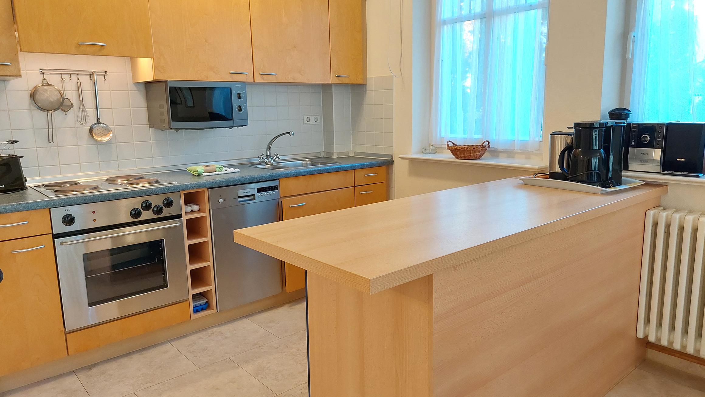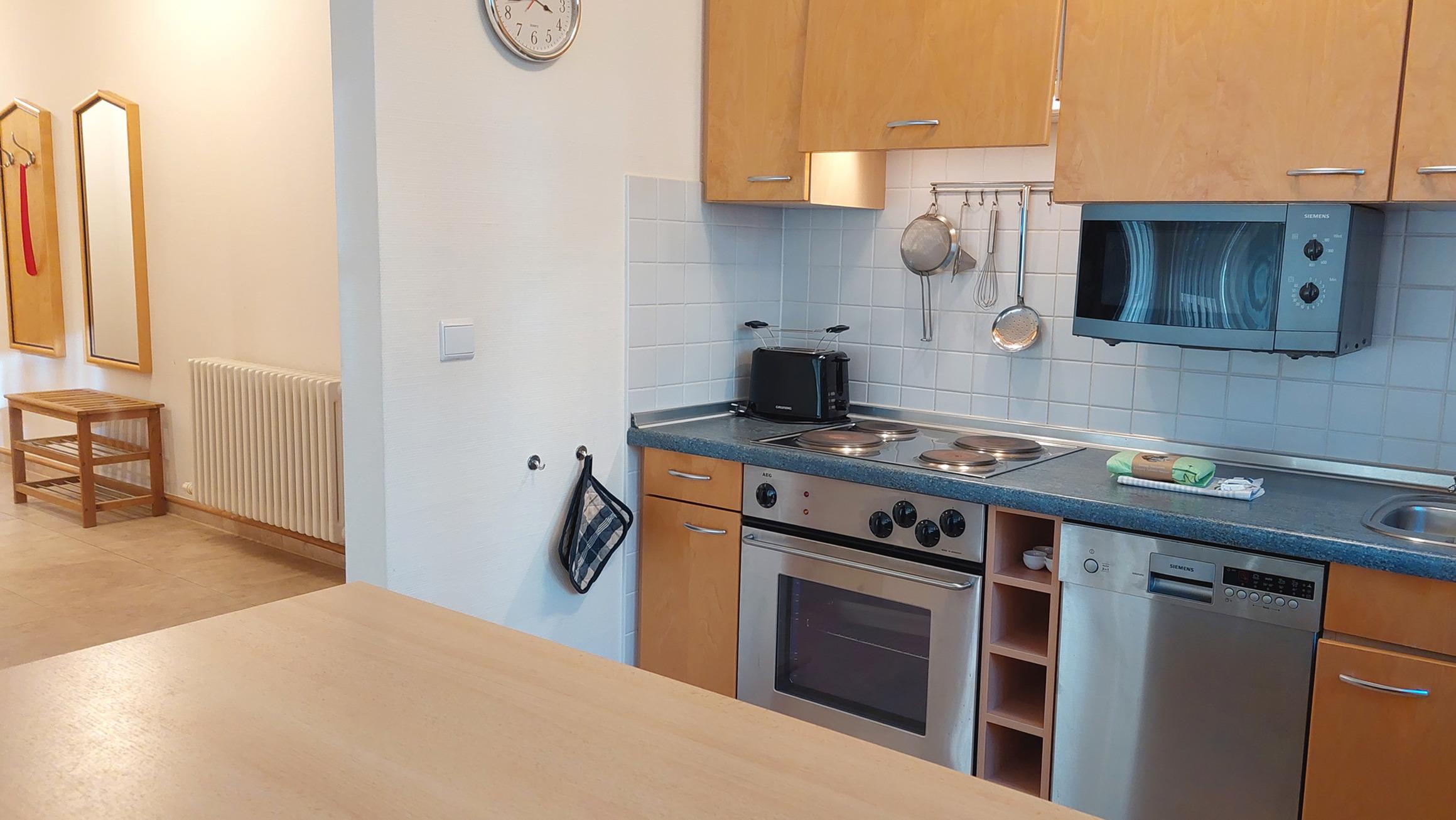 Im Wohn- und Essbereich befindet sich eine moderne Küchenzeile mit Backofen, 4 Kochfelder, Geschirrspüler, Kühlschrank mit Gefrierfach, Mikrowelle und verschiedenen Küchenutensilien. Eine Essecke für 4 Personen und eine gemütliche Sitzlandschaft laden zum Verweilen ein. Zur technischen Ausstattung gehören kostenfreies WLAN, ein Smart-TV und eine kleine Musikanlage.