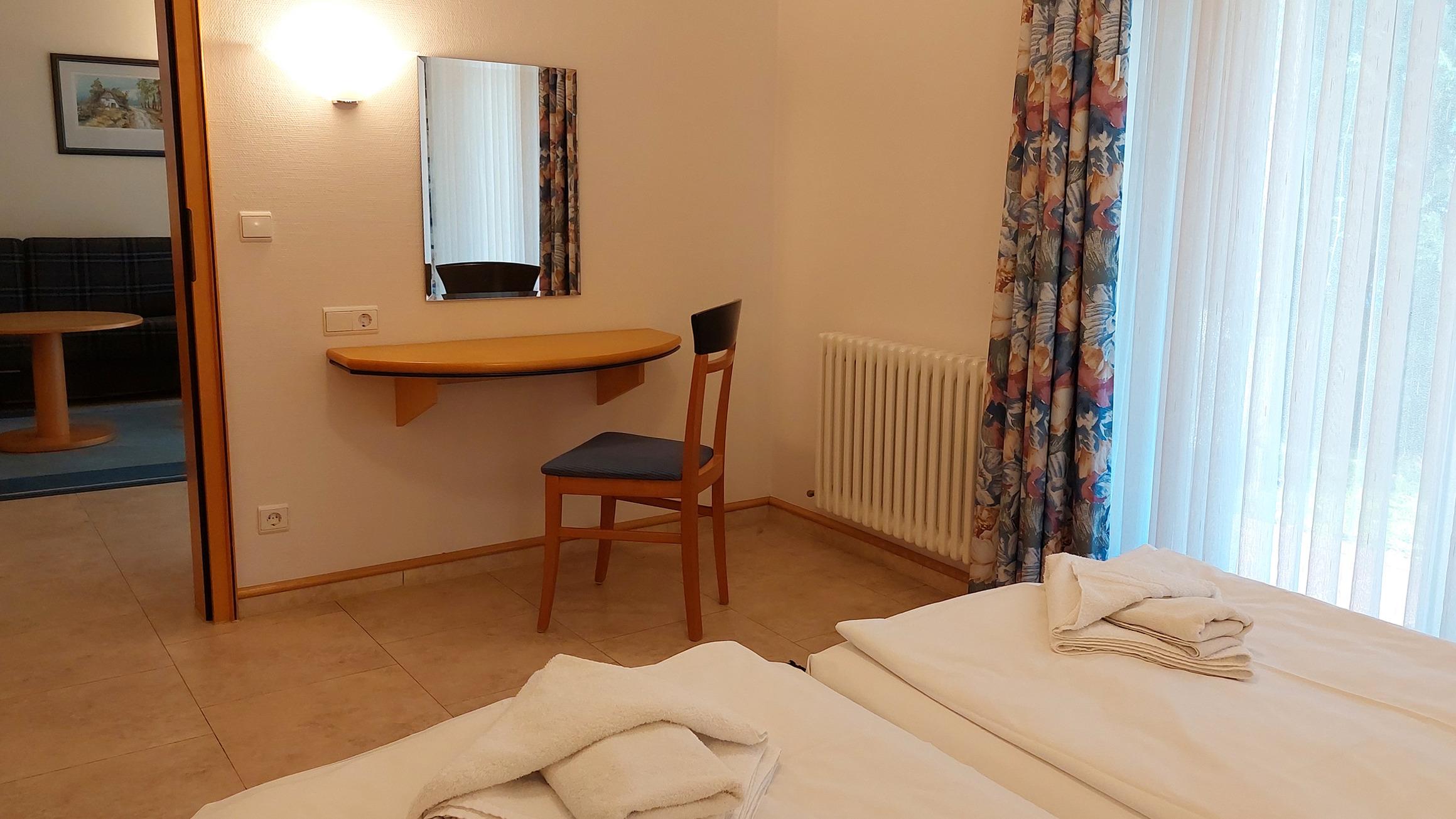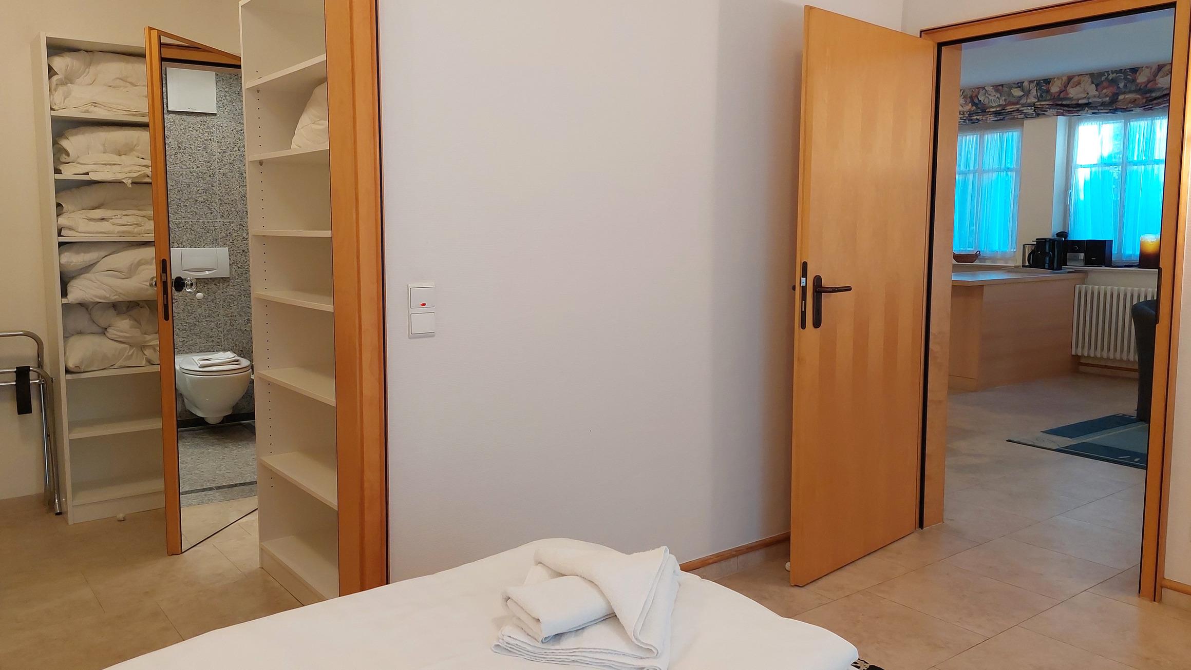 Vom Wohnbereich aus gelangen Sie zum Schlafzimmer mit Doppelbett und Schminktisch. Angrenzend befindet sich ein Ankleidezimmer mit viel Stauraum und direktem Zugang zum Bad.