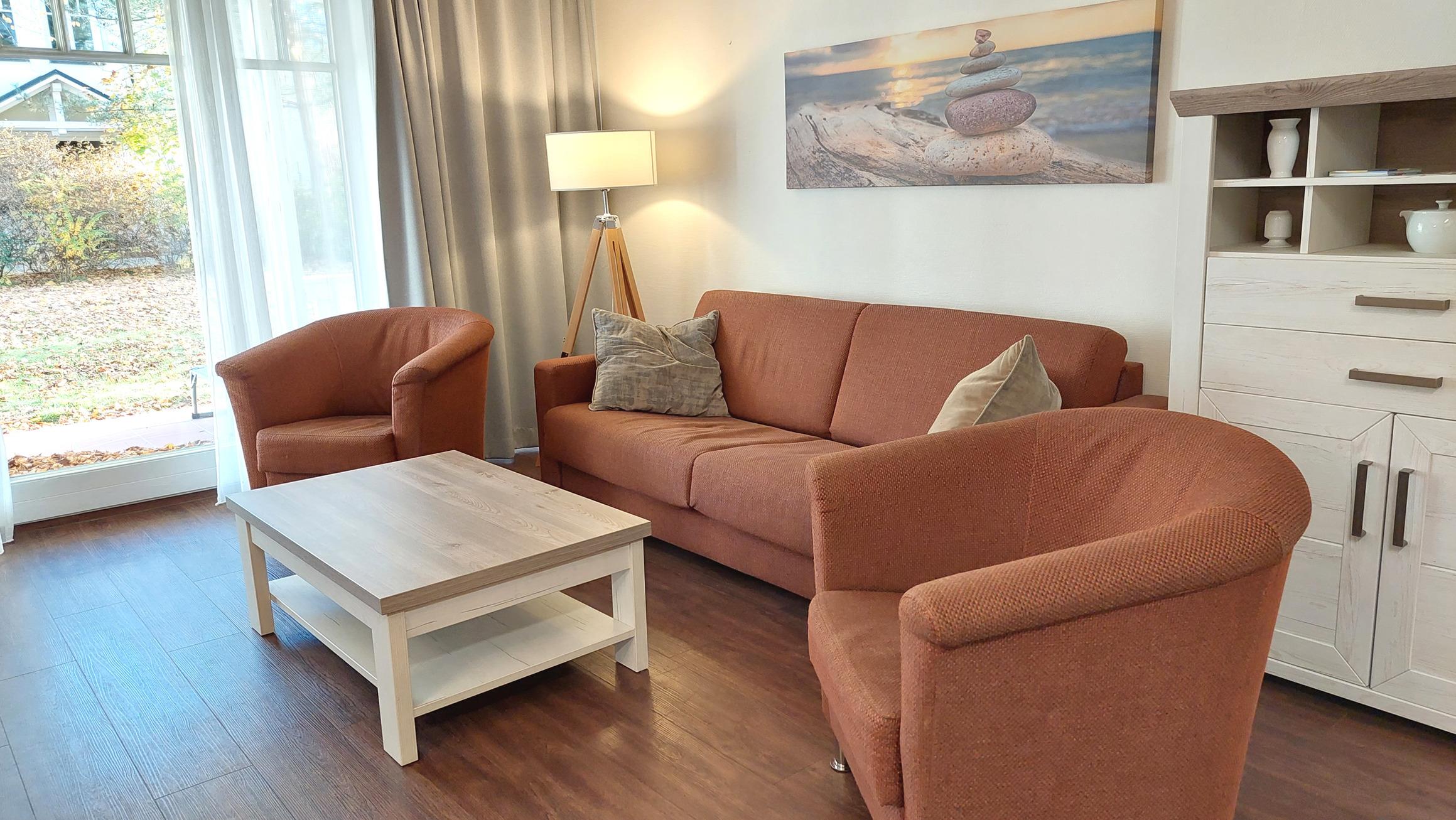 Der Wohn- und Essbereich beherbergt eine moderne Küchenzeile mit Ceran-Kochfeldern, einem Geschirrspüler, einem Kühlschrank mit Gefrierfach, einer Mikrowelle und verschiedenen Küchenutensilien. Der Essbereich bietet Platz für 4 Personen und eine gemütliche Sitzlandschaft lädt zum Verweilen ein. Zur technischen Ausstattung gehören kostenfreies WLAN, ein Smart-TV samt Blu-ray-Player und eine kleine Musikanlage.