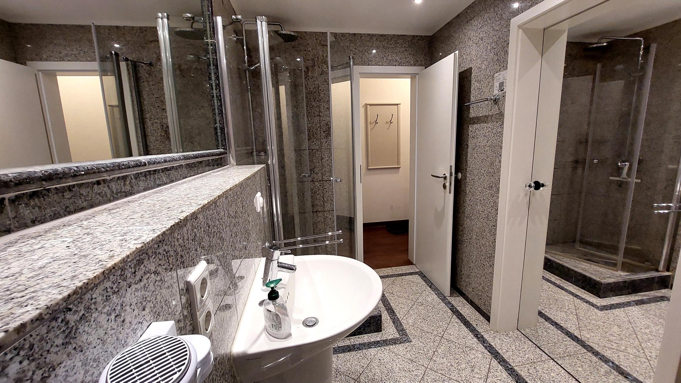 Das Badezimmer ist in Marmoroptik gehalten und verfügt über eine Toilette, einen Waschtisch, eine Dusche, einen Kosmetikspiegel, Fön und Zugang zum Ankleidezimmer mit viel Stauraum.